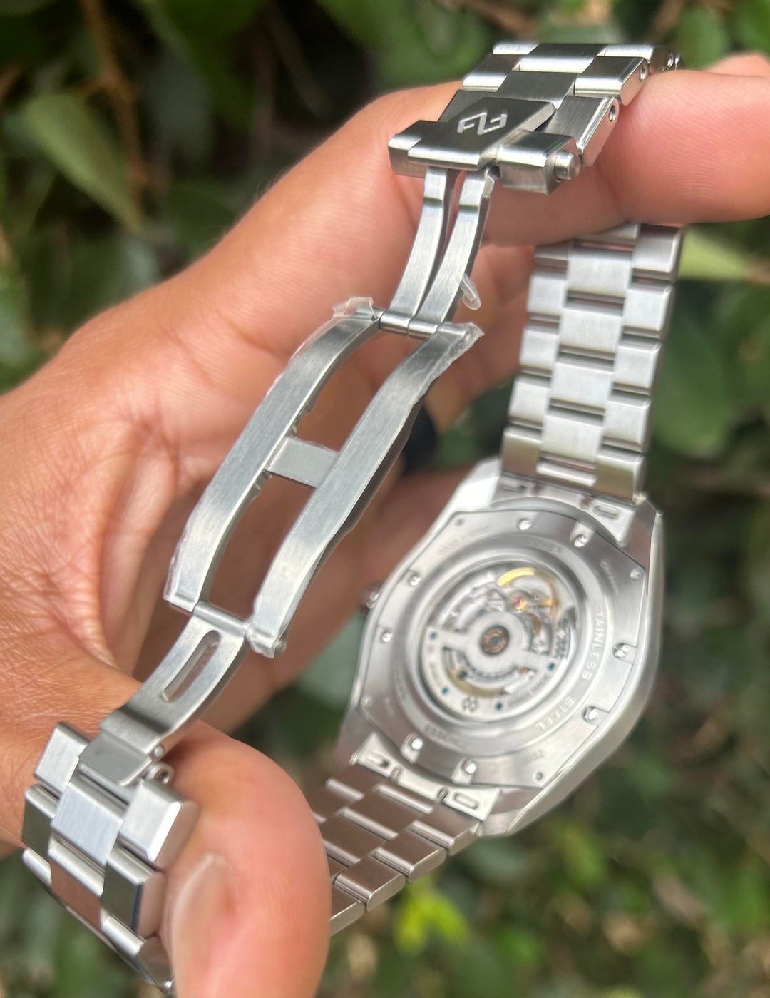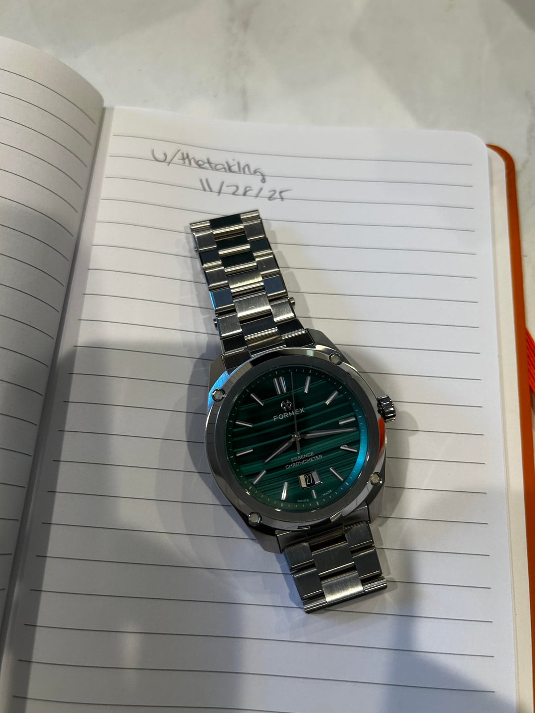 Formex Essence 43 with the malachite dial — full kit. If you’ve never seen this dial in person, it’s one of the best stone dials in the entire price range. Deep green striations, natural variation, and that glossy shimmer that shifts in different lighting… it looks way more expensive than it has any right to. Photos don’t do it justice. The watch is in very good condition overall, runs flawlessly with the COSC-certified movement, and comes as a complete set. Integrated bracelet feels fantastic on the wrist and makes this an easy daily even at 43mm. Asking $1,400 shipped CONUS.