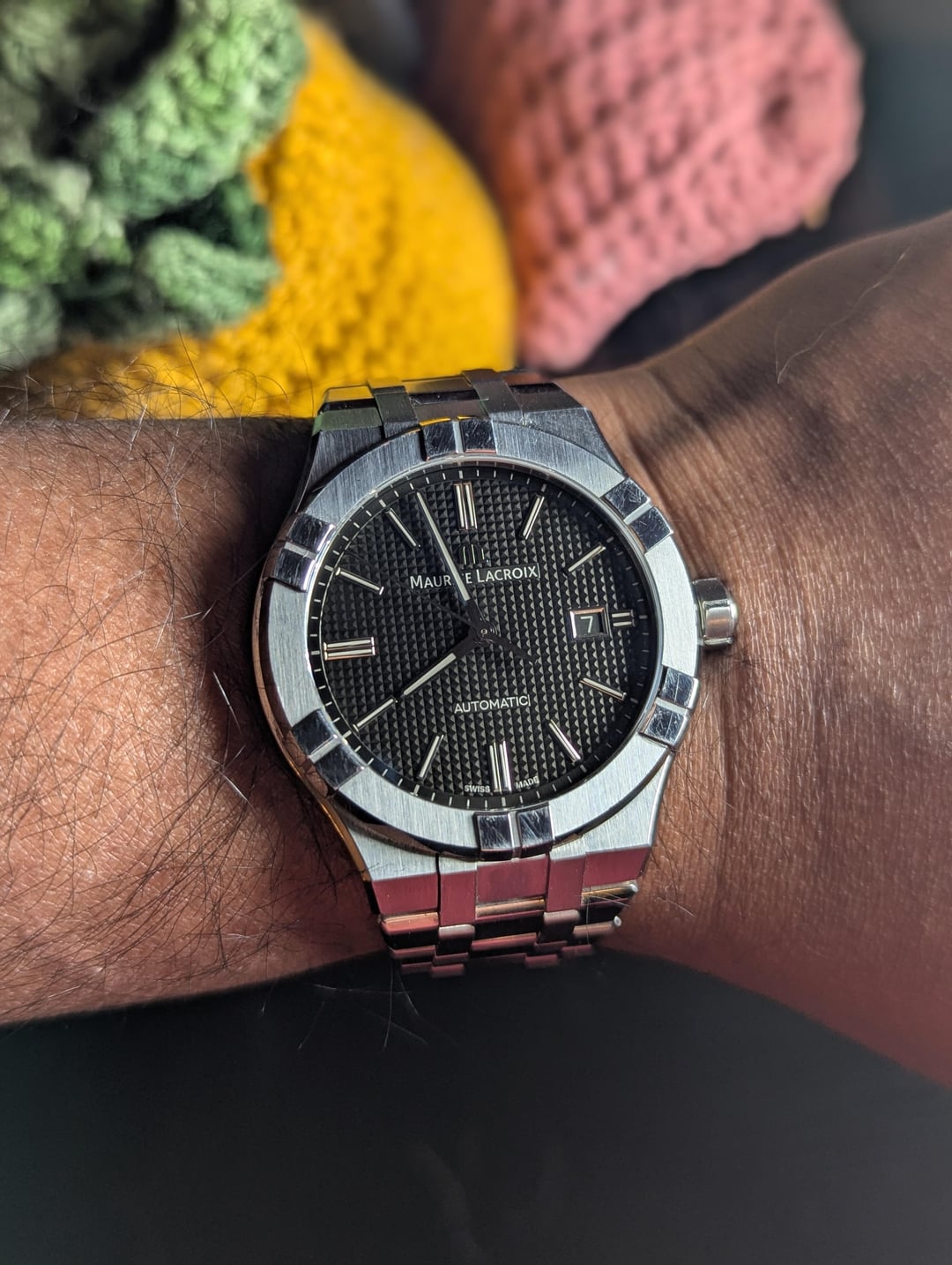 Hi all! Up for sale is this **Maurice LaCroix Aikon 42mm - Black Dial** **Comes with Extra Leather+Sailcloth Hybrid and Rubber Straps** **For a straight sale, pricing it at a very competitive $950! (Retail $2400+)** Link to product: https://www.mauricelacroix.com/us_en/watches/watches-aikon/watches-aikon-automatic/aikon-automatic-date-42mm/AI6008-SS002-330-1.html The watch is in **excellent condition with no major dings or scratches**. There are some minor swirls which will be visible on the polished areas under certain angles. Pictures have been taken under direct white light to highlight all markings. In natural light on wrist, many of the swirls are not visible. **Keeps time well within the specification** **Comes in the beautiful "piano wood" box and outer cardboard box** **Please refer to pics for condition and kit** Happy to answer questions!
