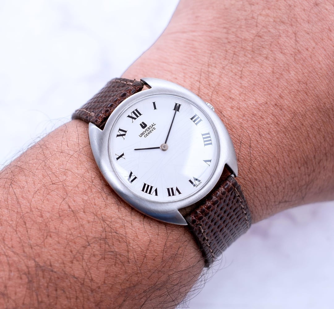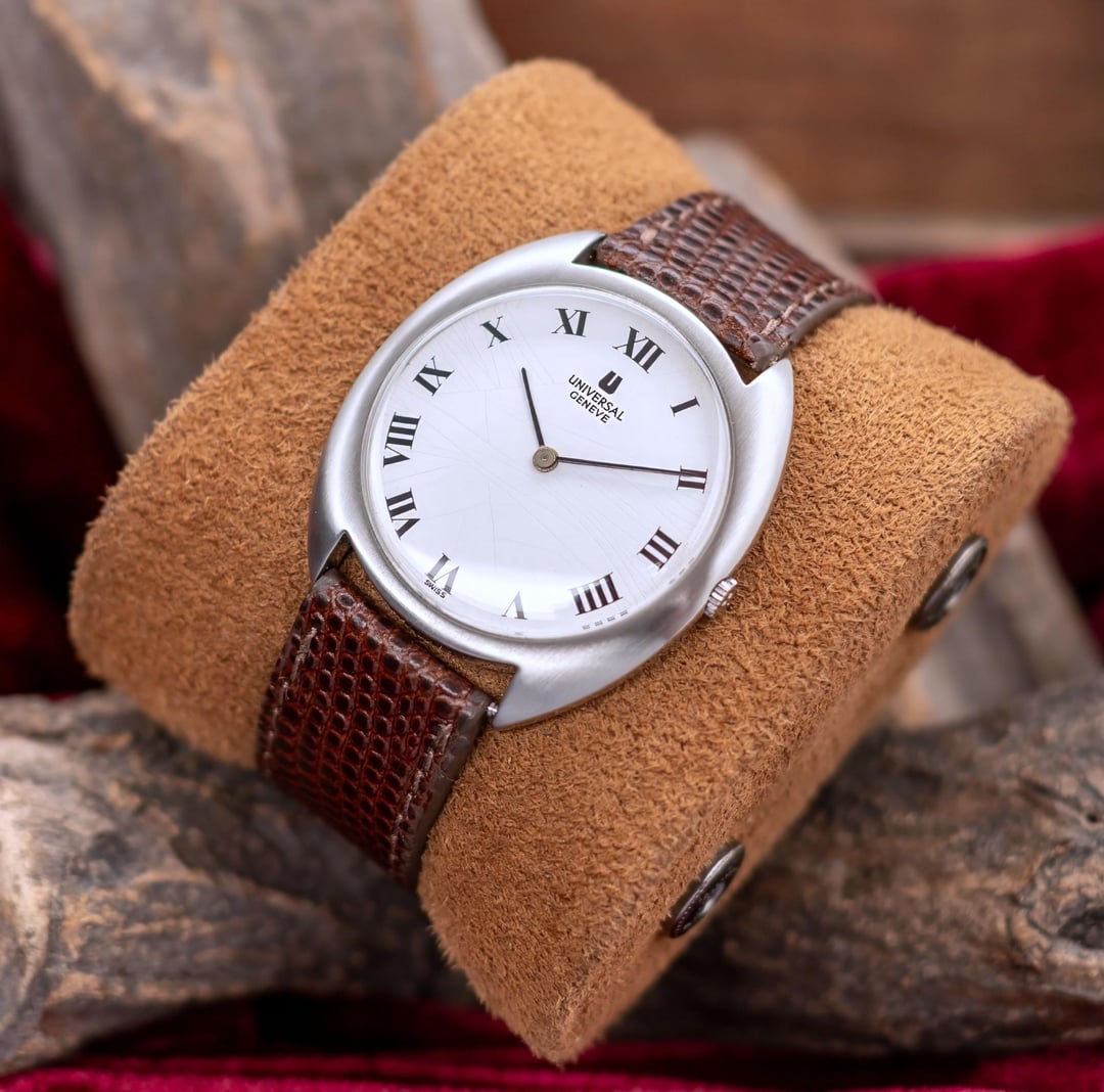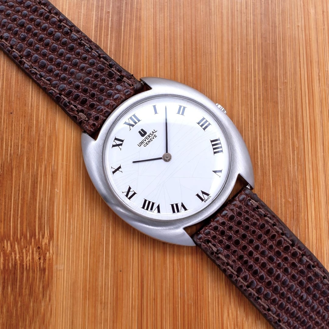 A rare Universal Genève vintage watch in great condition. It has a stunning White dial with roman numerals. The numerals are perfectly placed without any lume markers, makes it look very clean. The dial has developed an attractive patina with fine crack patterns, often referred to as a ‘spider dial,’ adding character and vintage charm. Classic dress watch piece. Very well built robust slim case. Signed crown. Movement has been serviced. Great time keeping. Good condition, ready to be used as a daily driver. Comes with an aftermarket leather strap, unsigned buckle. Case is professionally polished keeping all the sharp lines, edges and mirror finishing. Such pieces should be appreciated upfront to experience at full measure, Pictures don't do justice to this beauty. Great collectible. Universal Genève is known to produce watches as classic as this, simple time only minimalistic clean dial yet sophisticated and complex high end movements. This example is a wonderful example of classic watch design. It is a design language that goes through centuries and yet appreciated. PRICE: $499 USD via Paypal, Wise, Crypto. FREE DHL 5 day shipping worldwide. Considering a full service has been done to the watch, I'm asking a reasonable price. I have a good number of exchanges here for a safe transaction. Check my Instagram: [https://instagram.com/hour.lust](https://instagram.com/hour.lust) * Reference: 842111 * Case size: 35 mm (without crown) * Lug to Lug size: 38 mm * Case thickness: 8 mm * Manual winding movement PICS: [https://imgur.com/a/MU6KoGz](https://imgur.com/a/MU6KoGz) TS: [https://imgur.com/a/Xpjz389](https://imgur.com/a/Xpjz389)