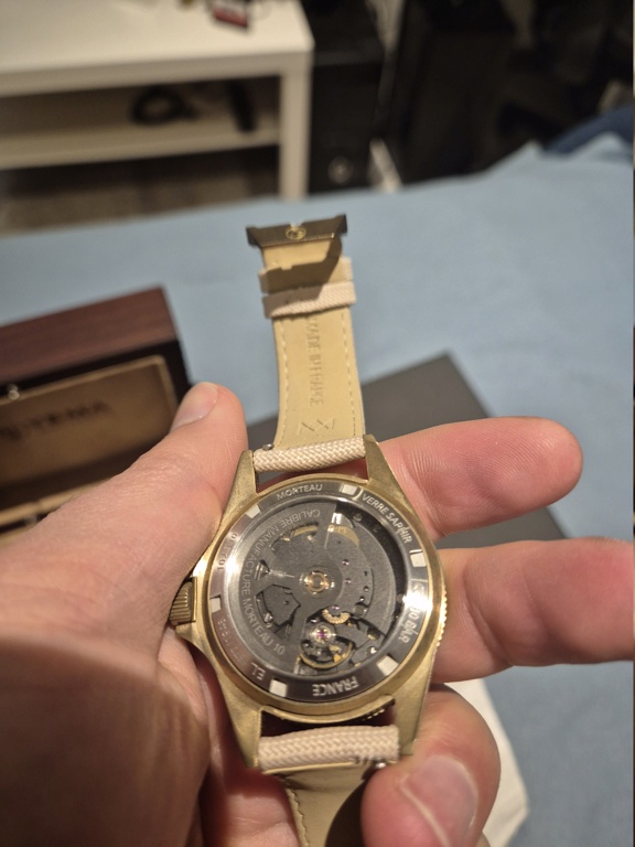 La particularité de cette version en bronze réside évidemment dans son évolution naturelle :le boîtier commence à développer une patine authentique, unique à chaque propriétaire.