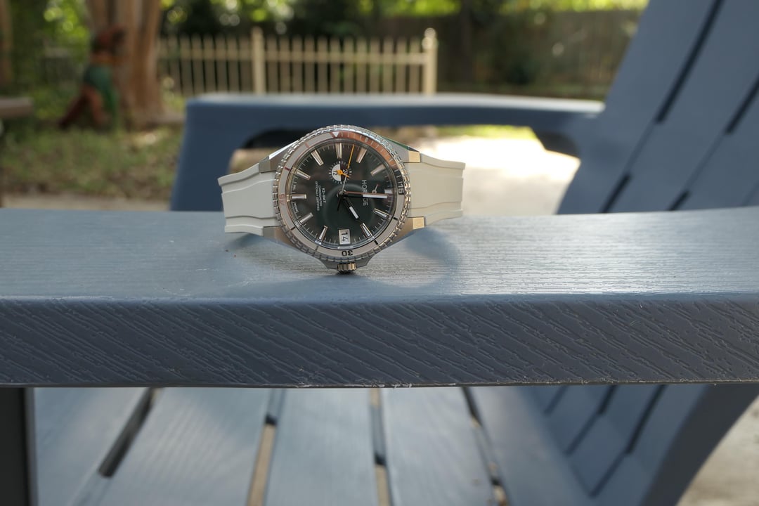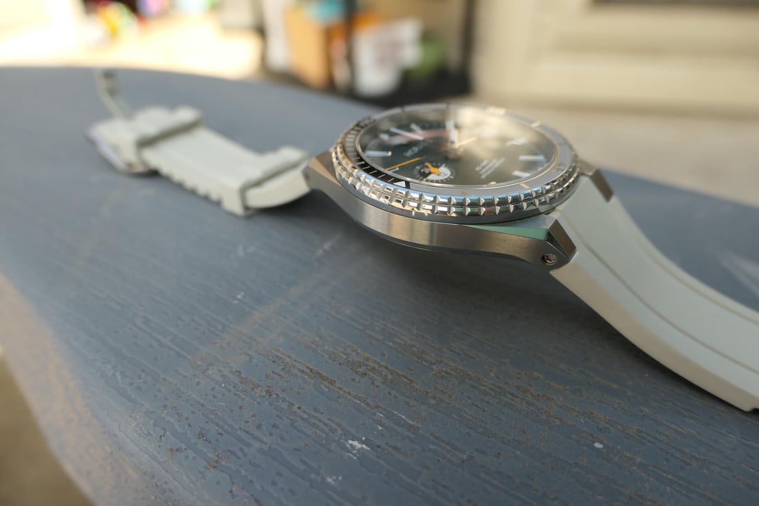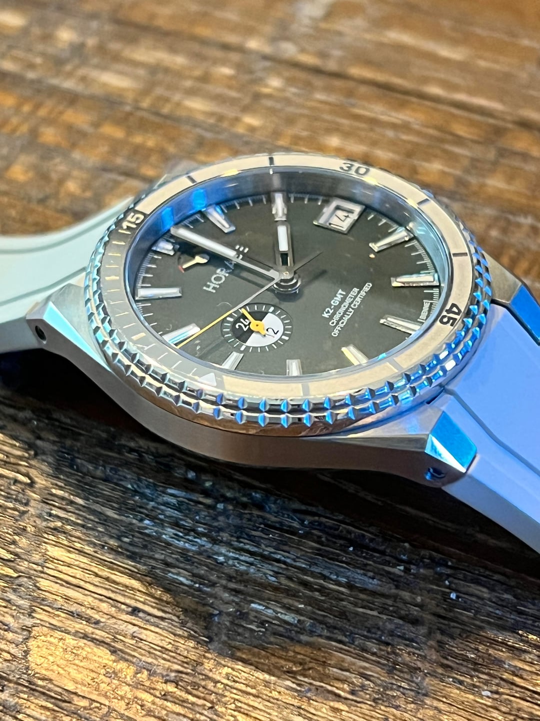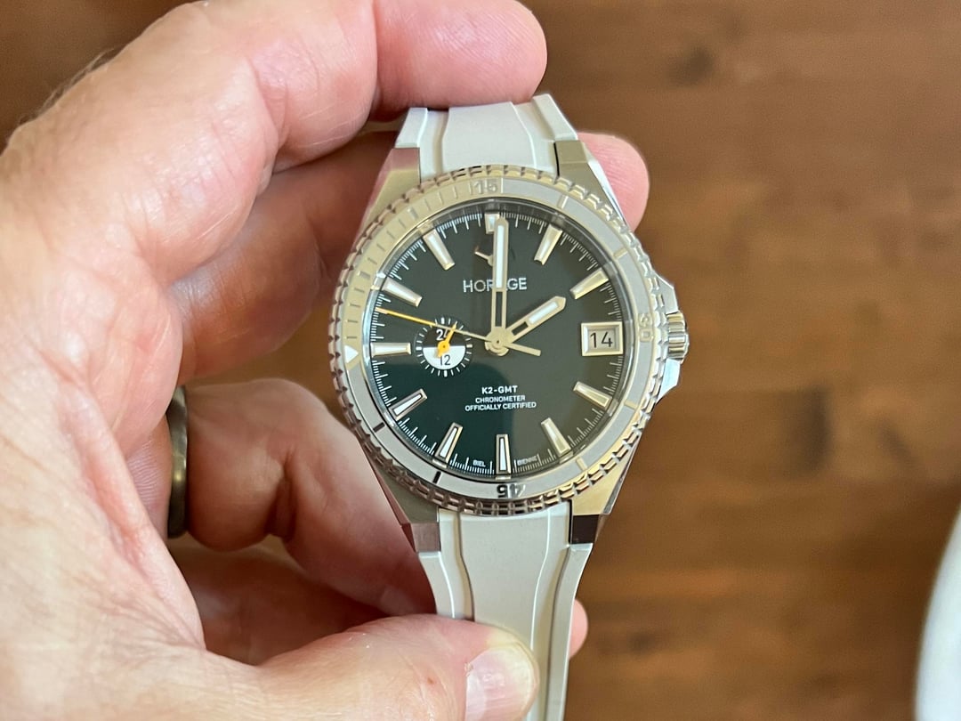 Up for sale is my Horage Supersede GMT, matte green dial, upgraded platinum micro rotor on grey rubber strap (brushed bracelet with extra links included, along with strap changing tool) dated July 2023. A LOT of function for the money! GMT, rotating bezel, 12-24 hour indicator, power reserve indicator (72 hour power reserve!), GMT "shadow" hand, jumping date, with 200M water resistance in 904L steel. Power packed for sure! Purchased from original owner, this one has seen some action! Not mint by any metric, some scuffs and small dings, most pronounced at the 1 o’clock lug. The case shape/angles are very cool, however lend themselves to scratches and flea bites. Nothing too dramatic IMO, happy to send more detailed pics. Bracelet has light scratches on the clasp but the rest looks great. Keeps excellent time, all functions work as designed. Full kit. **Asking $4300.00 OBRO** **TIMESTAMP:** [https://imgur.com/a/gEElzAL](https://imgur.com/a/gEElzAL) Shipped CONUS only - wire or Zelle preferred - may accept additional payment methods from members with positive feedback. No trades at this time, thanks. Several transactions on here and other forums. Feel free to reach out with questions, requests for more pics. Always happy to video or phone call. Thanks for looking!