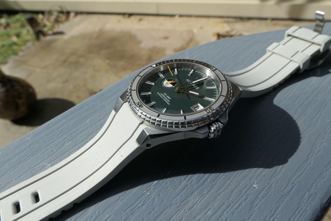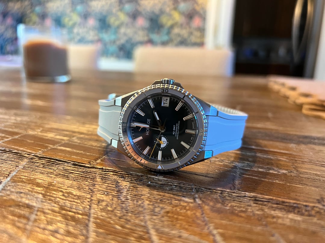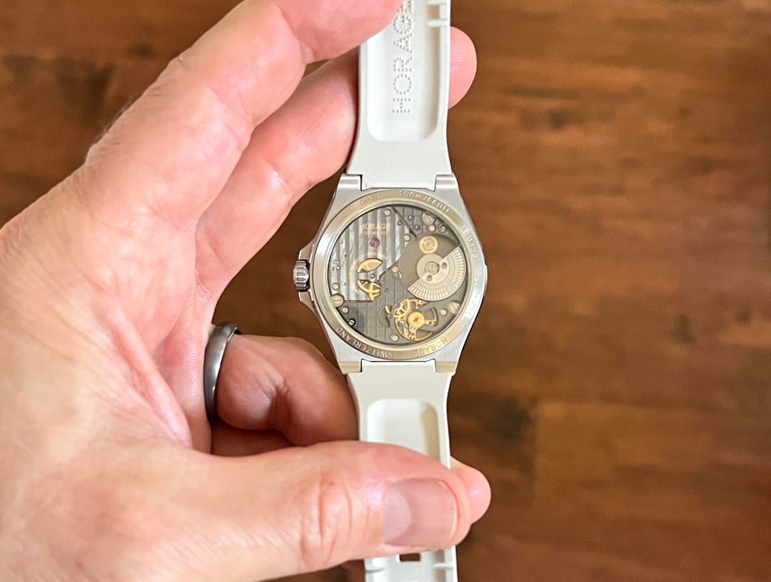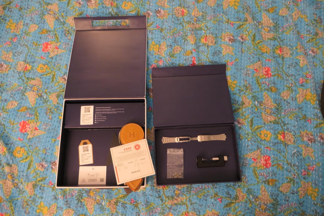 Up for sale is my Horage Supersede GMT, matte green dial, upgraded platinum micro rotor on grey rubber strap (brushed bracelet with extra links included, along with strap changing tool) dated July 2023. A LOT of function for the money! GMT, rotating bezel, 12-24 hour indicator, power reserve indicator (72 hour power reserve!), GMT "shadow" hand, jumping date, with 200M water resistance in 904L steel. Power packed for sure! Purchased from original owner, this one has seen some action! Not mint by any metric, some scuffs and small dings, most pronounced at the 1 o’clock lug. The case shape/angles are very cool, however lend themselves to scratches and flea bites. Nothing too dramatic IMO, happy to send more detailed pics. Bracelet has light scratches on the clasp but the rest looks great. Keeps excellent time, all functions work as designed. Full kit. **Asking $4300.00 OBRO** **TIMESTAMP:** [https://imgur.com/a/gEElzAL](https://imgur.com/a/gEElzAL) Shipped CONUS only - wire or Zelle preferred - may accept additional payment methods from members with positive feedback. No trades at this time, thanks. Several transactions on here and other forums. Feel free to reach out with questions, requests for more pics. Always happy to video or phone call. Thanks for looking!