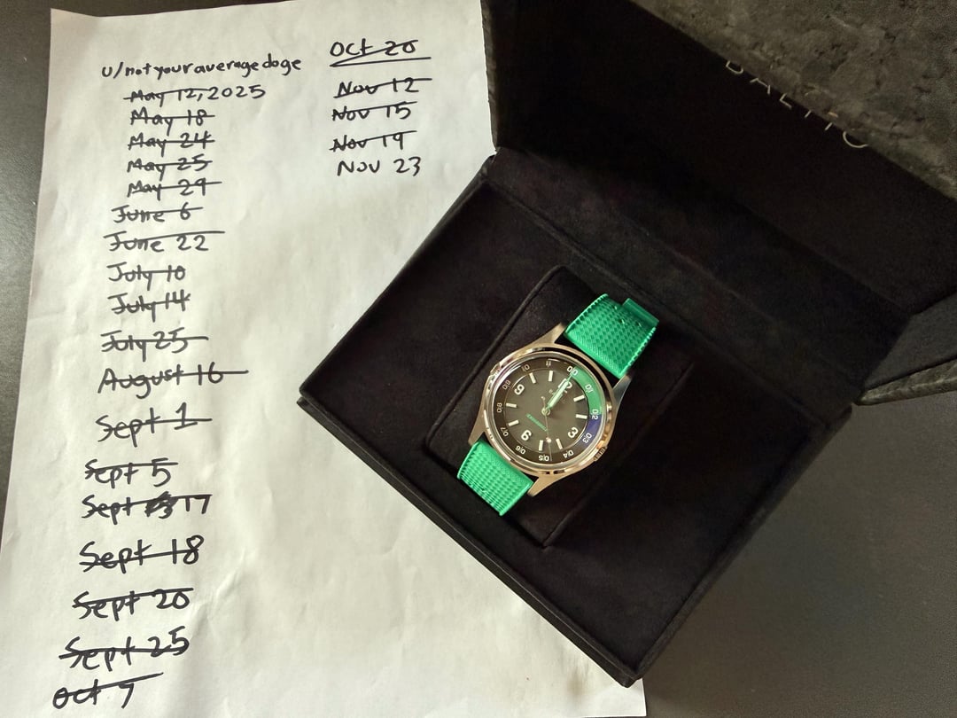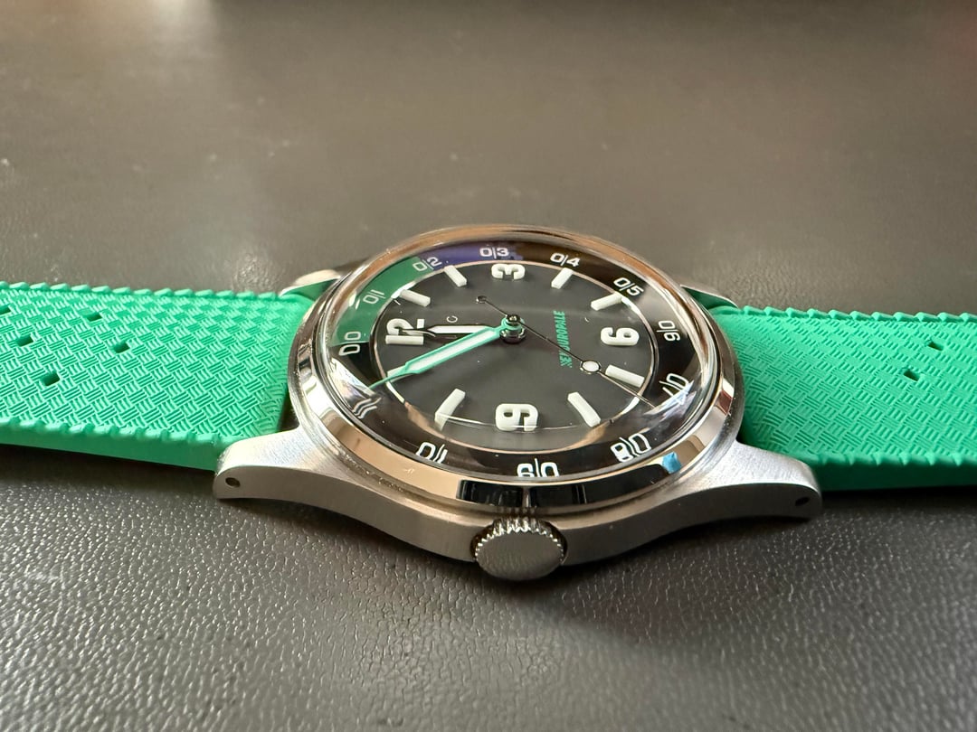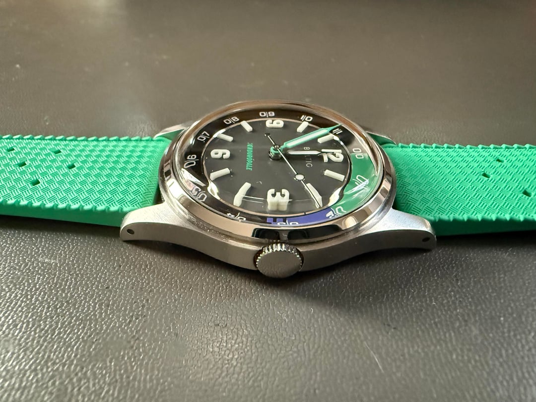 For sale is a Baltic Hermetique Dual Time Enduropale. This is a limited edition of 200 pieces. The crown on the left is used to rotate the internal bezel. The indices and hour markers use 3D lume blocks which make for a very intense lume at night. 37mm diameter, 20mm lug width, 46mm lug-to-lug lenth. Comes with the full kit, including box, warranty card dated February 2025, and original green rubber strap and buckle. Condition: Of note is that there are faint scratches at two upper lugs, which are not very noticeable when wearing. Other than that, the watch may have fine hairline scratches but is in overall excellent condition. The dial and sapphire glass crystal are free from imperfections (the photos show specks of dust, happy to provide more photos or video chat if needed). Looking to get **$750 shipped** to anywhere in the USA. Prefer payment via Paypal F&F (+3% for G&S), Zelle, or Venmo. Please let me know if you have any questions! Timestamp is in the last photo.