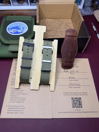 Full kit. some desk rash on the clasp, bottom of the lugs and case. References in several places, willing to facetime or send video. |Case|Brushed 316L stainless steel, 39mm diameter, 20mm lugs, 46.5mm lug to lug, 12.35mm thick| |:-|:-| |Movement|Miyota 82S5 automatic with hacking and hand-winding| |Water resistance|100m| |Crystal|Flat sapphire with inner and outer AR coating| |Straps|Genuine leather single pass bund strap, nylon single pass strap|