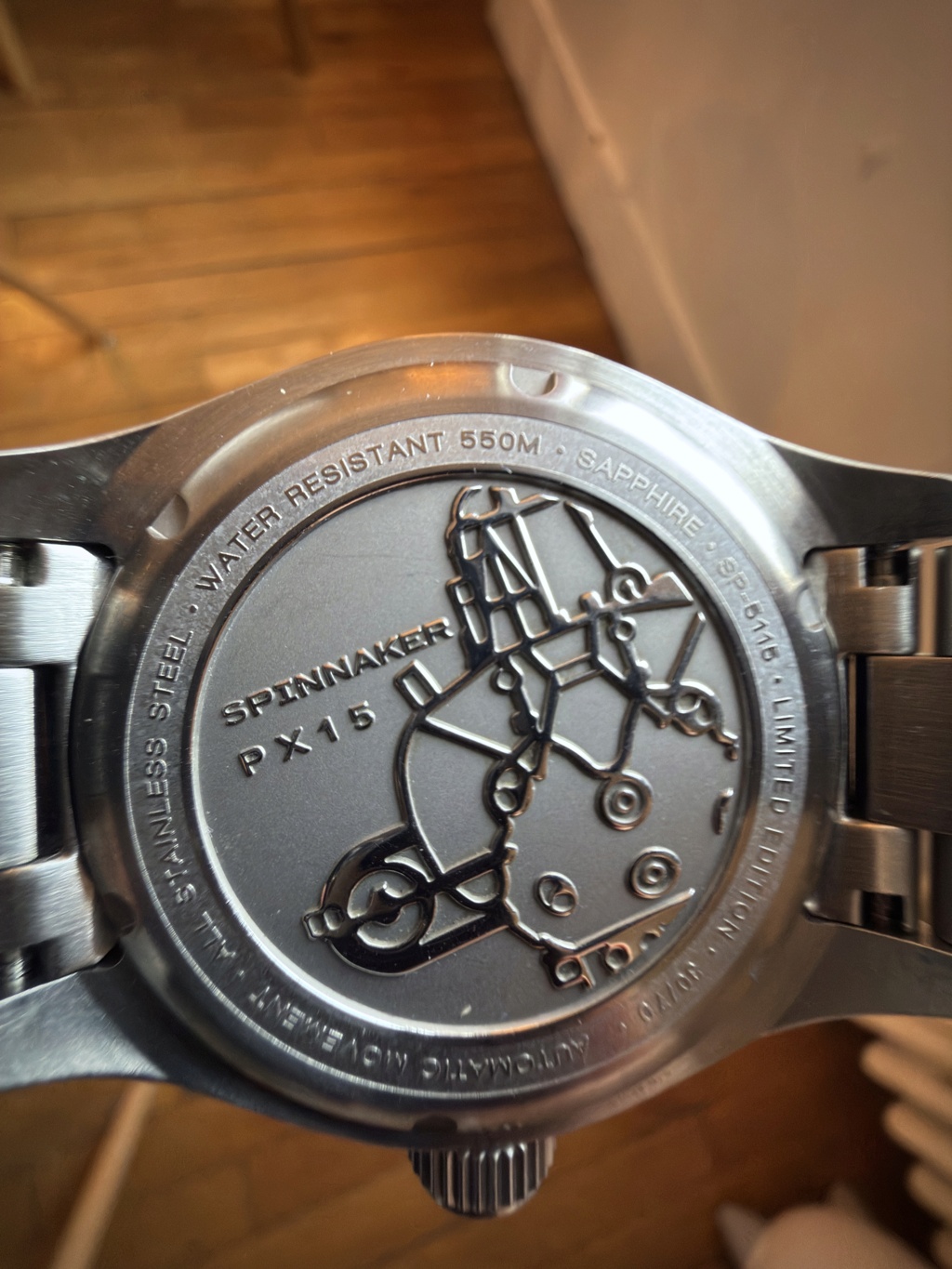 Fond de boîte plein et vissé sur lequel on retrouve en relief le PX-15, sous-marin construit par Jacques Piccard en 1968 (d’où son nom)