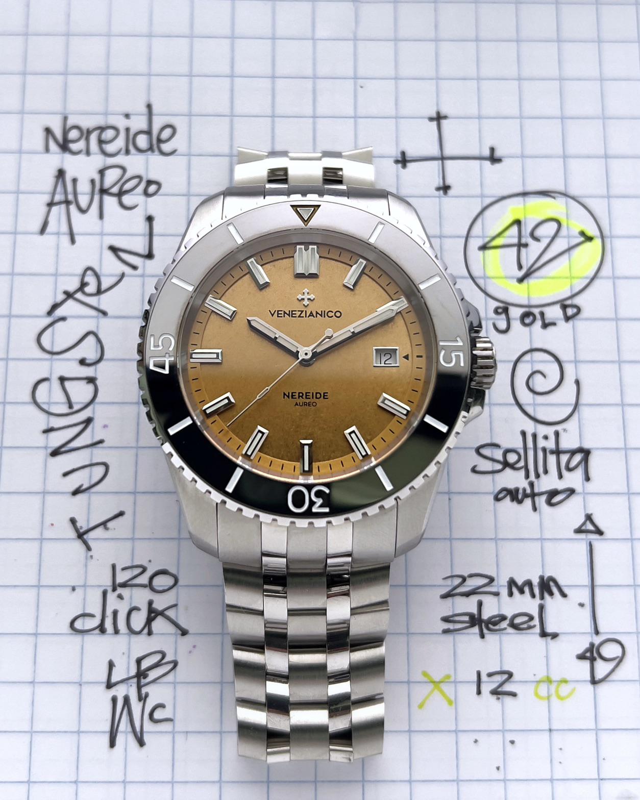 Venezianico Nereide Aureo - 4521590S A sports luxury watch inspired by Venetian craftsmanship and architecture: 24k gold treatment and a rippled finished dial, 316L stainless steel case, paired with a tungsten bezel, and a micro-adjustable clasp. This one has light wear and was mostly used for review and photoshoots. Comes Box, card and extra links. Timestamp: https://imgur.com/a/CEvXt8J Kit, video and timegrapher: https://imgur.com/a/NeAgXh7 ——————————————————————- CASE MATERIAL: 316L Stainless Steel DIAL: 24k Gold Treatment, Rippled Finish DIMENSIONS: Ø42mm, lug to lug 49mm MOVEMENT: Swiss Made Cal. Sellita SW200-1 Automatic CRYSTAL: Sapphire Crystal with Anti-Reflective Coating LUMINOUS PIGMENT: BGW9 Super-LumiNova® BEZEL: Tungsten Insert, 120 Clicks WATER RESISTANCE: 20ATM (200m) BRACELET: Sansovino, Micro-Adjustable Clasp ____________________________________ * helpful link: https://us.venezianico.com/products/nereide-aureo-4521590s * * video is the best way to view the watch if in-person test drive is not available. Due to the different characteristic of the cameras and gadgets used, the color of the watch you purchase may not be the same as shown on this website or on our Instagram. - local special: can possibly accommodate at ButterScotch in Downtown Long Beach by appointment - All sales final unless the watch is misrepresented or lost in transit (always fully insured) - Link to [feedback here](https://www.reddit.com/r/WatchExchangeFeedback/search?q=soycowboy&restrict_sr=1&sort=new) & [watchcharts here](https://watchcharts.com/repcheck/user/soycowboy?source=reddit&type=feedback) Asking a *negotiable* **$799** via bank wire, Zelle, venmo, or possibly Applepay with super strong references or if I know you. Price includes fully insured Fedex shipping in the USA— hand delivery in Long Beachwith drinks or coffee on me ;). Cheers, Stephen