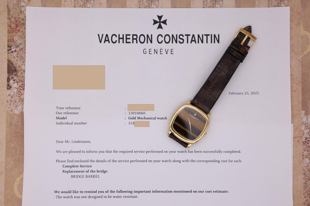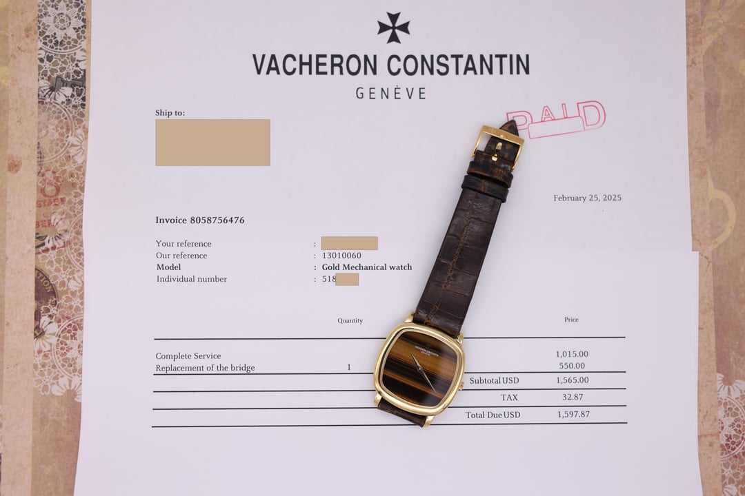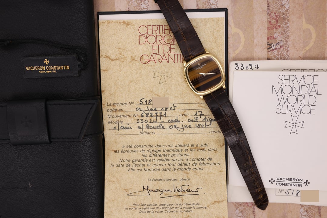 [pics](https://imgur.com/a/VkSfgUY) [timestamp](https://imgur.com/CRr26Fq) Case: Excellent condition 33mm 18K yellow gold case (36mm lug to lug width) with very light wear from use. Dial: Excellent condition Tiger Eye stone dial. There is a hairline crack in the upper left hand quadrant of the dial. Bracelet: Original brown Vacheron Constantin strap/buckle with light wear from use. Accessories: Inner/outer boxes, leather watch roll, booklets, hangtag, 2025 service papers from VC, and original warranty paper. Notes: An incredibly classy 80s VC featuring a rare and beautiful Tiger Eye dial. This one is electric on the wrist, the combination between the yellow gold and the brown tones of the stone dial. Offered at $9,250 shipped. Payment by PayPal F&F, bank wire, or crypto. Located in San Diego, CA. Insured overnight FedEx shipping. International shipping available. Buyers shipping the watch to CA will be required to pay applicable sales tax. Thanks for looking and feel free to message me with any questions!! Hit me up on IG [u/mvvwatches](https://www.reddit.com/user/mvvwatches/) Email: [[email protected]](mailto:[email protected])