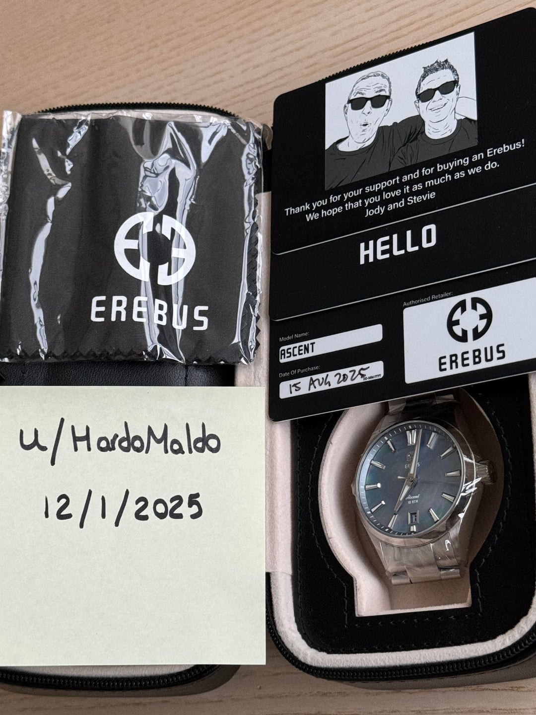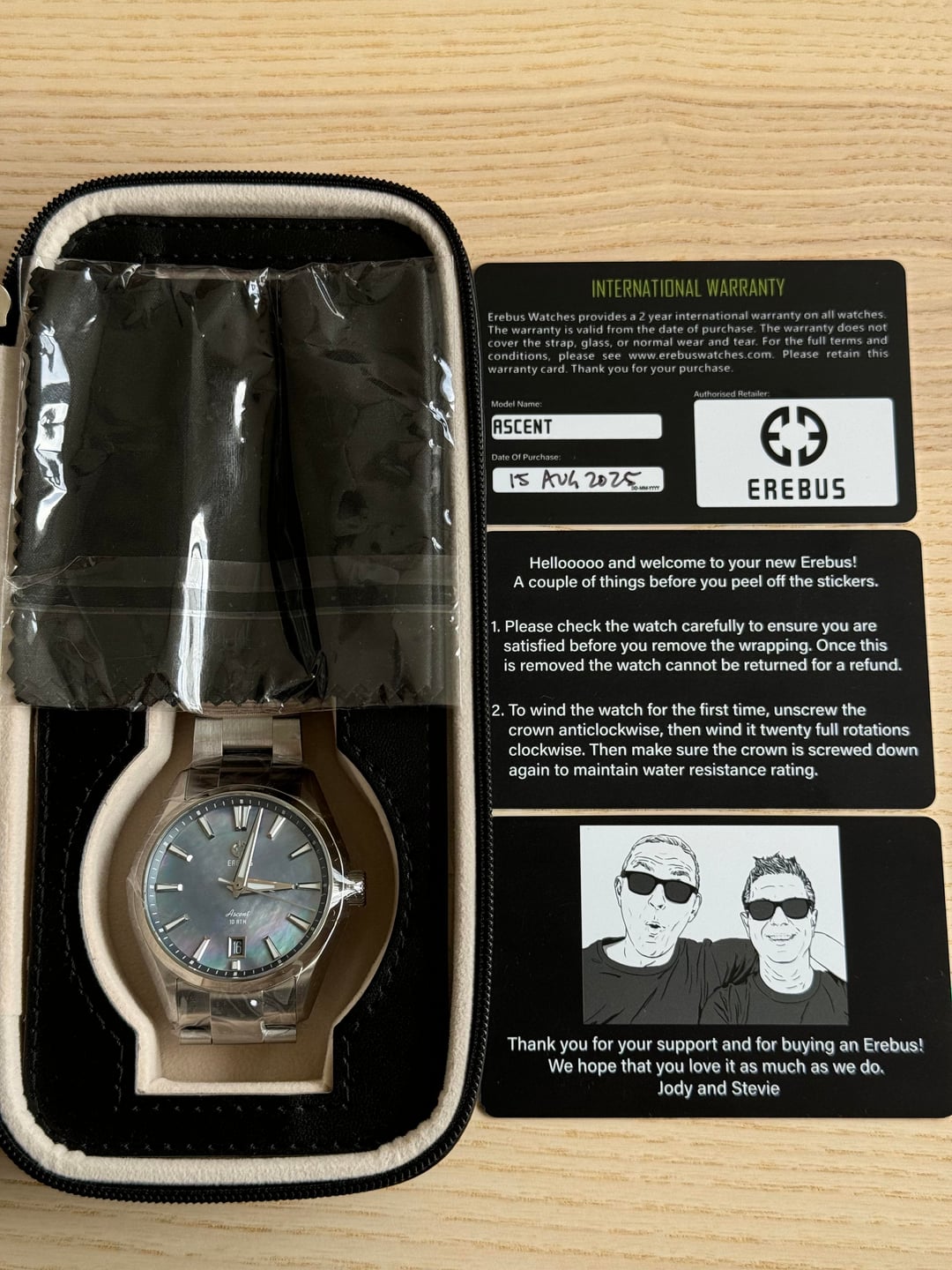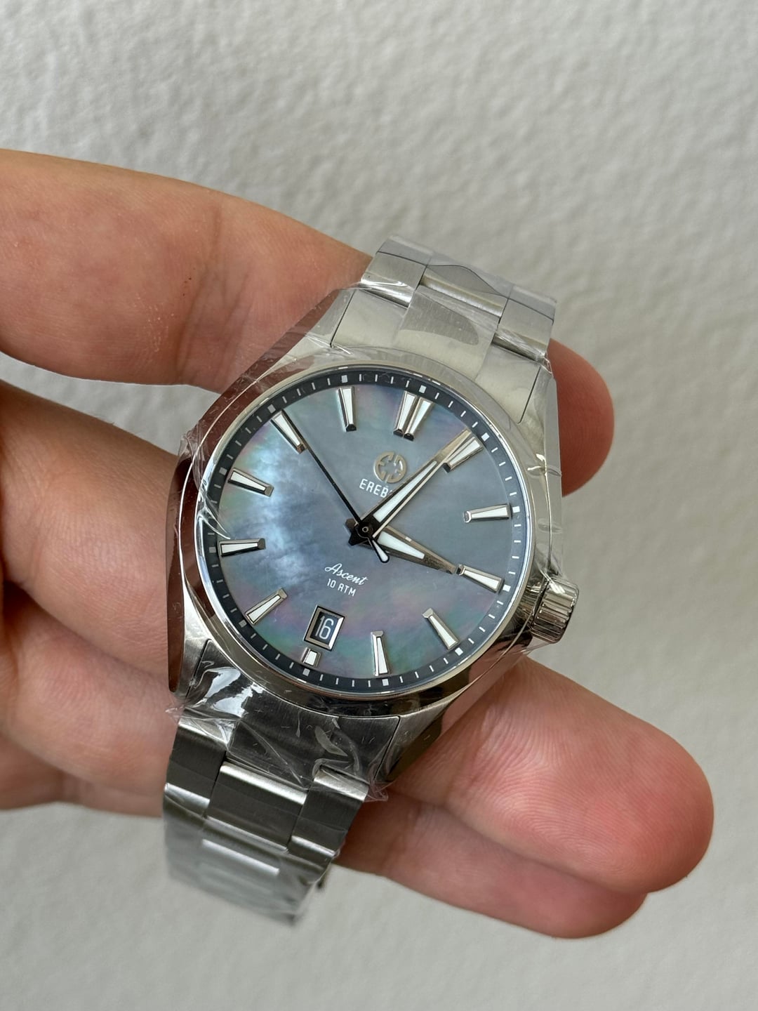 **OVERVIEW:** Up for sale is the [Erebus Ascent](https://erebuswatches.com/products/ascent-blue-mother-of-pearl?variant=49786615300382) with the beautiful blue mother of pearl dial in 39mm. Watch is **BRAND NEW** (still wrapped with all plastics) and offered to you for **$429** vs. the $733.88 I paid in total for the watch (retail price of $499 + $28.94 shipping costs + $205.94 in tariffs / import duties to the U.S.). **CONDITION:** Brand new. Opened to photograph the watch. **VIDEO:** Link [here](https://imgur.com/a/vfU6qNT). **DELIVERY:** Watch will come exactly as pictured, in a complete set (watch, box and papers). **PRICE:** $429 ~~$479~~, with shipping (USPS Priority Mail) on me. PayPal Friends & Family, Zelle and Venmo accepted. Watch ships the next morning after payment is received. **NOTE:** Despite 25+ confirmed transactions in this wonderful community, I completely understand the natural apprehension that comes with buying and selling watches online. As so, I’m happy to go the extra mile by offering (i) multiple photos of watch and tag in multiple scenarios / settings, (ii) a FaceTime call with you or (iii) both. **DISCLAIMER:** Watch will be packed carefully with tons of bubble wrap and well protected. Final sale, no returns nor refunds.