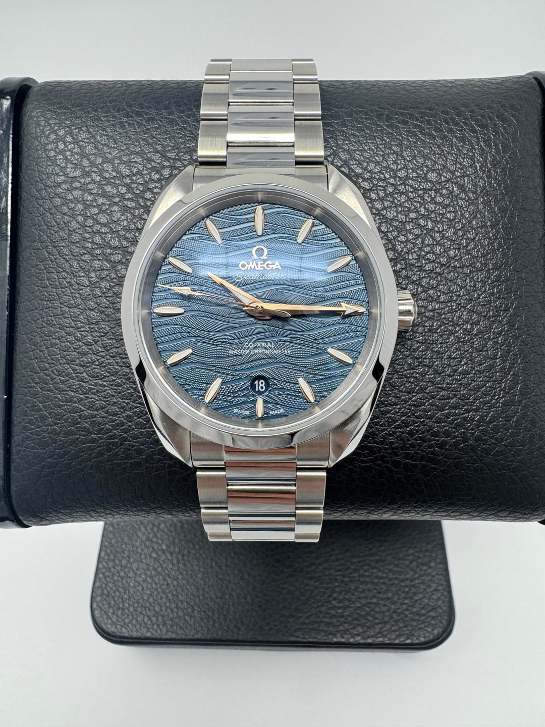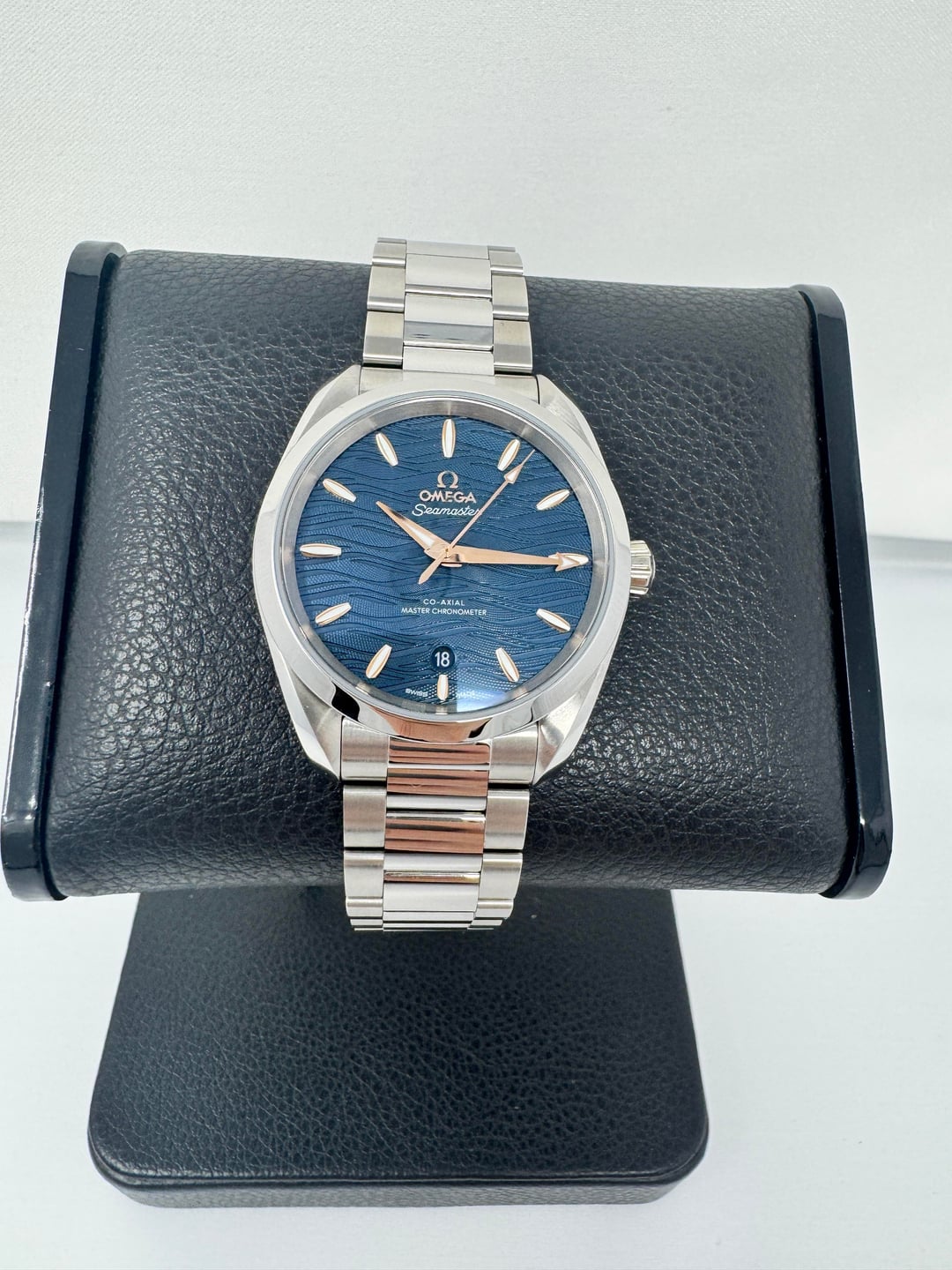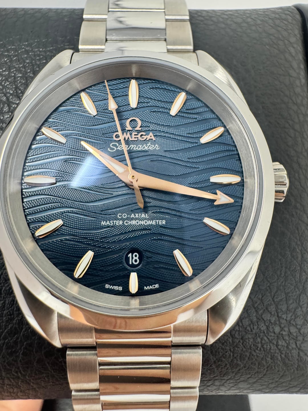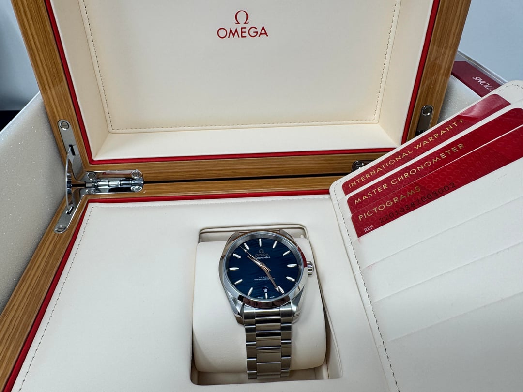 Hi everyone, letting go of my Omega Seamaster Aqua Terra 150M, reference 220.10.38.20.03.002. This is the stunning 38mm version with the deep blue “wave-pattern” dial and Omega’s Master Chronometer Calibre 8800. Perfect all-rounder — sporty enough for everyday wear but clean and elegant for dressier occasions. Model: Omega Seamaster Aqua Terra 150M Reference: 220.10.38.20.03.002 Case Size: 38mm Dial: Blue wave-pattern dial, 18K Sedna-gold hands/indices Movement: Co-Axial Master Chronometer Cal. 8800, 55-hour power reserve Crystal: Sapphire front + exhibition case back Bracelet: OEM stainless steel bracelet with polished/brushed finish Condition BNIB What’s Included Full kit: box, cards, booklet, cards holder Price $4800 USD (MSRP $7100 + Tax) Shipping: CONUS preferred Payment: PayPal F&F, Zelle, etc