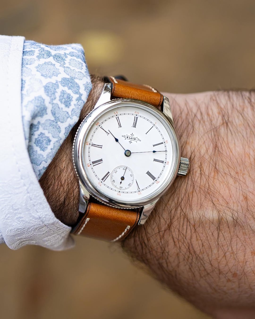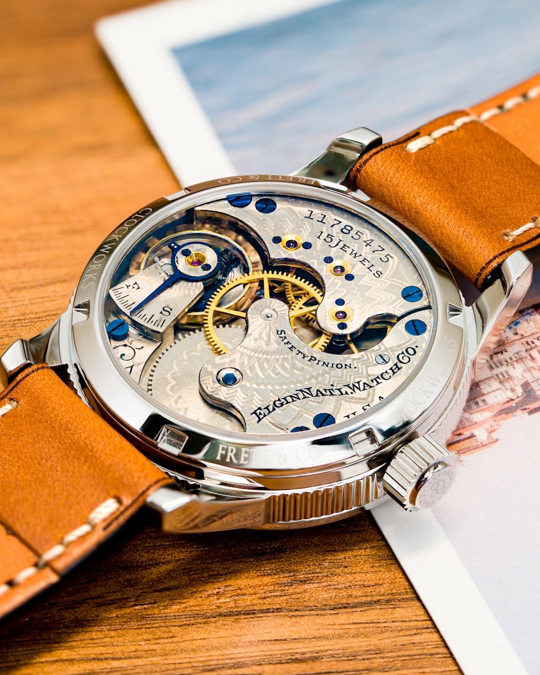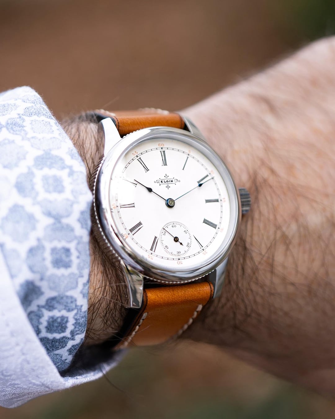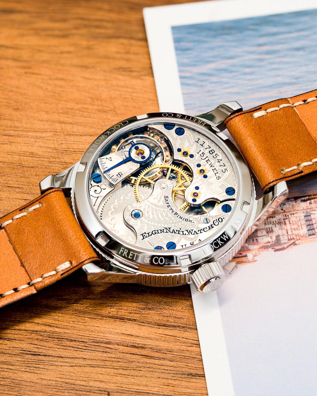 **Photos**: [https://imgur.com/a/MtpASyp](https://imgur.com/a/MtpASyp) **Movement Shots**: [https://imgur.com/a/mGdlQKJ](https://imgur.com/a/mGdlQKJ) **Videos**: [https://imgur.com/a/RFpRXoN](https://imgur.com/a/RFpRXoN) **Timestamp**: [https://imgur.com/a/epmXa6v](https://imgur.com/a/epmXa6v) *Elgin National Watch Co. was in operation from 1864-1968 and was an American pocket watch manufacturer. Manufacturing of Elgin watches took place at their facility in Elgin, Illinois.* This Elgin conversion from 1905 wears exactly the way a modern piece should—thin through the case, curved lugs that hug the wrist, and a 40 mm profile that fits comfortably. The first thing you notice on the wrist is how naturally it sits as a pocket watch conversion. No overhang, no bulk, just a clean, vintage American movement brought into a truly wearable format. Behind that is a stunning porcelain enamel dial with Roman numerals, a decorative Elgin banner at the center, and red five minute markers that add a subtle pop of color. Beneath it is Elgins Grade 295, a long running and well respected 15 jewel movement known for its exposed mainspring barrel and sweeping damaskeening. Everything inside has been refinished by hand in our Little Rock, Arkansas workshop—thermally blued screws, polished golden jewel settings, and fully restored plates. The hands remain in their original heat blued finish, offering a direct link to how this watch looked more than a century ago. A refined, wearable piece of American watchmaking history—rebuilt, restored, and crafted for today. All work was completed in our Little Rock, Arkansas workshop 🇺🇸 (read more about us [here](https://www.littlerocksoiree.com/relics-to-riches-what-makes-frett-co-clockworks-tick/)). **Price**: $3,249, But negotiable—especially to someone with an interest getting into vintage American watchmaking. **Case**: 316L stainless (surgical steel), 40 mm diameter, 48 mm lug to lug, 13 mm height, sapphire crystals AR coated, front crystal domed, and 50 meters water resistance. Recommend to remove before water activities. Read more about our 40 mm case [here](https://www.frettclockworks.com/blog/introducing-our-40-mm-pocket-watch-conversion-case). **Thermal Coloring**: To enhance both corrosion resistance and visual appeal, the movement hardware was thermally colored using a traditional technique employed by early 20th-century watchmakers: open-flame bluing (read more [here](https://www.frettclockworks.com/blog/the-art-and-science-of-thermal-coloring-for-pocket-watch-conversions)). **Shipping**: UPS 2nd Day Air free in the USA. International shipping via DHL Express (\~$100), which takes approximately one week from date of shipment. **Payment Method**: PayPal, PayPal Credit, Venmo, Apple Pay, CashApp, Wise, Afterpay, Affirm, Klarna, and All Major Credit Cards **Service History**: The watch was serviced in 2025 and comes with a 1-year service warranty. The watch was inspected and cleaned. The watch was re-assembled and oiled using high-grade synthetic Swiss oil (Moebius). Time keeping will vary depending on position. **About us**: We are a small batch, custom watch restoration company located in Central Arkansas USA. Our mission is to preserve and enhance vintage and antique watches. Everything we work on is done in house completely by hand. Each timepiece we produce is one-of-a-kind. Please follow us on [Instagram](https://www.instagram.com/frettcoclockworks/) Please like us on [Facebook](https://www.facebook.com/frettcoclockworks/)