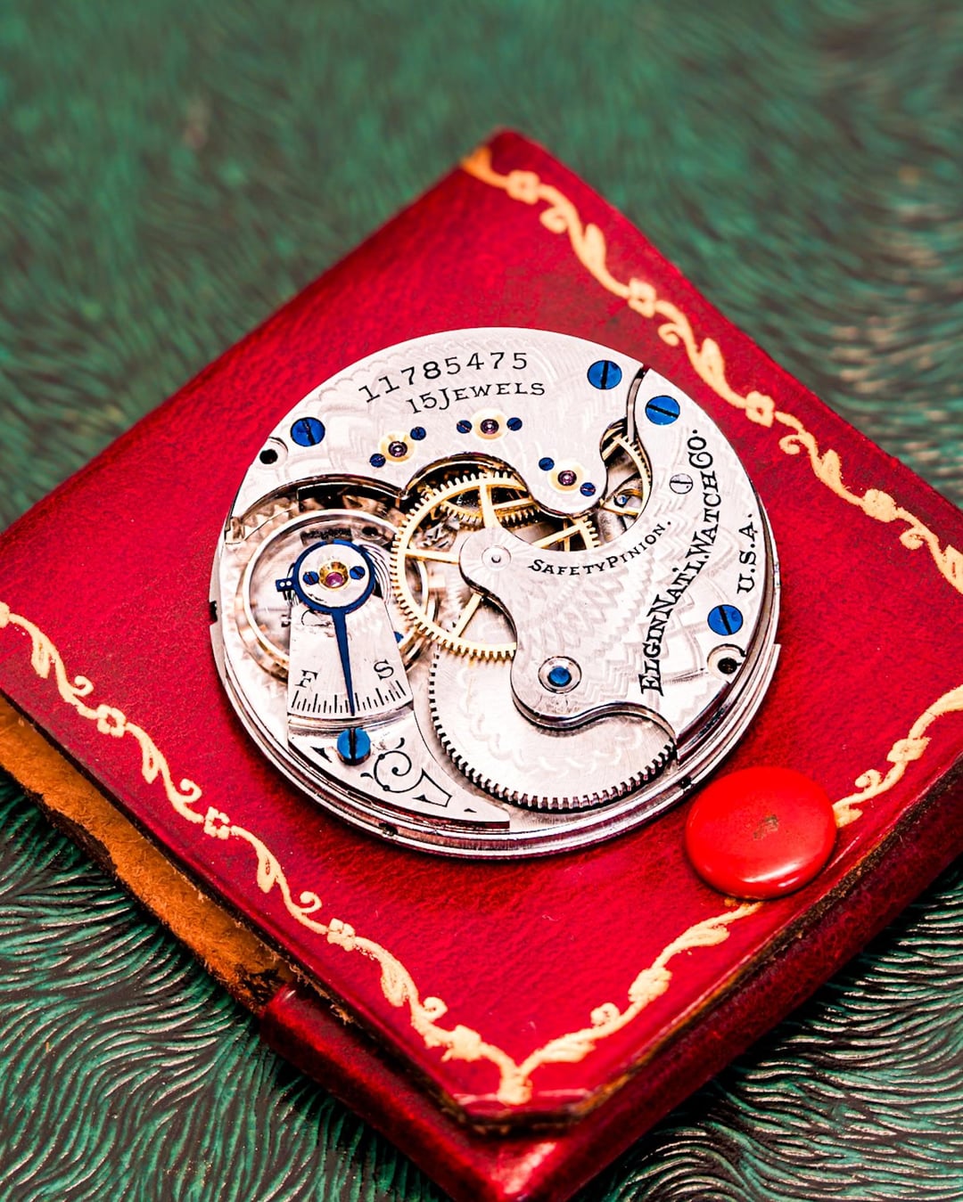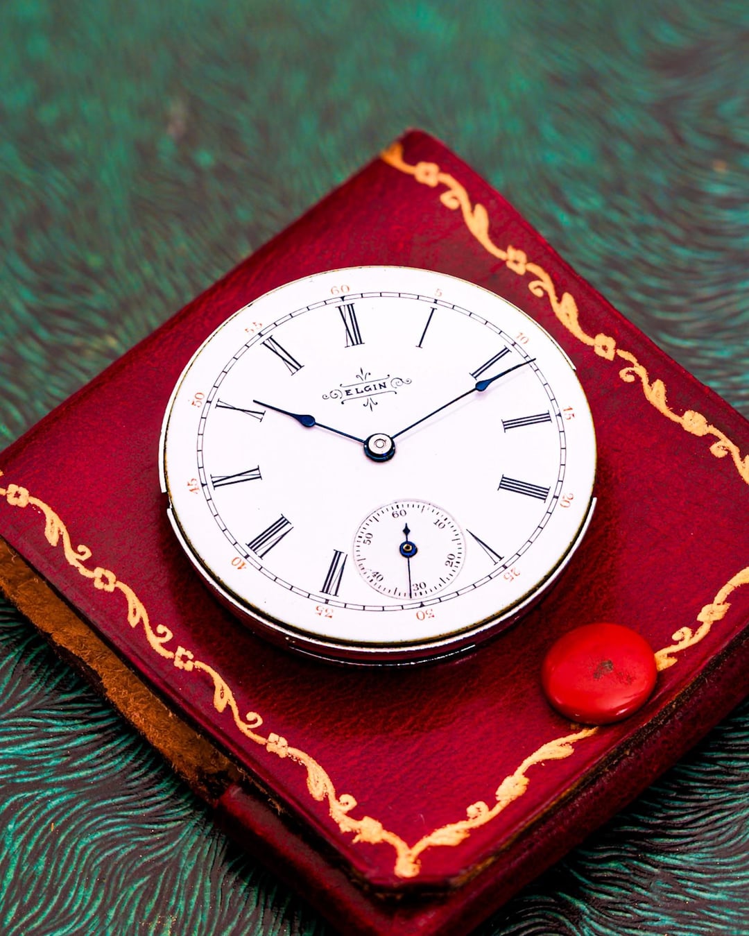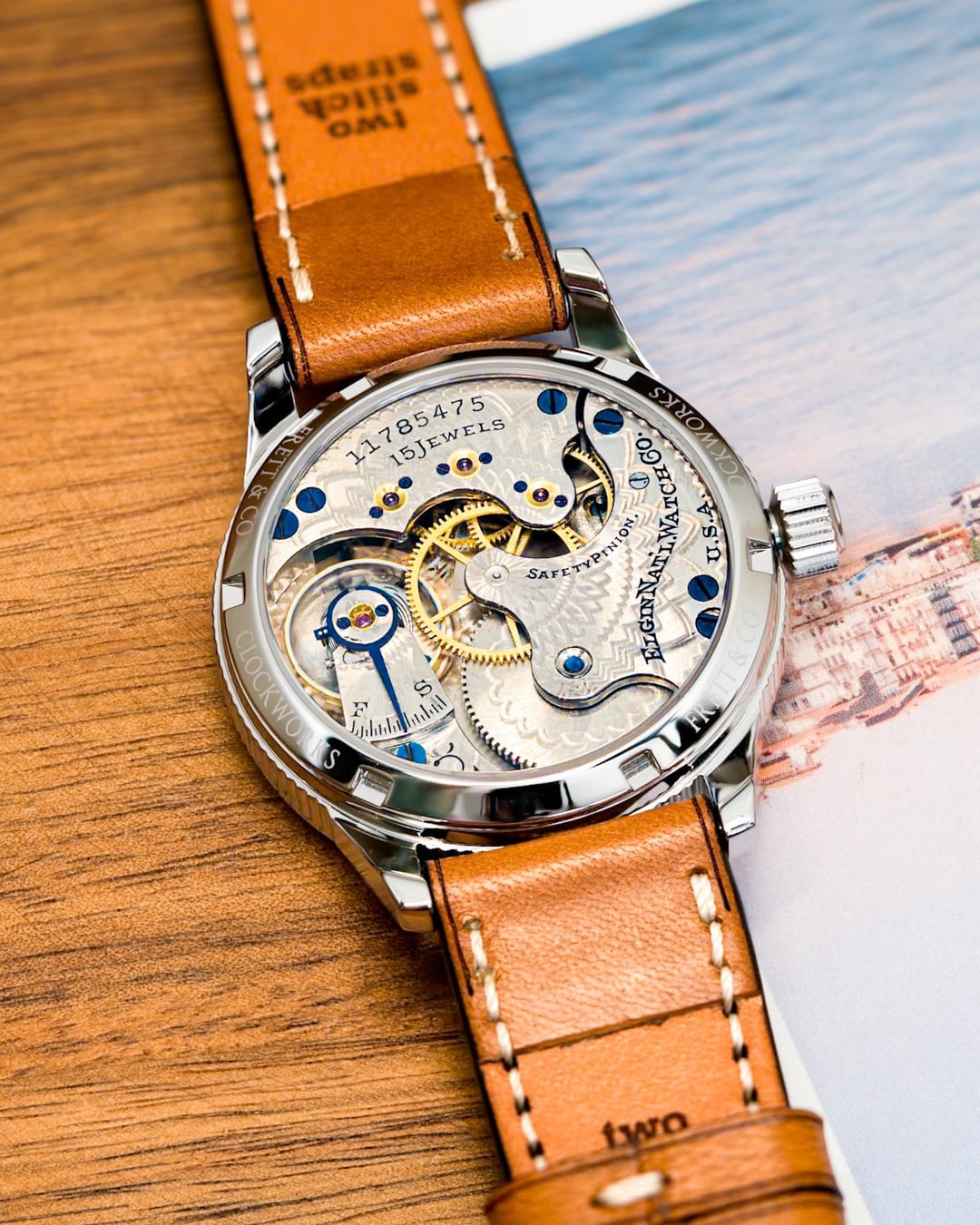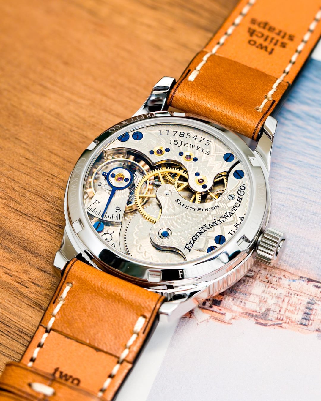 **Photos**: [https://imgur.com/a/MtpASyp](https://imgur.com/a/MtpASyp) **Movement Shots**: [https://imgur.com/a/mGdlQKJ](https://imgur.com/a/mGdlQKJ) **Videos**: [https://imgur.com/a/RFpRXoN](https://imgur.com/a/RFpRXoN) **Timestamp**: [https://imgur.com/a/epmXa6v](https://imgur.com/a/epmXa6v) *Elgin National Watch Co. was in operation from 1864-1968 and was an American pocket watch manufacturer. Manufacturing of Elgin watches took place at their facility in Elgin, Illinois.* This Elgin conversion from 1905 wears exactly the way a modern piece should—thin through the case, curved lugs that hug the wrist, and a 40 mm profile that fits comfortably. The first thing you notice on the wrist is how naturally it sits as a pocket watch conversion. No overhang, no bulk, just a clean, vintage American movement brought into a truly wearable format. Behind that is a stunning porcelain enamel dial with Roman numerals, a decorative Elgin banner at the center, and red five minute markers that add a subtle pop of color. Beneath it is Elgins Grade 295, a long running and well respected 15 jewel movement known for its exposed mainspring barrel and sweeping damaskeening. Everything inside has been refinished by hand in our Little Rock, Arkansas workshop—thermally blued screws, polished golden jewel settings, and fully restored plates. The hands remain in their original heat blued finish, offering a direct link to how this watch looked more than a century ago. A refined, wearable piece of American watchmaking history—rebuilt, restored, and crafted for today. All work was completed in our Little Rock, Arkansas workshop 🇺🇸 (read more about us [here](https://www.littlerocksoiree.com/relics-to-riches-what-makes-frett-co-clockworks-tick/)). **Price**: $3,249, But negotiable—especially to someone with an interest getting into vintage American watchmaking. **Case**: 316L stainless (surgical steel), 40 mm diameter, 48 mm lug to lug, 13 mm height, sapphire crystals AR coated, front crystal domed, and 50 meters water resistance. Recommend to remove before water activities. Read more about our 40 mm case [here](https://www.frettclockworks.com/blog/introducing-our-40-mm-pocket-watch-conversion-case). **Thermal Coloring**: To enhance both corrosion resistance and visual appeal, the movement hardware was thermally colored using a traditional technique employed by early 20th-century watchmakers: open-flame bluing (read more [here](https://www.frettclockworks.com/blog/the-art-and-science-of-thermal-coloring-for-pocket-watch-conversions)). **Shipping**: UPS 2nd Day Air free in the USA. International shipping via DHL Express (\~$100), which takes approximately one week from date of shipment. **Payment Method**: PayPal, PayPal Credit, Venmo, Apple Pay, CashApp, Wise, Afterpay, Affirm, Klarna, and All Major Credit Cards **Service History**: The watch was serviced in 2025 and comes with a 1-year service warranty. The watch was inspected and cleaned. The watch was re-assembled and oiled using high-grade synthetic Swiss oil (Moebius). Time keeping will vary depending on position. **About us**: We are a small batch, custom watch restoration company located in Central Arkansas USA. Our mission is to preserve and enhance vintage and antique watches. Everything we work on is done in house completely by hand. Each timepiece we produce is one-of-a-kind. Please follow us on [Instagram](https://www.instagram.com/frettcoclockworks/) Please like us on [Facebook](https://www.facebook.com/frettcoclockworks/)