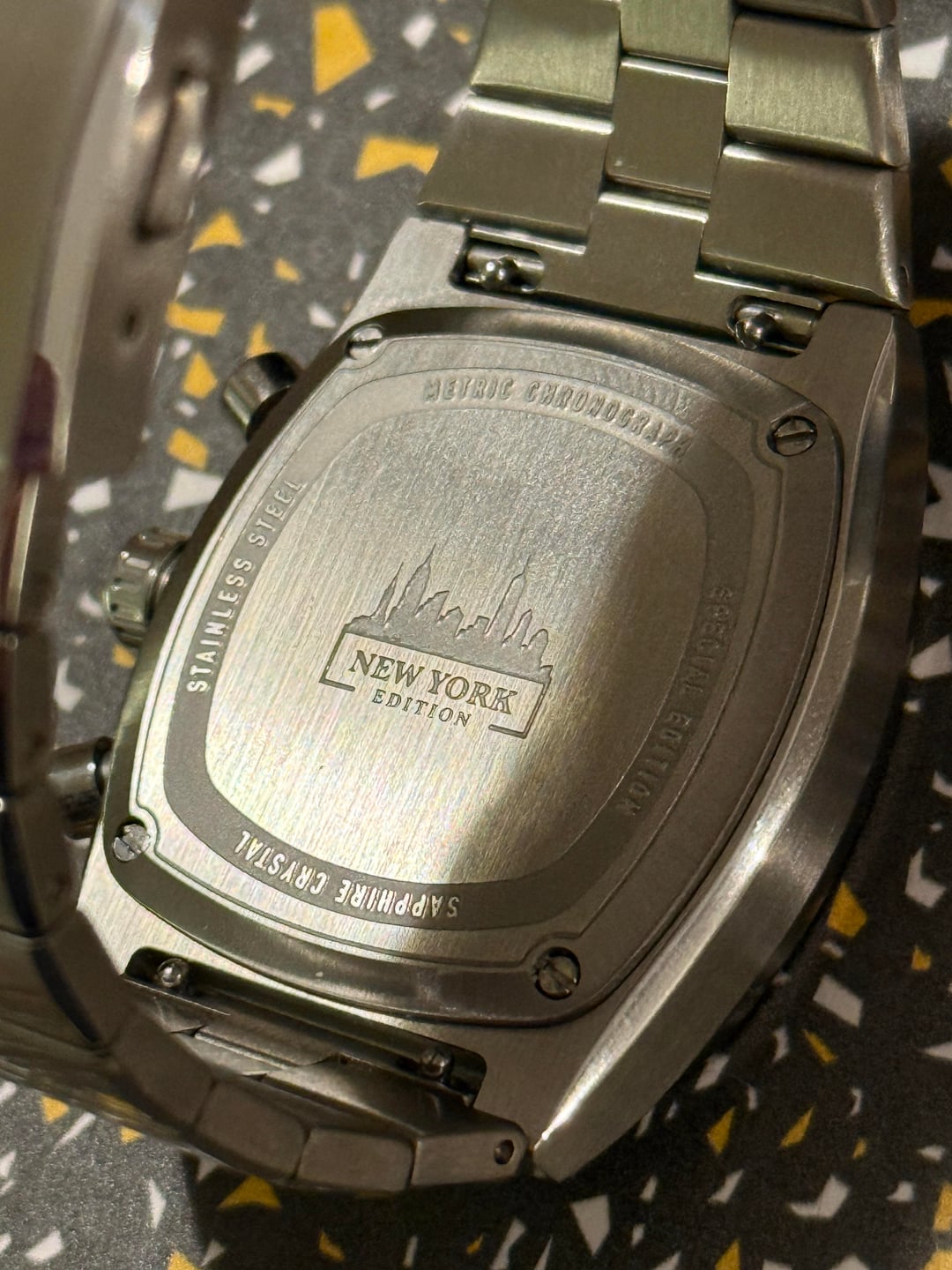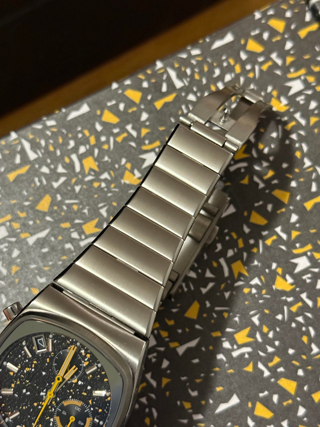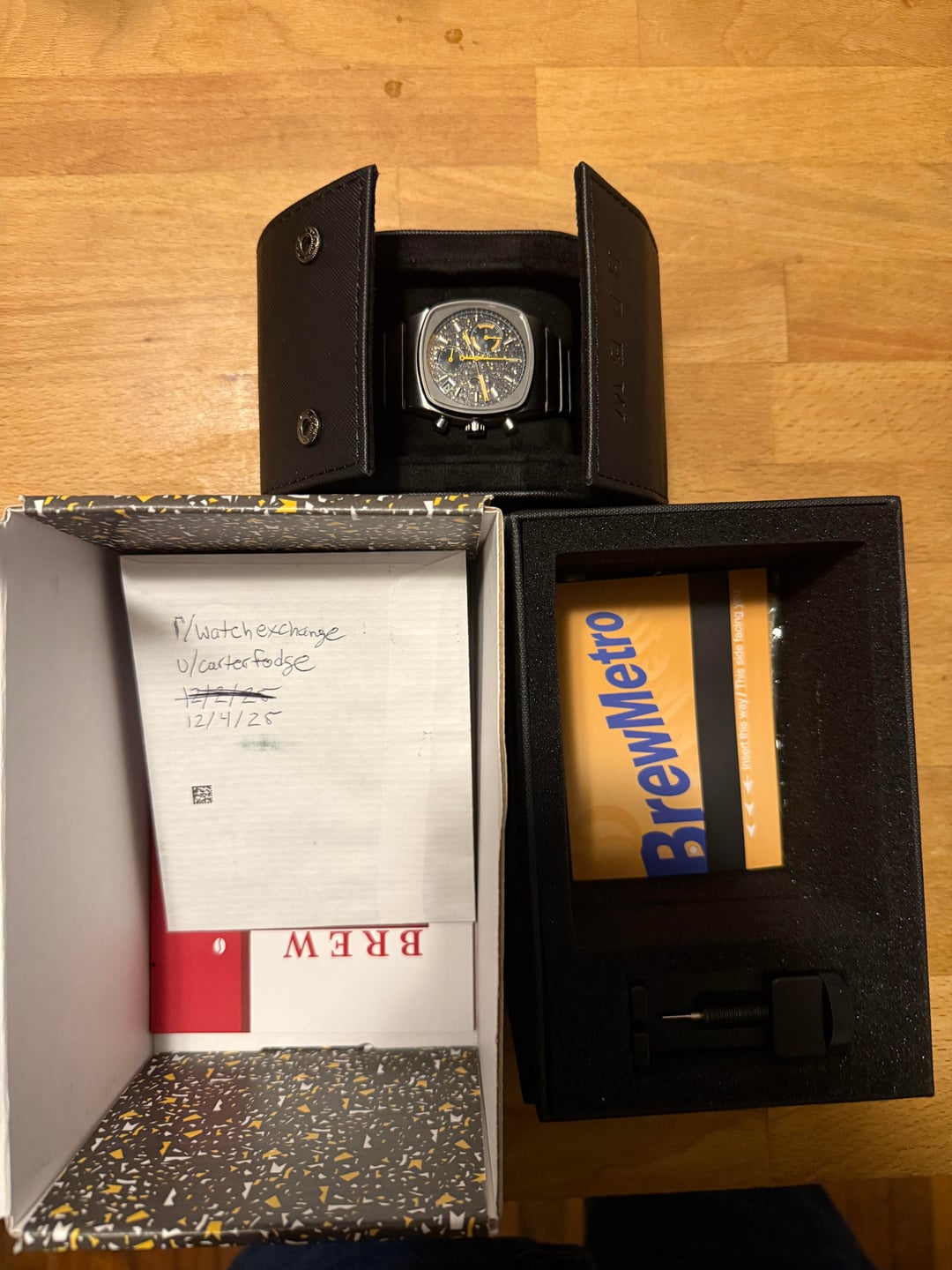 Hi WatchEx! For sale is my Brew Metric, limited New York edition. This watch was limited to 50 units, only sold at Windup Watch Fair in NYC this year. Incredibly fun watch, but went a little crazy with integrated bracelet watches this year, so this is on the chopping block. Legibility is surprisingly good, easy to read at a glance with the yellow tipped hands. (Also, for the lume nuts out there, the white specs on the dial are lumed!) **SPECS**: 36mm diameter, 41.5mm lug to lug, 10.75mm case thickness, 50m water resistance, sapphire crystal, Seiko VK68 Meca-Quartz movement **CONDITION**: Great condition overall, just a few little scuffs on the bracelet links towards the bottom. Only worn a handful of times. **INCLUDED**: Full set, including box, extra links, bracelet sizing tool, Brew branded travel case, and papers. **PRICE**: $550 OBO, paid about $525 at Windup, fully insured shipping with UPS included in price. Shipping CONUS ONLY, sorry no international sales at the moment. Payment via Venmo, Paypal F&F (G&S +3.5% to cover fees) TRADES: Always happy to see what you have for offer, but likely sale-only on this one! Feel free to reach out with any questions or if you need more pictures!