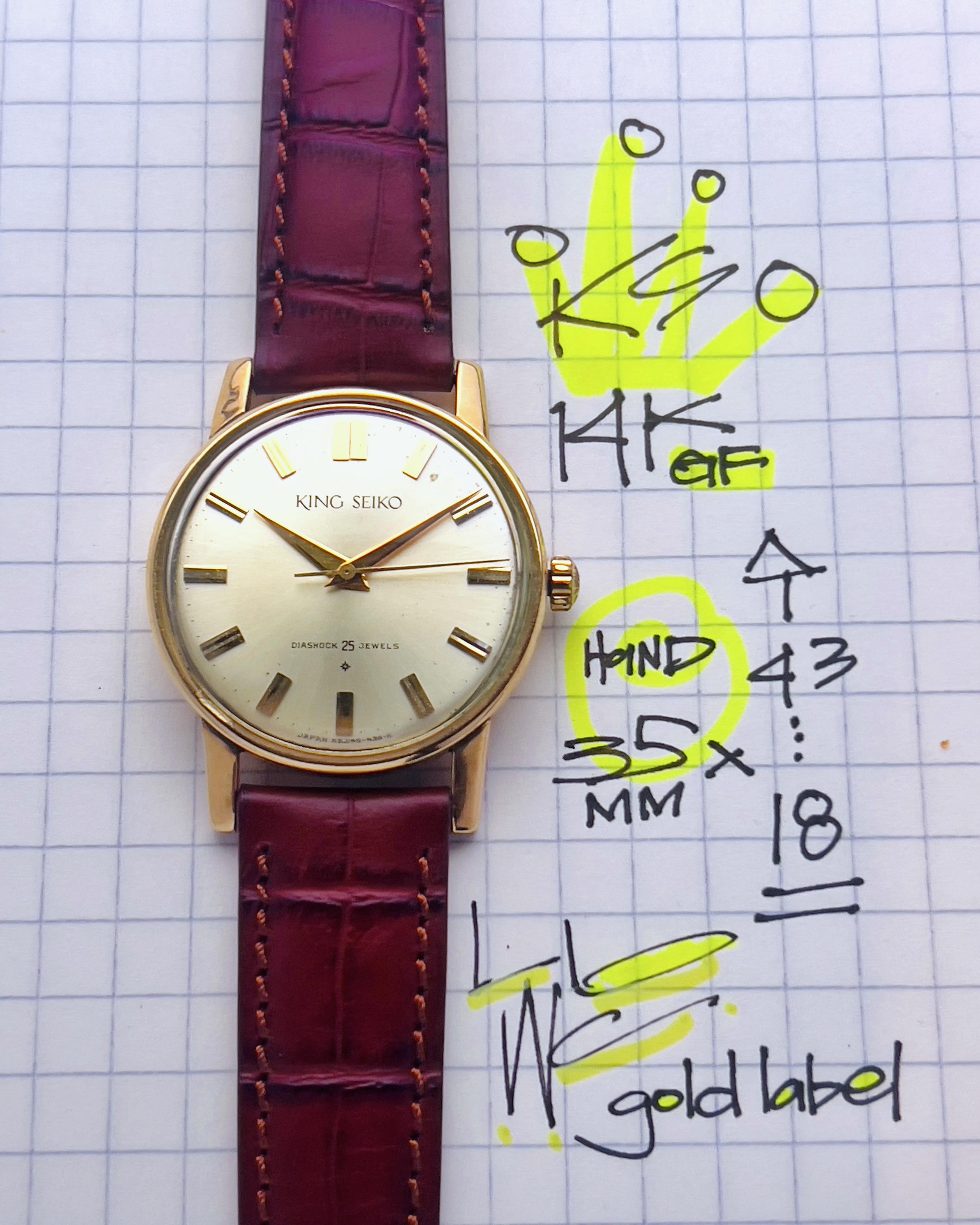 King Seiko First Model Hand-Wound 14K Gold GF circa 1960s King Seiko not only stands for landmarks in horology and makes for fine collectibles but the pieces are still excellent to wear today The specific reference on this variation appears to be J14102E in a 14k gold filled case . Overall, this 14k gold filled example is in excellent condition for its age with no outstanding damage or marks with exception of finish coming off on the original crown and a blemish on dial. While the automatic movement has no service history it is running excellent as well as exhibited on timegrapher. Timestamp pix Videos and timegrapher: https://drive.google.com/drive/folders/1w-Z-ZeO6fMhwwMbalSryAeKXxl9GmsNm?usp=share_link Specifications: 35mm case X 43h X 18 lug width X 9.6cc with domed acrylic crystal Box and papers: no * Video is the best way to view the watch if in-person test drive is not available. Due to the different characteristic of the cameras and gadgets used, the color of the watch you purchase may not be the same as shown on this website or on our Instagram. * will consider trades that make sense but please consider time, shipping, and trade value—not market. - local special: can possibly accommodate at ButterScotch in Downtown Long Beach by appointment - All sales final unless the watch is misrepresented or lost in transit (always fully insured) - Link to [feedback here](https://www.reddit.com/r/WatchExchangeFeedback/search?q=soycowboy&restrict_sr=1&sort=new) & [watchcharts here](https://watchcharts.com/repcheck/user/soycowboy?source=reddit&type=feedback) Asking a *negotiable* **$777** via bank wire, Zelle, venmo, or possibly Apple-pay with super strong references or if I know you. Price includes fully insured Fedex shipping in the USA— hand delivery in long Beach with drinks or coffee on me ;).