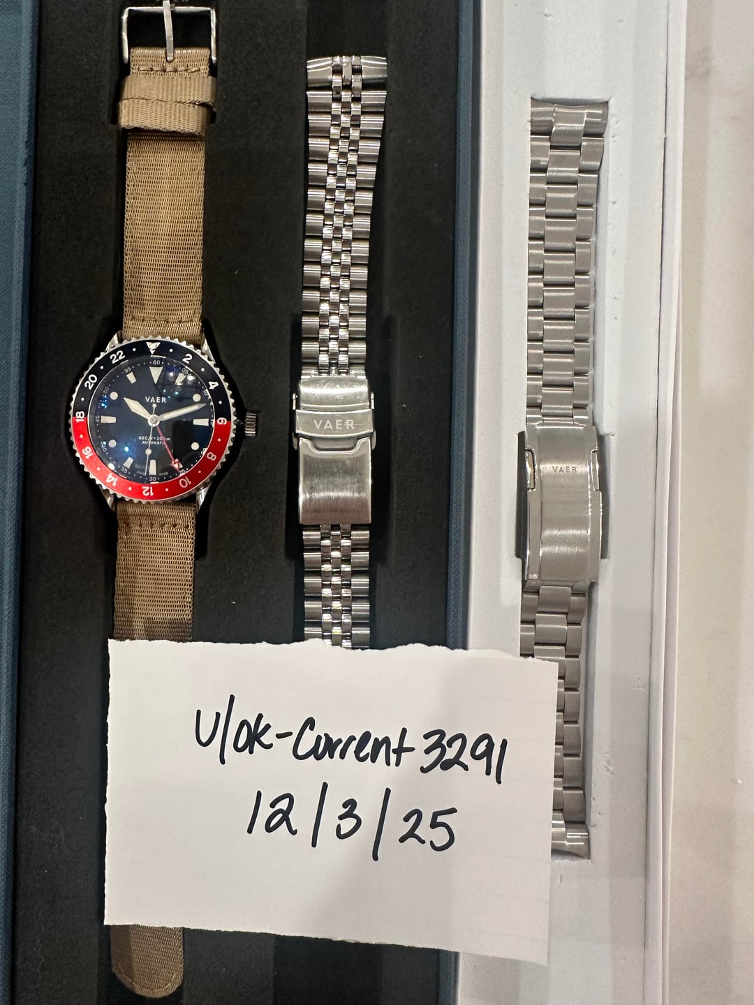 For sale: Vaer G7 Pepsi — Series 1, No Date This is the discontinued first-generation G7 with the no-date dial and Pepsi GMT bezel. Condition: Excellent — crystal, bezel, and case are clean; functions perfectly. Includes everything shown in the photos: • Vaer G7 Series 1 watch head (no-date, discontinued) • Tan NATO strap • Stainless steel jubilee bracelet • Stainless steel oyster-style bracelet • Original packaging Price: $650 OBO Trade Value: Not looking for trades Shipping: FedEx 2-Day Air, paid by the buyer Payment: Zelle preferred, PayPal Friends & Family accepted Rare early-generation no-date G7 Pepsi with two bracelets — complete, clean, and ready to go. DM with any questions.