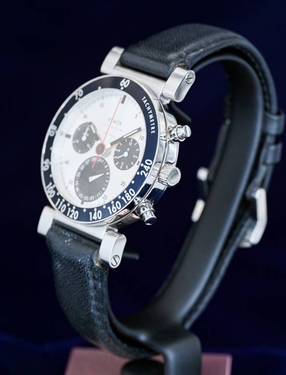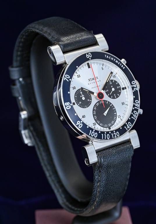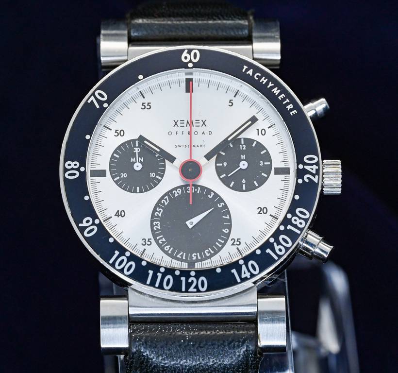 Hello, selling a Swiss made Xemex Off-road Chronograph in stainless steel. Polished 37mm diameter case with brushed stainless steel lugs. Case is 9mm thick and an engraved caseback with the designer's signature. Silver dial features date, small seconds and 12hr sub-dials. Accurate quartz movement. Fixed blue bezel with tachymeter scale. Blue calfskin strap with stainless steel pin buckle. Watch is in very good condition with minimal signs of wear. Offer is Watch Only. Asking $525.