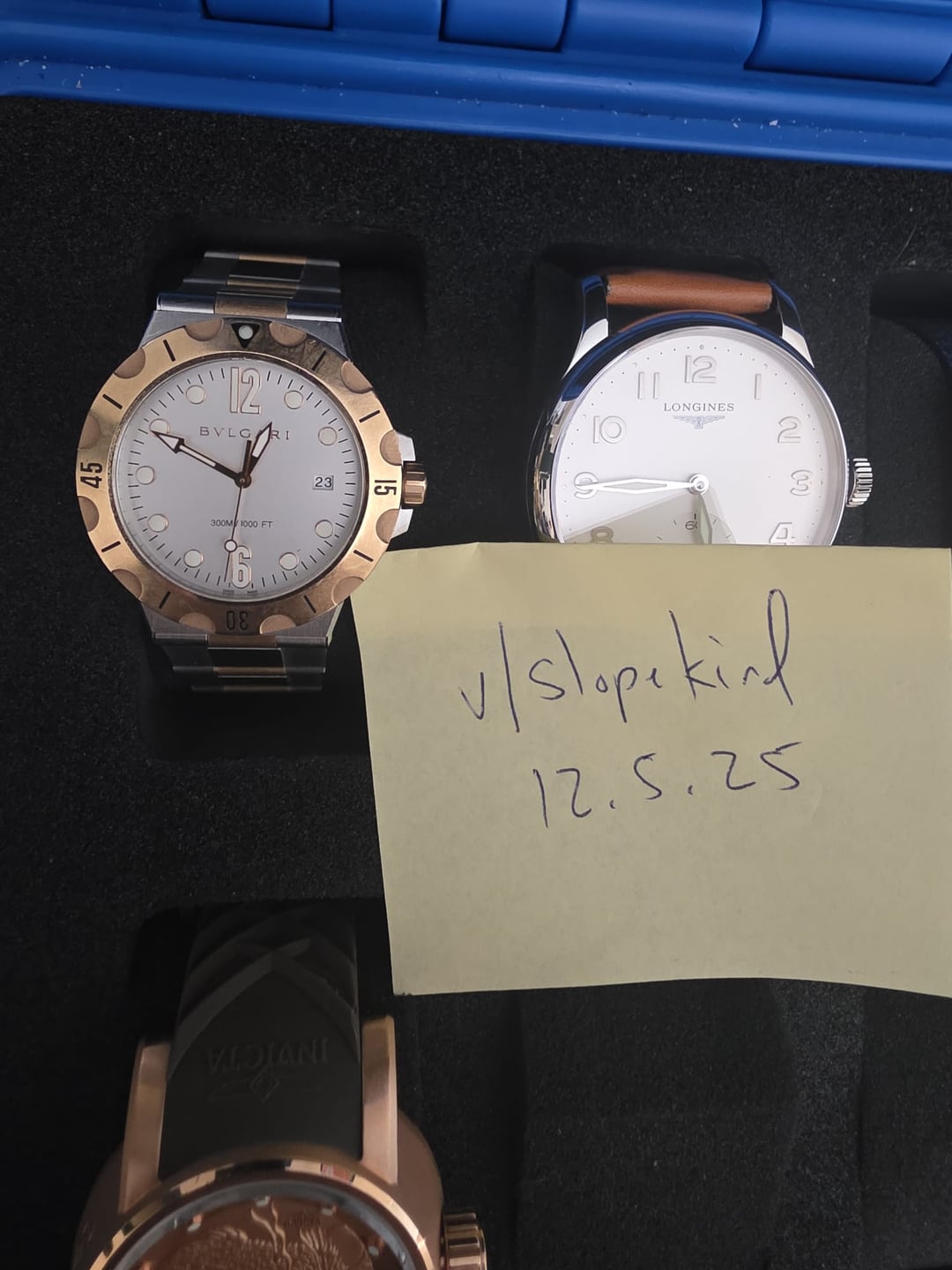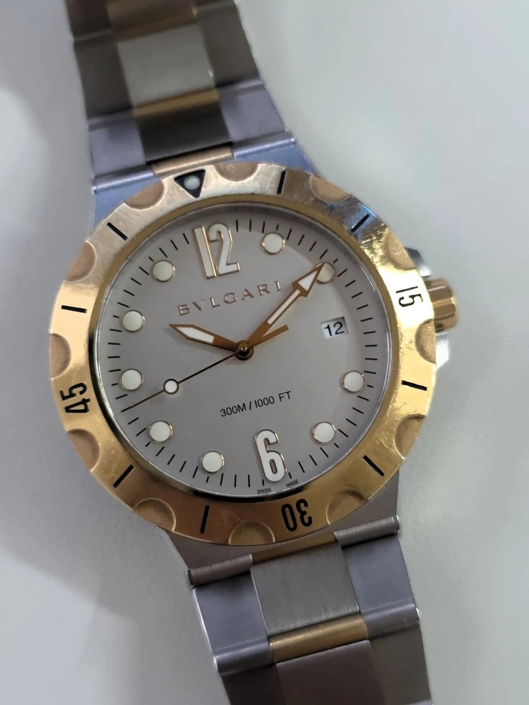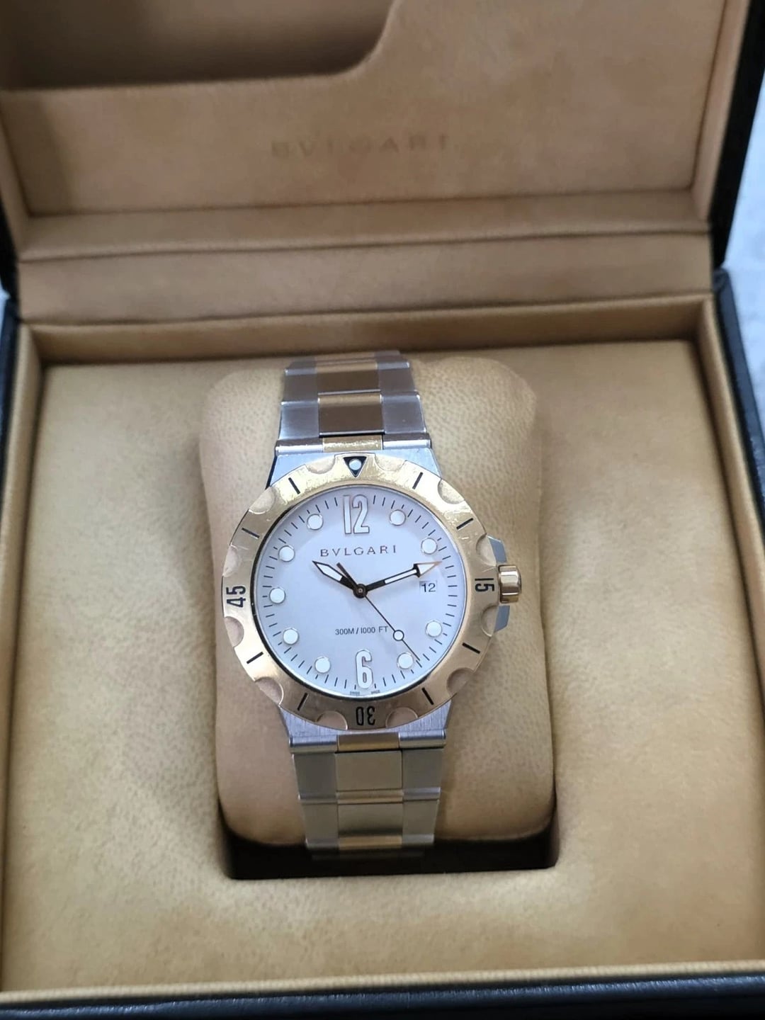 **Bvlgari Diagono Scuba** **Ref: DP41SPGSD** This Bvlgari Diagono Scuba is in good overall condition, showing wear throughout consistent with use but running well. The 41mm stainless steel case with gold accents gives the watch a bold yet refined presence, while the unidirectional bezel and luminous markers highlight its dive-ready design. The bracelet is generously sized, fitting wrists up to approximately 7.75 inches, and features a secure twin-trigger release clasp. A versatile piece that combines Bvlgari’s Italian luxury design with true sport functionality. This watch will come with its Bvlgari box. Price - $3499 shipped Pics & Timestamp - [https://imgur.com/a/sNSuQ7Q](https://imgur.com/a/sNSuQ7Q) IG = watchfornia Cheers, Adam