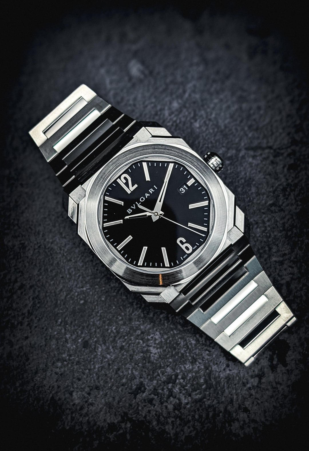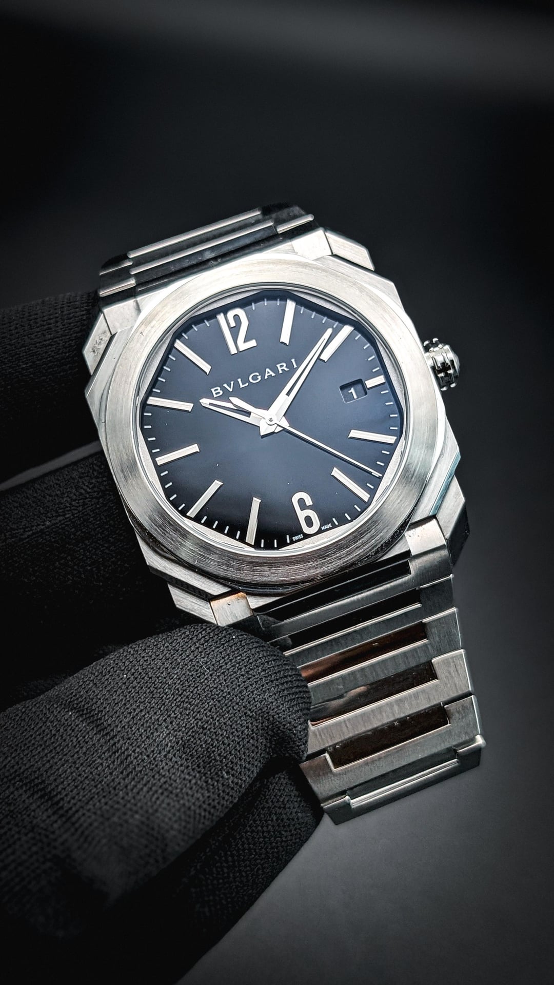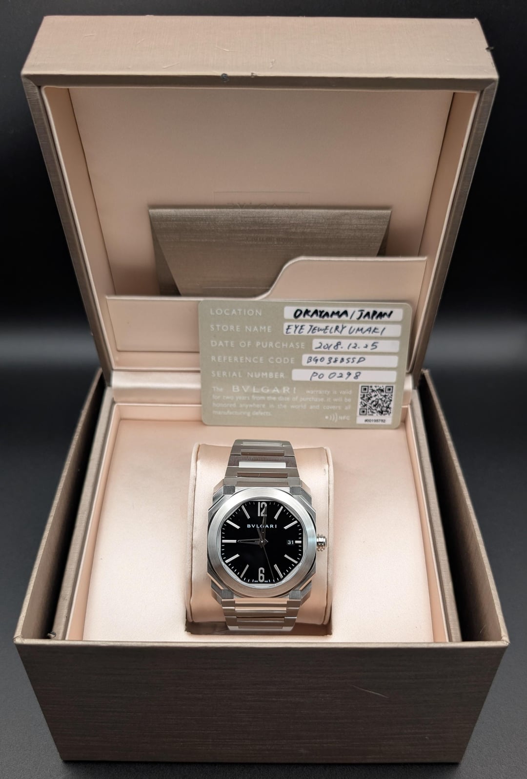 Today, I'm listing this absolutely gorgeous Bulgari Octo Solotempo, featuring the perfectly sized 38mm stainless steel case and a striking black lacquered dial. This is the original, purest expression of the Octo design — before the line expanded into ultra-thins and skeletons — a watch that perfectly captures the architectural essence of Bulgari’s modern watchmaking philosophy. Designed by Gérald Genta, the Octo is a masterclass in geometry: 110 meticulously finished facets catching light from every angle, yet balanced with the minimalism of its clean dial and elegant proportions. At 38mm, it wears beautifully — assertive yet refined, making it one of the most versatile modern dress-sport pieces ever made. Powered by Bulgari’s in-house caliber BVL 191 Solotempo, this automatic movement is finished with Geneva stripes marked with legendary jeweler's iconic workmanship. The case finishing is truly incredible — alternating polished and brushed surfaces that highlight its architectural form. My favorite thing about this watch is the amazing bracelet, gorgeously finished with brushed and polished alternating links formed around Genta's iconic integrated design, for a cohesive, sculptural wrist presence. This one is truly a special watch and is a combination of jewelry and horological history. Pick it up today for $3850 insured and shipped to your door. Brand: Bulgari Model: Octo L'Originale Solo Tempo 38mm Full Set Reference: 102104 Case Size: 38mm Year: 2018 Comes as: Complete set with Box, warranty card, extra links Condition: Excellent condition, with almost no wear 9.5/10 Price:$3,850 Image Gallery: [https://postimg.cc/gallery/6TcJscV](https://postimg.cc/gallery/6TcJscV) Timestamp: [https://postimg.cc/Vd95pKT6](https://postimg.cc/Vd95pKT6) Open to trades or purchase of: Modern Rolex, Tudor, Omega, Cartier, Breitling, Grand Seiko, IWC, Zenith. Payment Methods: Zelle or Wire. Paypal FF, Venmo and stable currency crypto available for established buyers
