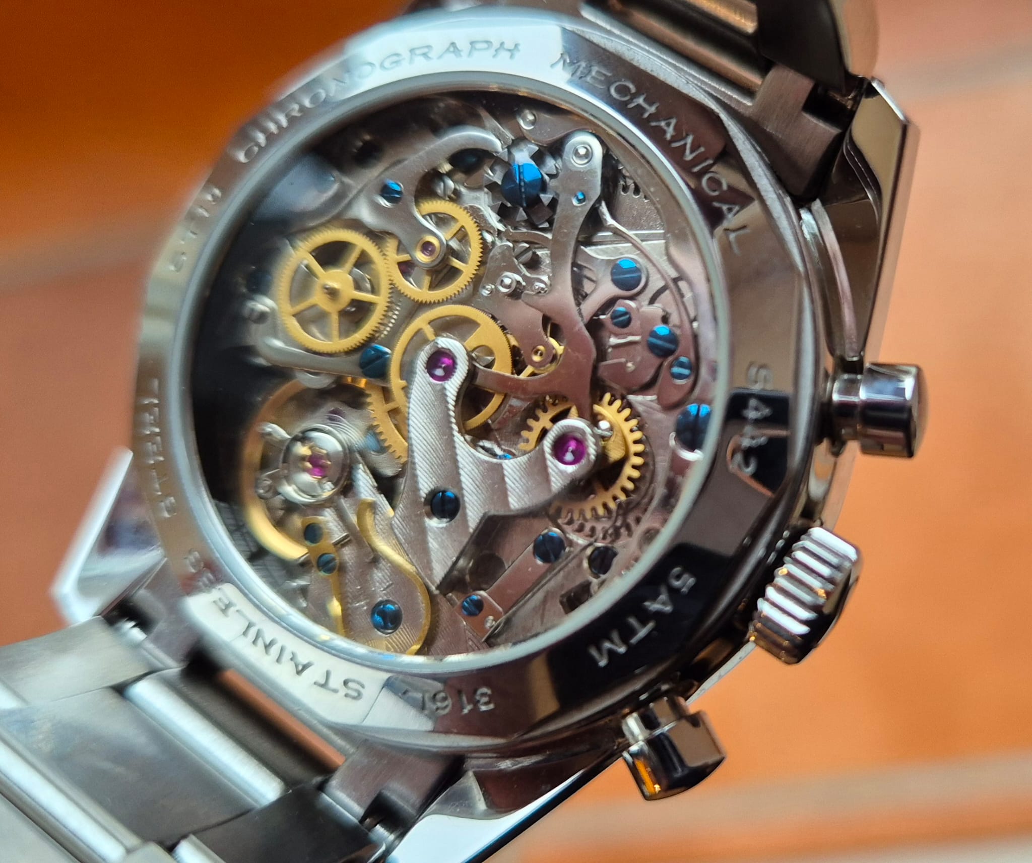 Caractéristiques : Chronographe à roue à colonnes, vis en acier bleui, fond transparent, régulateur à col de cygne