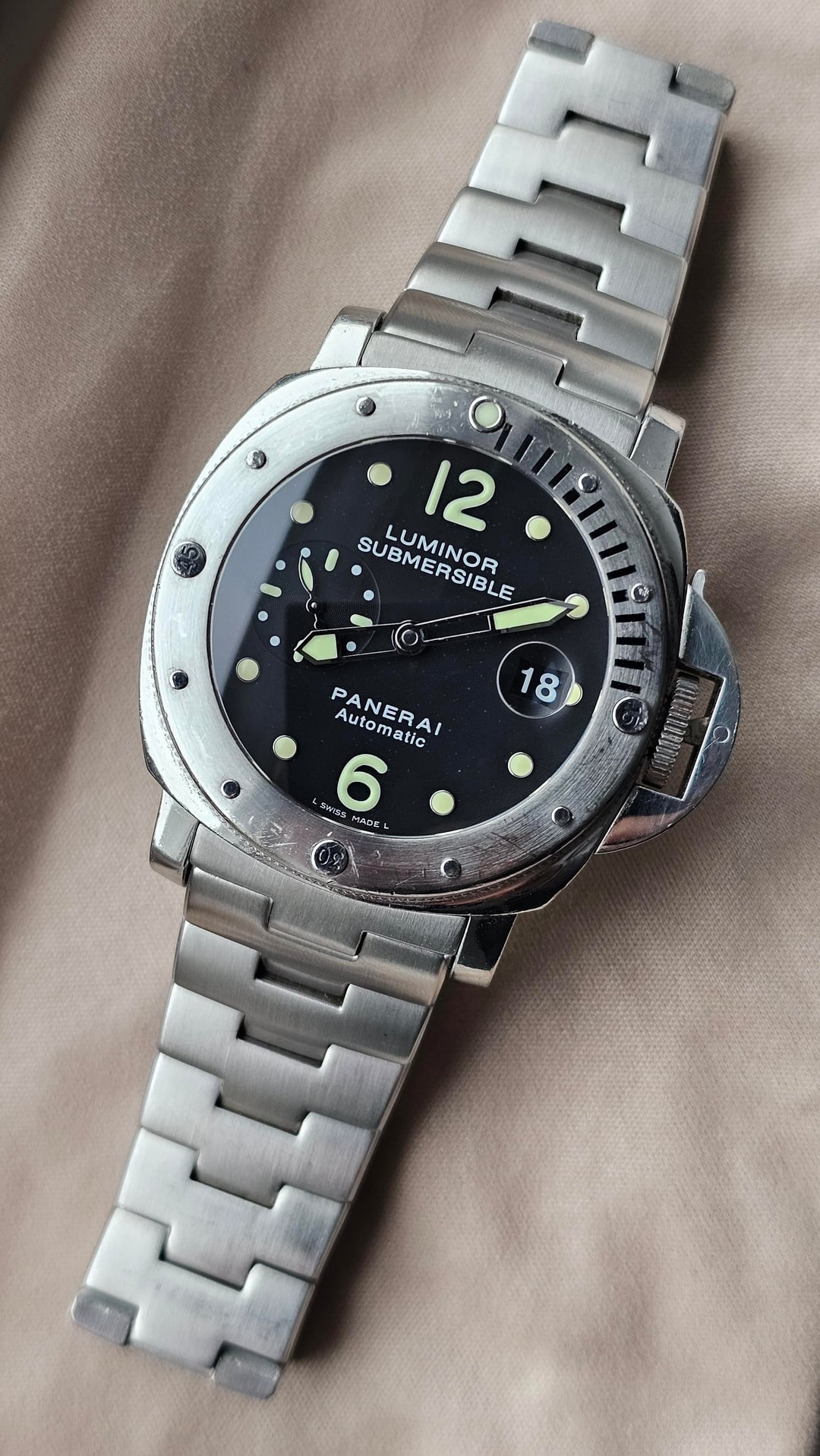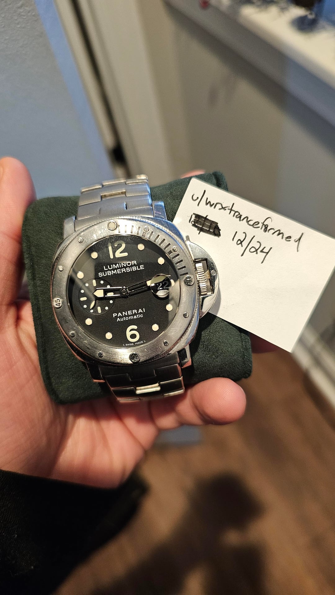 Hey folks! For sale is a really cool, classic neovintage Panerai, the Luminor Submersible Automatic Acciaio (PAM00024)! This is a rough and tumble, no nonsense dive watch from the glory days of Panerai – before their movements were full of shortcuts and plastic parts. With a 44mm case and 300m water resistance, this beast is ready to go anywhere you take it. It is powered by the caliber OP III automatic movement. Condition wise this one is well-loved and well worn! The case appears unpolished - There are hairlines, swirls and light scratches all over the circular brushed bezel and polished case surfaces. The crystal appears clean and free of any nicks or scratches. There are a few light micro dings in the case but the most noticeable is above the lug on the case at 4 o’clock. The OEM original bracelet should fit a 7” wrist and has desk diving marks throughout. The movement appears to be running strong – I clocked it at 7sec/day on my timegrapher app but your mileage may vary. This watch does not need to be babied or fussed over, strap it on and take it on your next adventure! The watch will come with a Panerai travel roll and two extra straps – one OEM Panerai white camo strap (no buckle) and a two stitch suede leather strap. I will also include a printout of the [Panerai.com](http://panerai.com/) database serial lookup for this watch. Timestamp for Reddit: [https://preview.redd.it/wts-panerai-luminor-submersible-pam00024-v0-ax7dg8xir59g1.jpg?width=1080&crop=smart&auto=webp&s=3a325eefe58455187be09eda3fbe4f8fb9e4dc7f](https://preview.redd.it/wts-panerai-luminor-submersible-pam00024-v0-ax7dg8xir59g1.jpg?width=1080&crop=smart&auto=webp&s=3a325eefe58455187be09eda3fbe4f8fb9e4dc7f) I am asking $3,099 which includes fully insured shipping in the US. Not interested in trades at this time, trade offers will be ignored. Please message me with any questions or interest and thanks for looking!