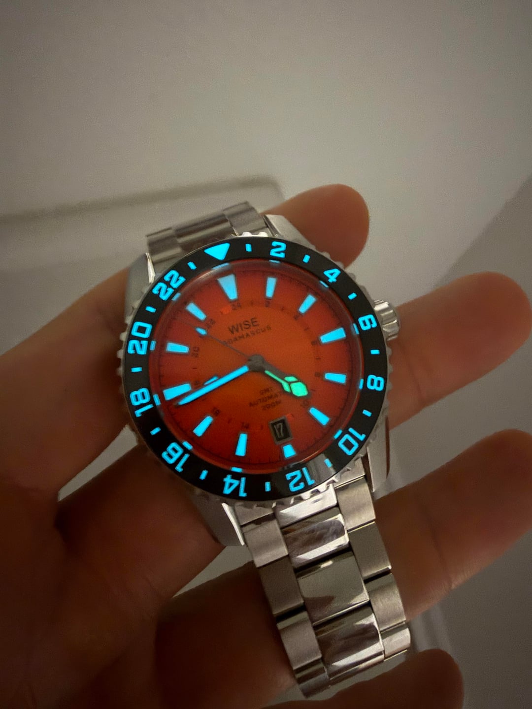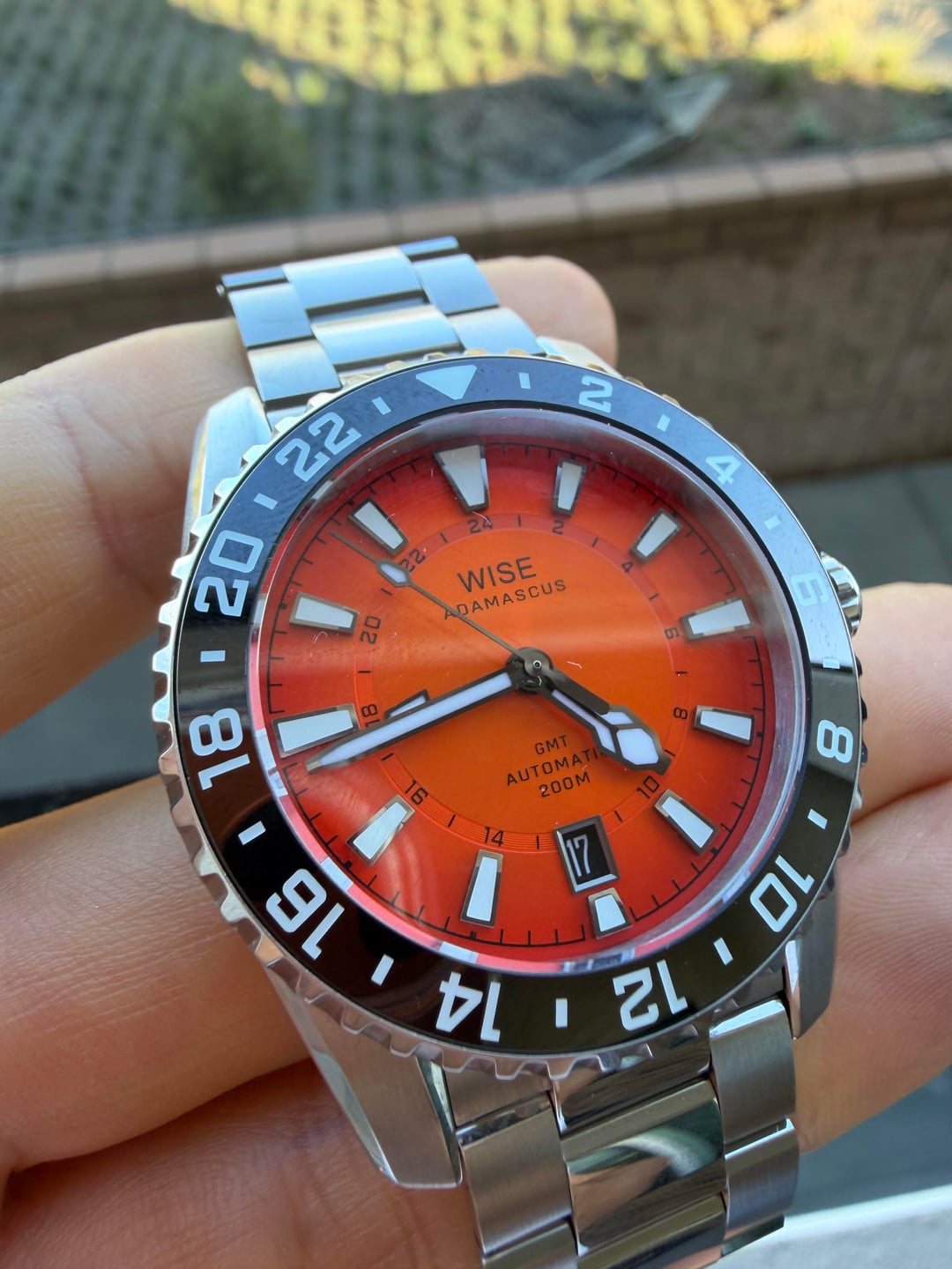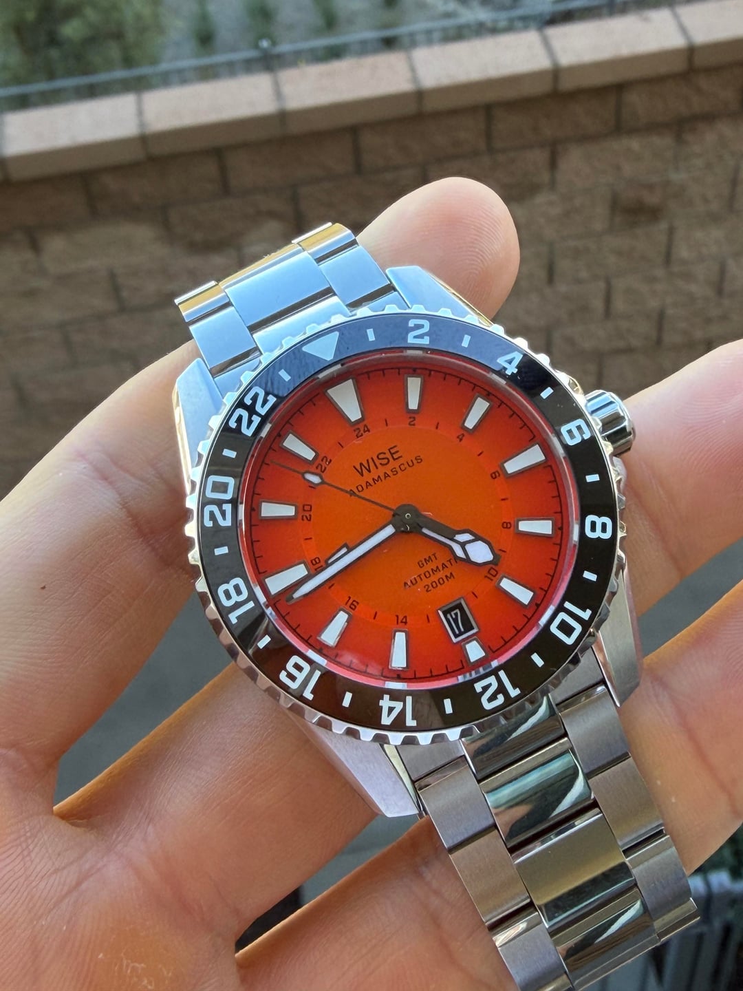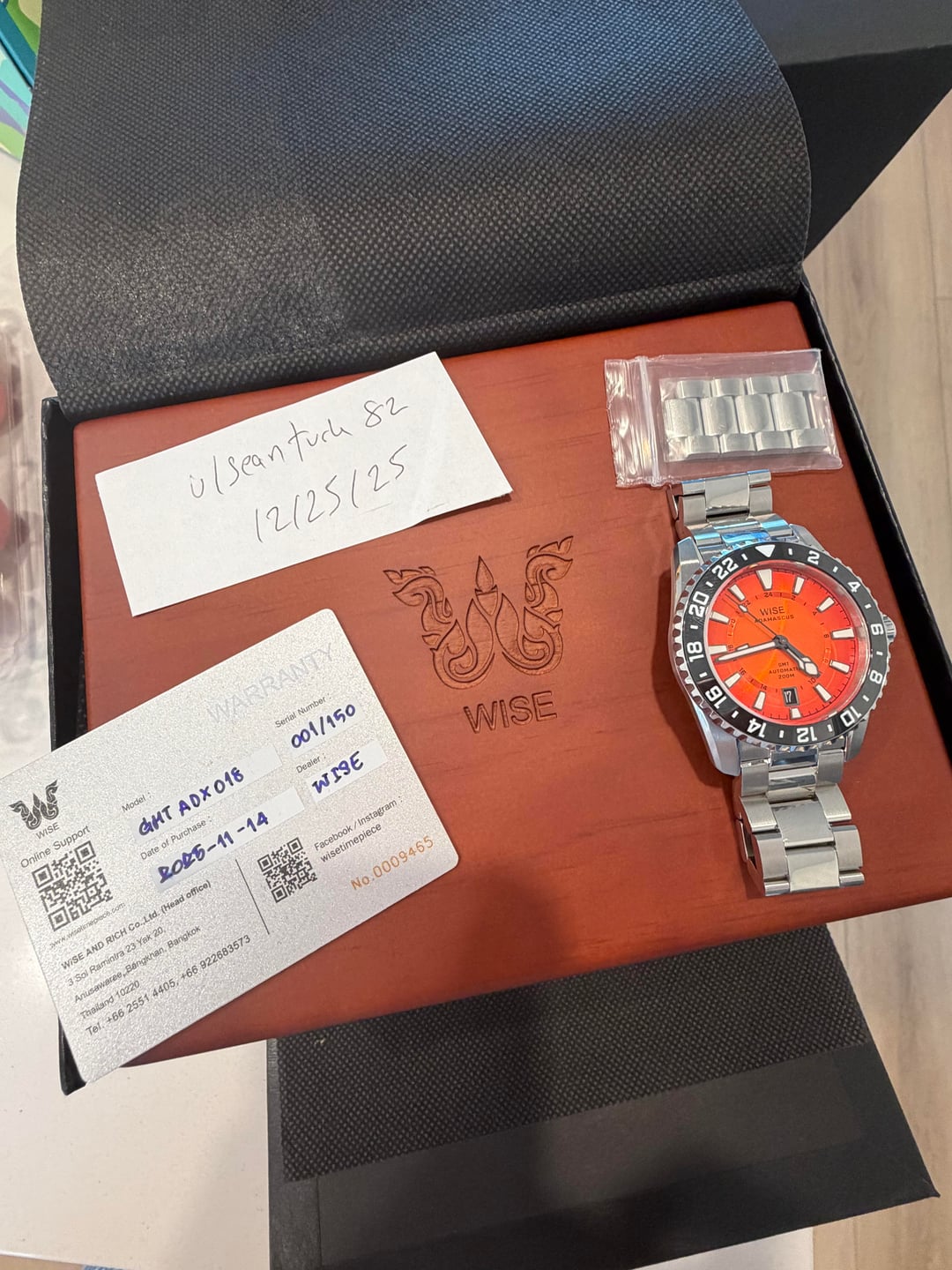 Merry Xmas family, I know I shouldn’t be selling watches during this time, but just wanted to put one out there as a special for today which is a very rare and limited piece by wise. A true GMT watch, it is absolutely phenomenal sunburst orange dial and comes as a full kit. 1/150 pieces ever made, very clean condition, full kit. Sized, worn a few times and ready to move. Price:$799 plus label Location: San Marcos, CA Payment: Venmo, Zelle, PP Friends and family only Includes, wise box, all links, card dated 11/14/25 Specs: DIAMETER: 40 mm. DIAL: Sunburst Gradient Orange CASE: Stainless Steel 904L GLASS: Sapphire crystal front/ back with inner AR coating BEZEL: Zirconia Ceramic (Black) BEZEL ACTION: Bi-directional, 72 Clicks LUG WIDTH: 20 mm. WATER RESISTANCE: 200m MARKERS AND HANDS: Gungrey STRAP: Stainless steel 904L ADJUSTMENT TYPE: Pull-Twist removal links (tool-less) bracelet LUMINOSITY: Super-Luminova BGW9 (Blue-green), GLW9 (Green) CALIBER: Cal. 9075 True GMT 28,800 bph, 24 jewels POWER RESERVE: 42 hours