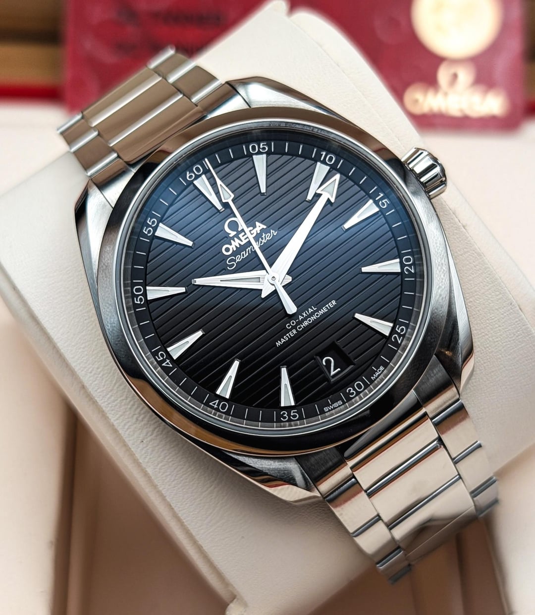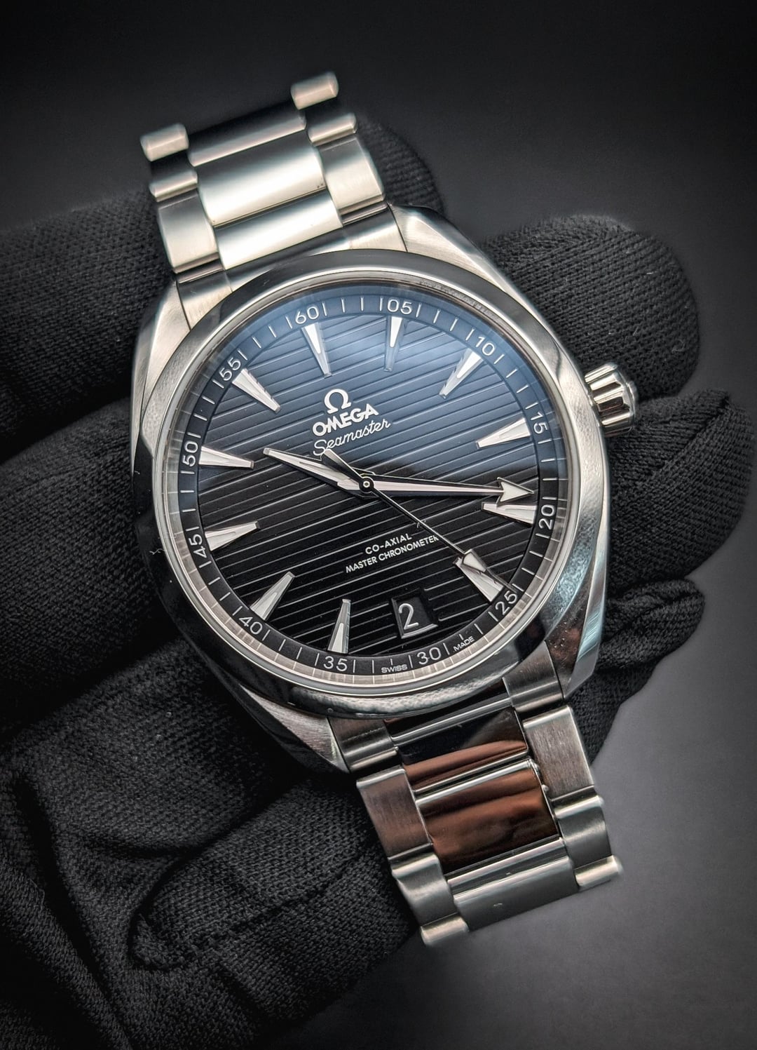 This is Omega’s cleanest flex — the Aqua Terra 41. It’s the brand’s quiet powerhouse: a watch that doesn’t need a helium escape valve or a lunar story to earn respect. Just razor-sharp finishing, a perfectly balanced dial, and one of the best movements Omega’s ever built. The black teak-pattern dial is pure precision — vertical lines like the deck of a yacht, catching light with that subtle luxury Omega never overplays. The symmetry is dial perfection, right down to the 6 o’clock date window. Underneath, the Master Chronometer Caliber 8900 hums along — METAS-certified, anti-magnetic up to 15,000 gauss, twin-barrel power reserve, and finishing that makes you actually flip the watch over just to stare for a second. The best part is this one comes as a truly versatile set on both Omega branded leather strap with deployant and bracelet. You can pick it up today as a full set for $4250 insured and shipped to your door. Brand: Omega Model: 2023 Aqua Terra Black Teak Dial 41mm full set w/ Bracelet and leather deployant Reference: 220.10.41.21.01.001 Case Size: 41mm Year: 2023 Comes as: Complete set with watch, OEM leather strap with deployant, OEM Bracelet,extra links , outer and inner boxes, warranty card, pictogram and chronometer certification cards, manual Condition: Excellent condition with minor wear from normal use on polished portion. Price:$4,250 Image Gallery: [https://postimg.cc/gallery/G9jqBgR](https://postimg.cc/gallery/G9jqBgR) Timestamp: [https://postimg.cc/SYkQTj64](https://postimg.cc/SYkQTj64) Open to trades or purchase of: Modern Rolex, Tudor, Omega, Cartier, Breitling, Grand Seiko, IWC, Zenith. Payment Methods: Zelle or Wire. Paypal FF, Venmo and stable currency crypto available for established buyers