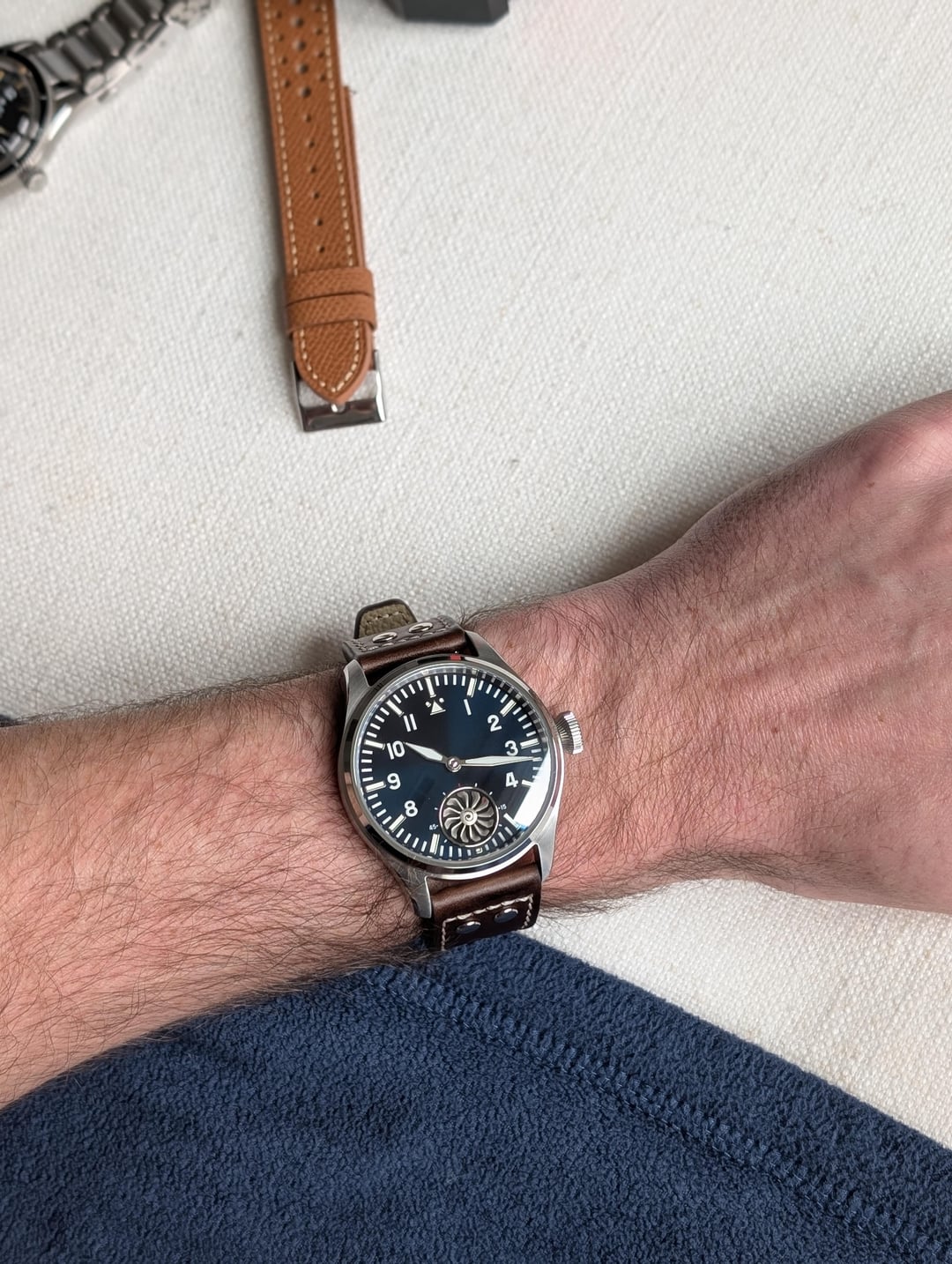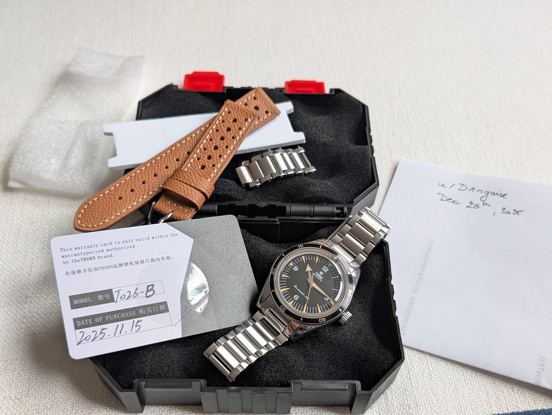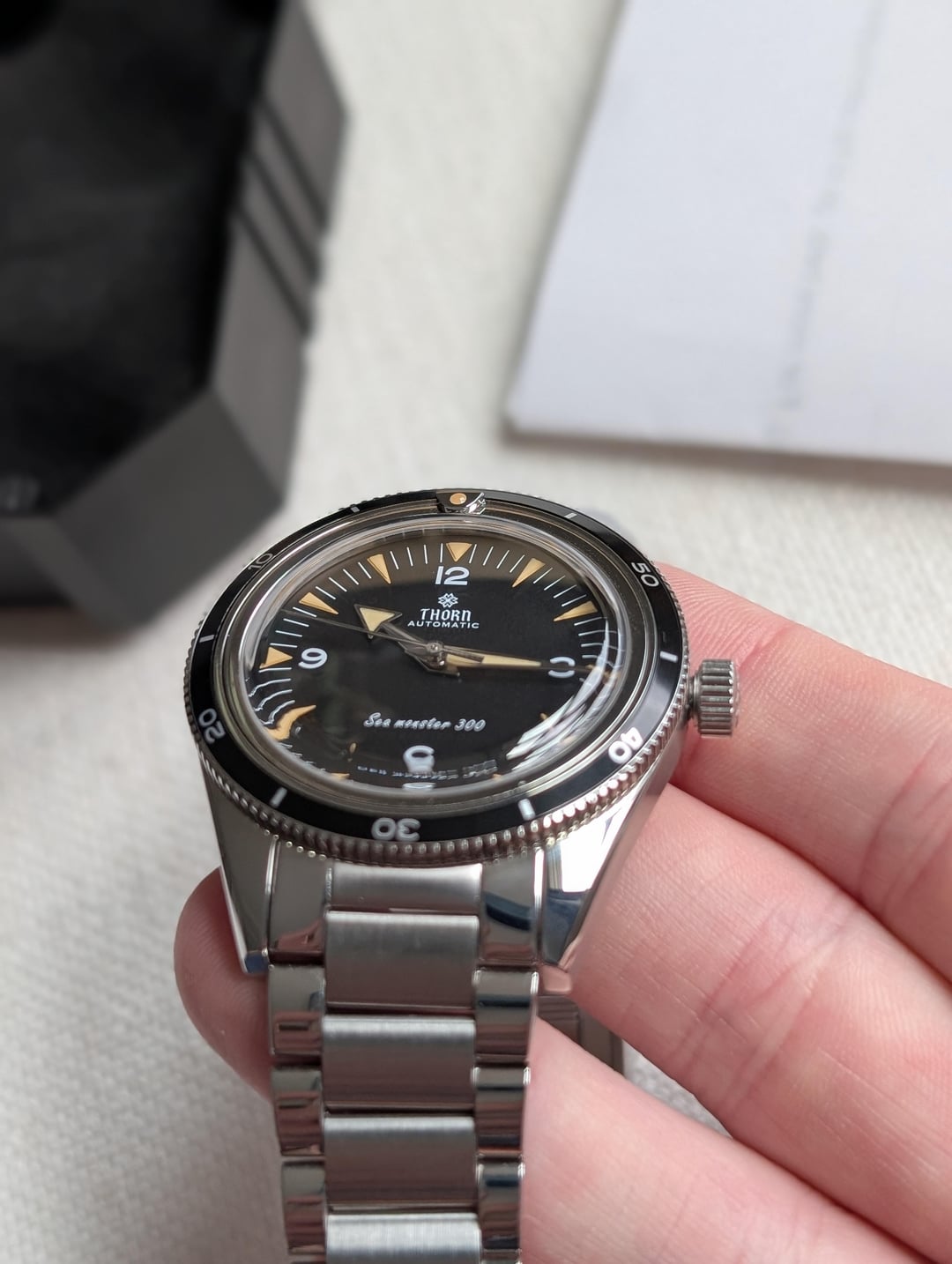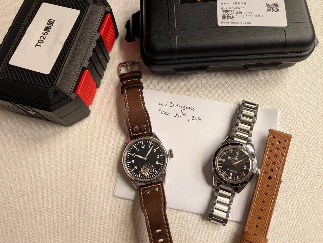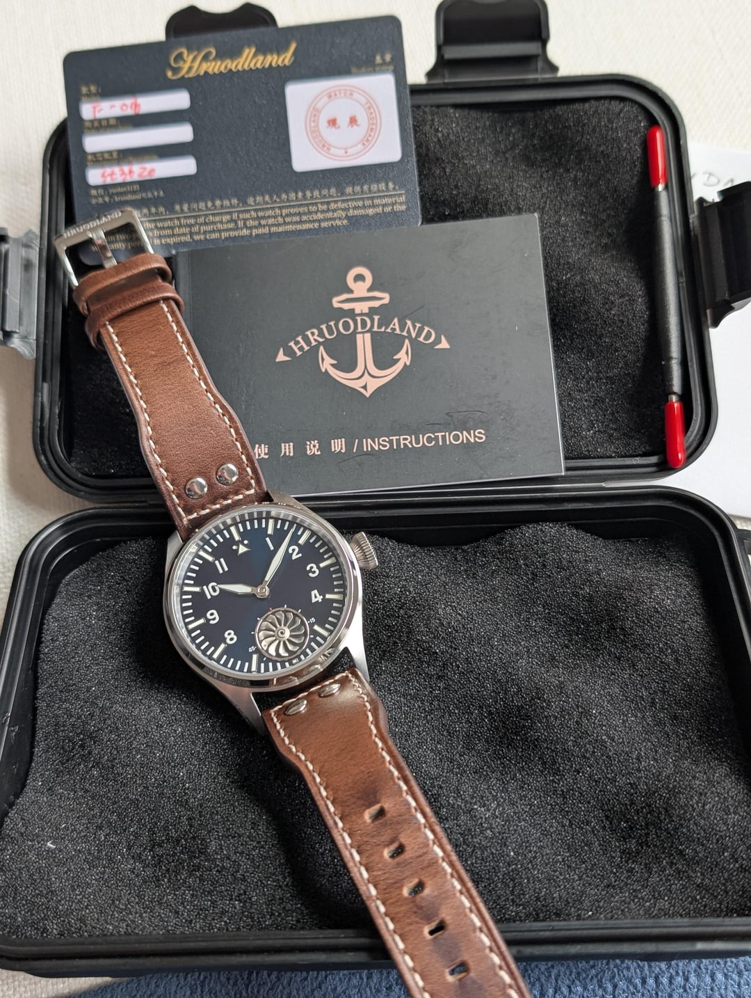 Up for sale are 2 of my watches that aren't getting the wrist time they deserve, so I'm hoping to re-home them to a more loving space (all in the Christmas spirit of course). All watches are for sale within the US, accepting PayPal, venmo, or Zelle. Happy to do PayPal g&s if you cover the 3% fee. Shipping with USPS ground advantage included in asking prices. Thorn T026 SeaMonster. A homage of the omega reissue, this one blends vintage vibes with modern materials and features. Boxed sapphire, OTF clasp, quick release bracelet, PT5000 inside, all the good stuff. 38mm, 12.3mm thick, 19mm lugs. Full specs in the link below. Lovely piece of watch, but I'm not clicking with it. Comes with full box, all links, warranty card, and an extra 19mm brown leather strap that's not been used it. It seems to be sold out on AliExpress and Thorn's website now too. Asking $160 shipped within the US or best offer Link: https://www.thornwatches.com/products/thorn-38mm-automatic-watch-1950s-tribute-collection-t026?variant=48942832025908 Hruodland F016: this one homages the Big Pilot from IWC, and knocks it out the park. The seconds hand is a spinning turbine, the deep blue sunburst dial is subdued until it pops in the right light. Lovely piece of sapphire on top, crisp winding from the seagull manual movement in the back. It's a bigger watch at 43mm and 22mm lug width, but the short L2L makes it wearable for wrists 6.5" and up. Comes with the box, warranty card, and strap tool. Strap is just barely broken in, quite a stunning watch Asking $115 shipped within US or best offer Link: https://www.thornwatches.com/products/hruodland-36mm-st3620-mechanical-men-watch-f016