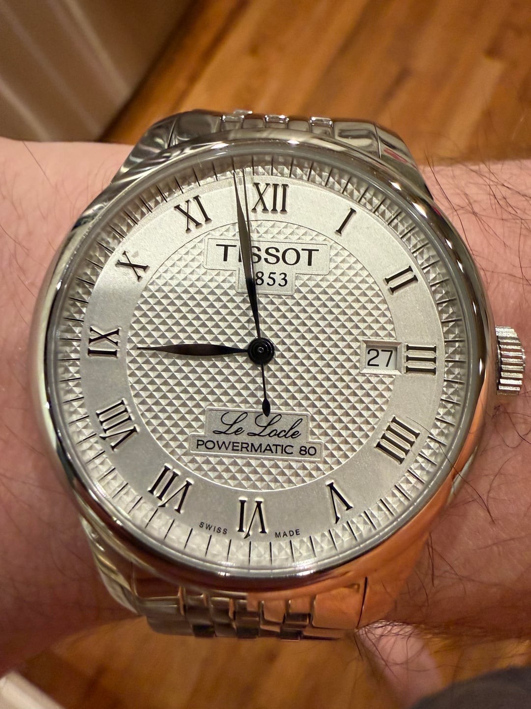 For sale is my Tissot Le Locle Powermatic 80, reference T006.407.11.033.00, silver dial on stainless steel bracelet. I purchased this brand new in May 2024 and have worn it roughly 10 times total, so condition is excellent with only very light signs of wear and no major scratches or dents. Full album: [https://imgur.com/a/JkDjFtk](https://imgur.com/a/JkDjFtk) Timestamp: [https://imgur.com/a/GaAHDm3](https://imgur.com/a/GaAHDm3) What’s included: * Watch head and stainless steel bracelet, currently sized for my wrist * All removed bracelet links * Inner Tissot box and outer sleeve * Serialized white hang tag * Booklet/paperwork Basic specs: * 39.3 mm case, automatic Powermatic 80 movement, date at 3, exhibition caseback, 30 m water resistance. Price: $425 (net to me) * Payment via PayPal G&S * Ships insured via USPS to CONUS from New York A quick note on credibility: This is my first sale on r/Watchexchange, but I have a long‑standing eBay account (username: du05030131) with 100% positive feedback and activity going back to 2008. I am also happy to do a brief FaceTime call before payment so you can see the watch “live” and feel comfortable proceeding. No trades at this time. Please comment before sending a PM so I can keep track of interest.