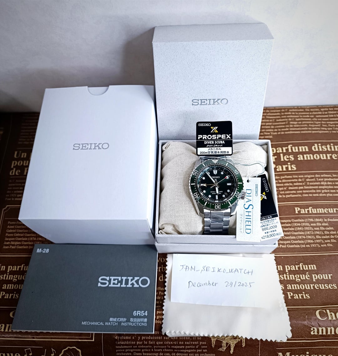 For sale is the Seiko Prospex SBEJ009 GREEN MM200 GMT, a model exclusively released for the Japan domestic market. This piece features a beautiful green dial with a light-reflecting texture that mimics sunlight penetrating deep ocean water. The gold GMT hand stands out perfectly, adding a luxurious and eye-catching touch. Specifications: Case size: 42mm diameter, 12.9mm thickness, 48mm lug-to-lug. Movement: Automatic 6R54 GMT, 72-hour power reserve. Water resistance: 200M Condition: Brand New (full set: box, papers, product card). If you have any questions, feel free to message me! Images/Video: Included in the post! Pricing, Payment & Shipping: Price: $1200 (shipping not included). No trades please! Payment methods: Wise, PayPal F&F or PayPal G&S (+4.6% fee). Shipping: FedEx Express 2–4 days, $50–$80 worldwide. Thank you!