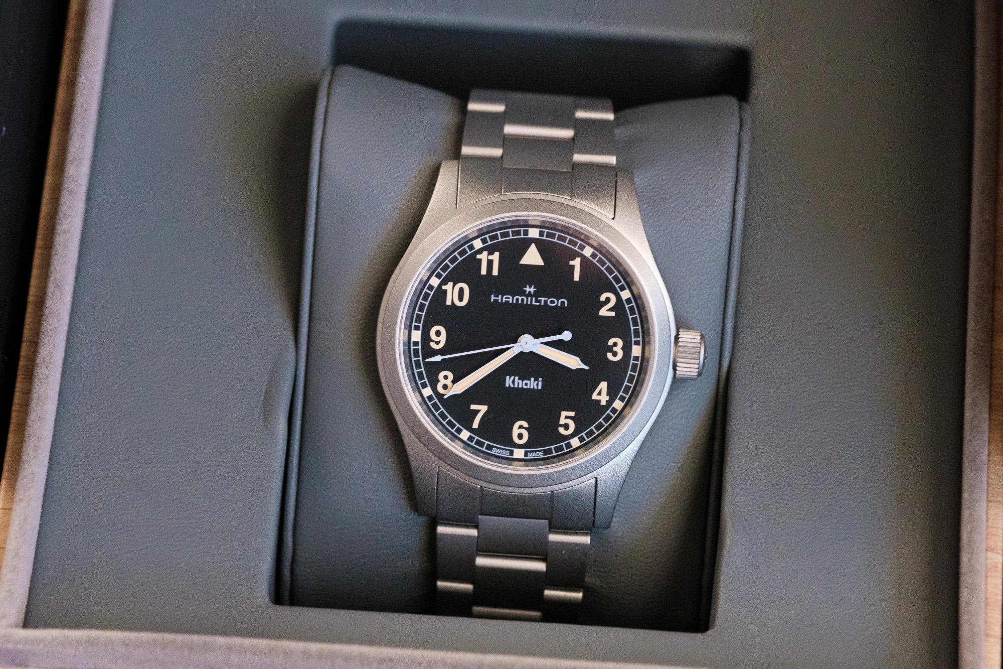 Next up in my collection sell-off is my 38mm black dial Hamilton Khaki Field Quartz (H69401131) in like-new condition. It shows zero signs of wear and is the closest thing you'll find to an unworn Khaki Field Quartz at a steep discount from new. Nothing to note whatsoever about its condition, but let's conservatively call it a 9.5/10. The sale includes the watch with matching bracelet, a Hamilton NATO, original boxes/manuals, and a travel case. I'm asking $340 shipped in the USA. **You can find photos and a timestamp** [**here**](https://imgur.com/a/6PPP8tJ)**.** Any questions, please ask!
