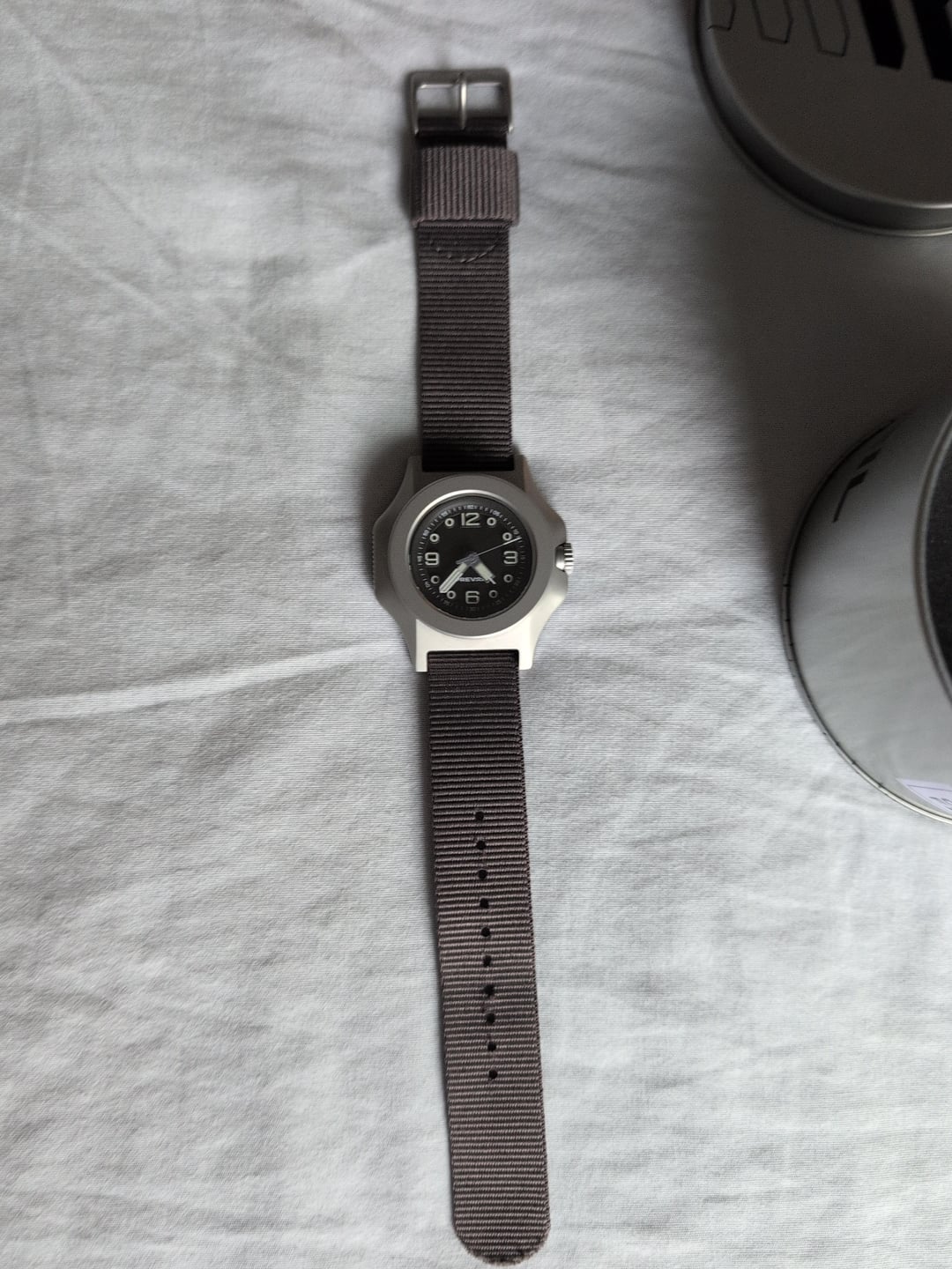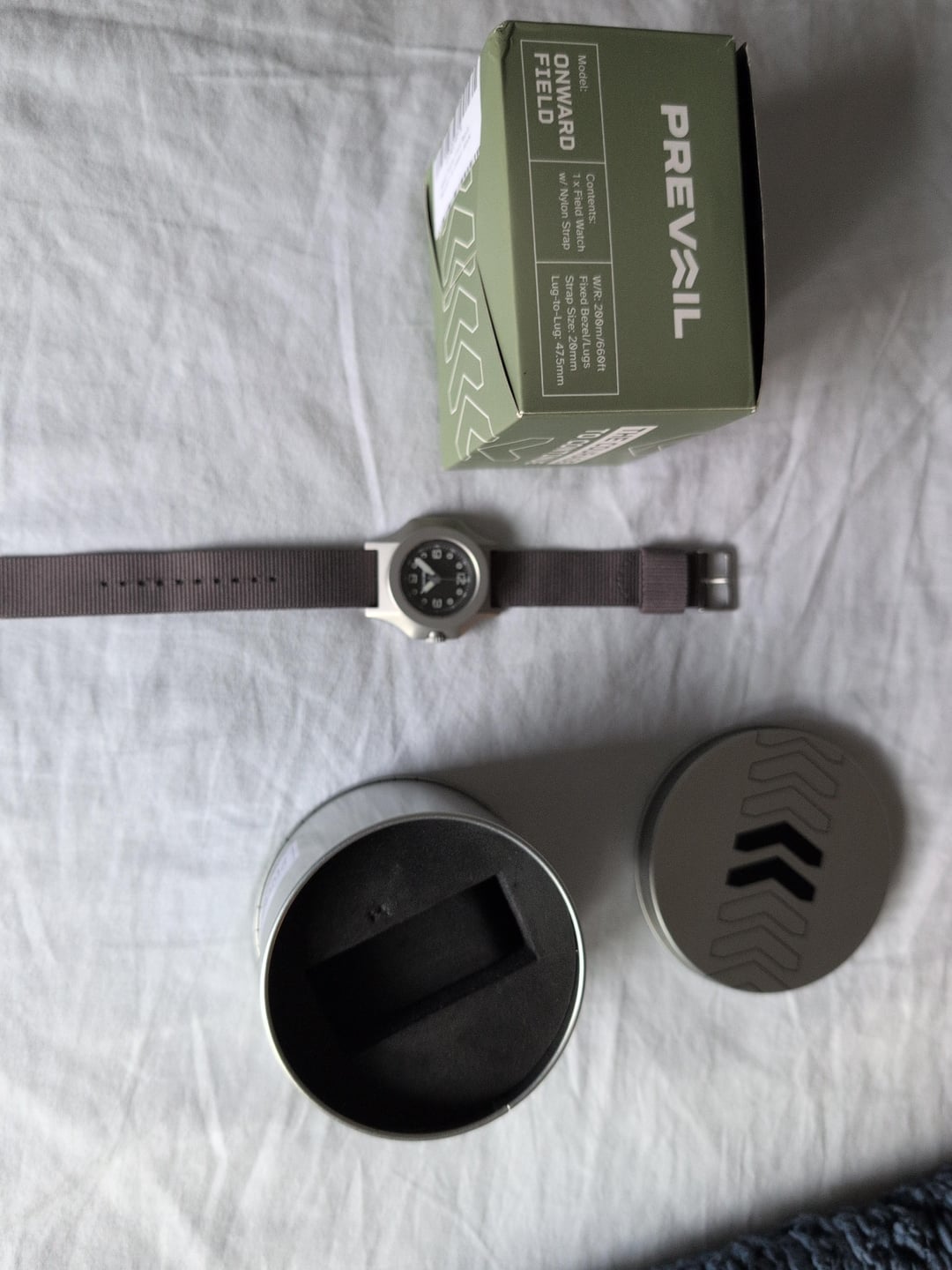 Prevail Onward Field Watch – Excellent Condition Price: $100 OBO For sale is a Prevail Onward Field Watch, a rugged, minimalist field watch designed for everyday wear. Features a matte bead-blasted case, clean black dial with high-contrast Arabic numerals, and a durable nylon strap. Wears comfortably and has a classic military-inspired look. Specs & Details: Fixed bezel field watch design Approx. 42mm case (lug-to-lug ~47.5mm) 20mm lug width Durable nylon strap included Clear, easy-to-read dial Lightweight and comfortable on wrist Comes with original Prevail tin and box (shown) Condition: Very good overall condition. Light, normal wear consistent with careful use. Crystal is clear; strap and case present well.