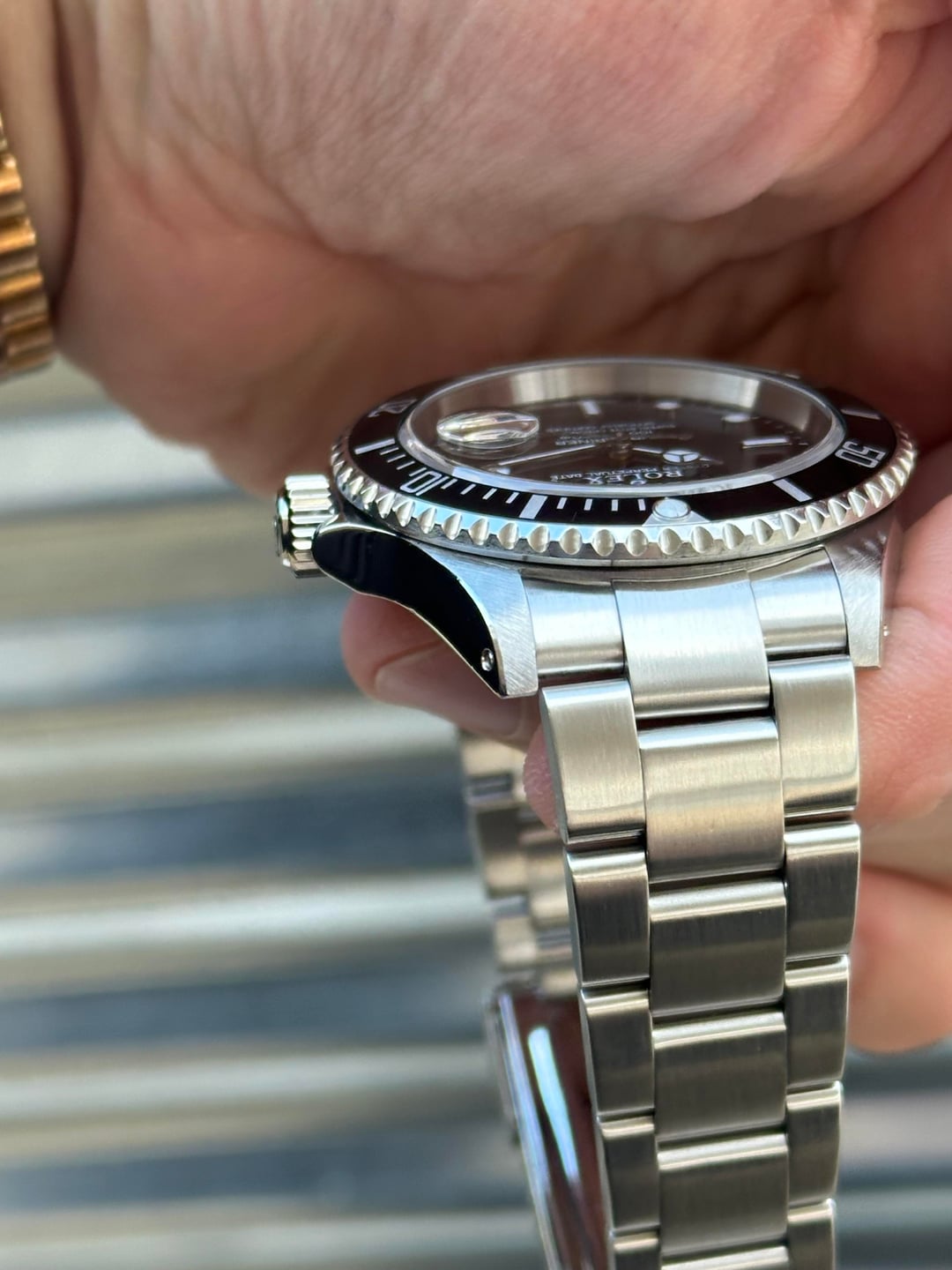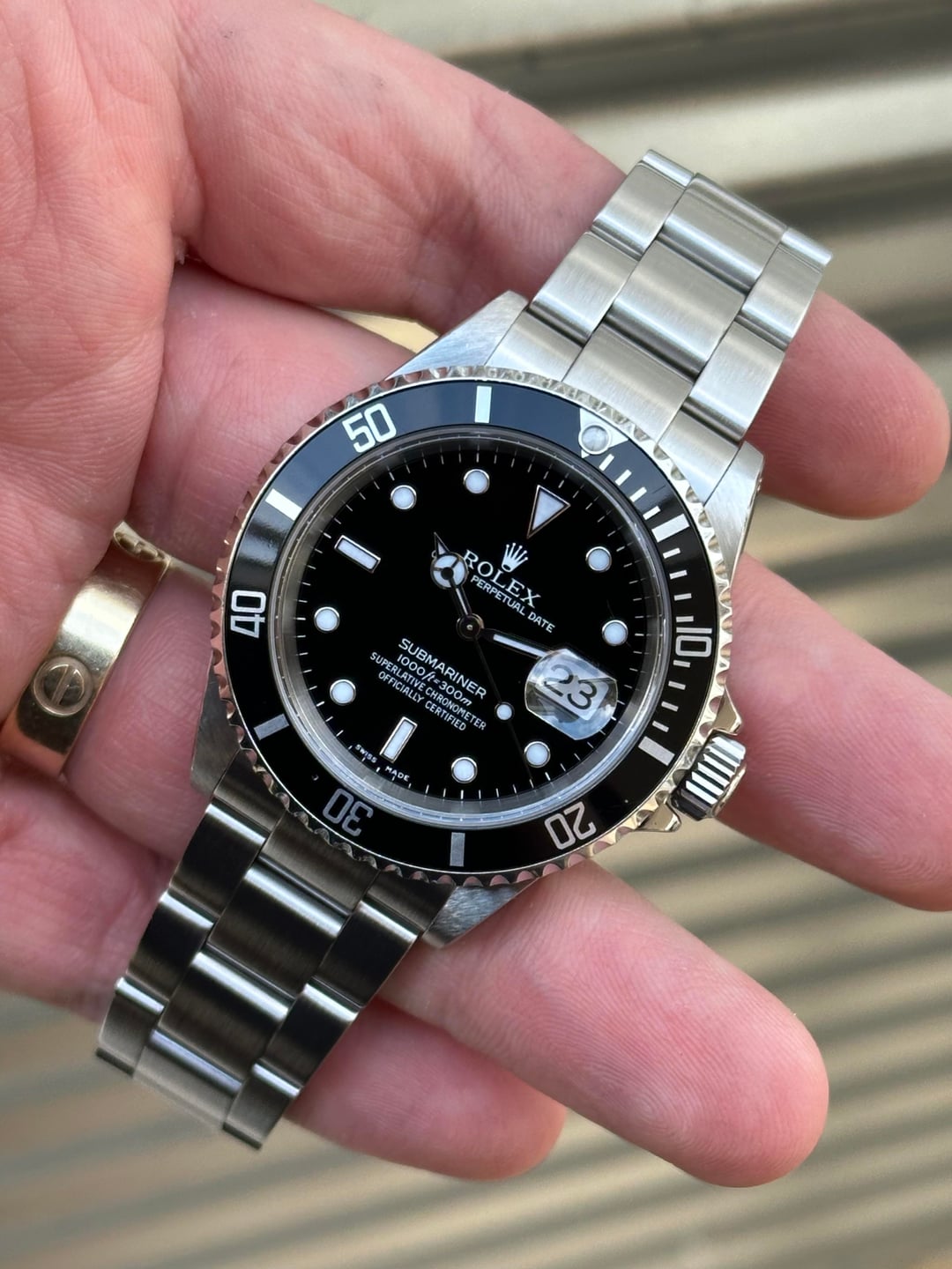 This is the iconic 16610 Rolex Submariner Date from 2000. Not only is this one of the most recognizable luxury watches ever made, but it’s also the best blend of neovintage and modern features, with its holes case, and solid end link bracelet while maintaining the black aluminum bezel and OG design. Not only does it come with box and papers but it also has multiple service cards! Reference number: 16610 Serial number: P*****-Serial dating it to 2000 RLX SERVICE CARDS DATED 2006 & 2014 💰9️⃣,8️⃣0️⃣0️⃣➕✈️ COMES with BOX , PAPERS & SERIAL HANG TAGS ( see second picture for everything that’s included ) The watch is in excellent pre-owned condition - see pics for details. Clean luminova dial and hands, along with a matching luminova bezel, which both still glow. Case is sharp with thick lugs and sharp edges. Crystal is free of scratches or chips. The aluminum bezel insert is clean. Coronet is thick and well defined. Bracelet remains pretty tight with a clean finish on the links, free of any major scratches or dents. It comes with 11.5 links on the bracelet and it fits about a 7.5-7.75inch wrist. 💰9️⃣,8️⃣0️⃣0️⃣➕✈️ We accept Zelle/Wire. Shipped with fully insured overnight once payment clears, NO EXCEPTIONS. We have plenty of references across different platforms. Follow me on IG for more deals: @215watches [photo album](https://imgur.com/a/amVhkk1) [time stamp](https://imgur.com/a/fs59lrB)