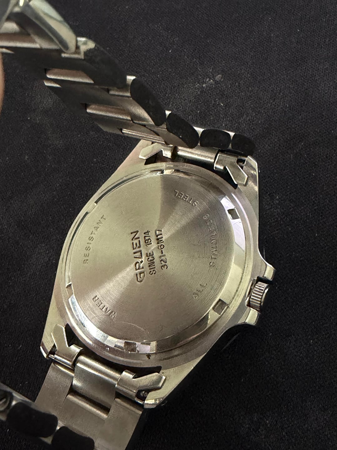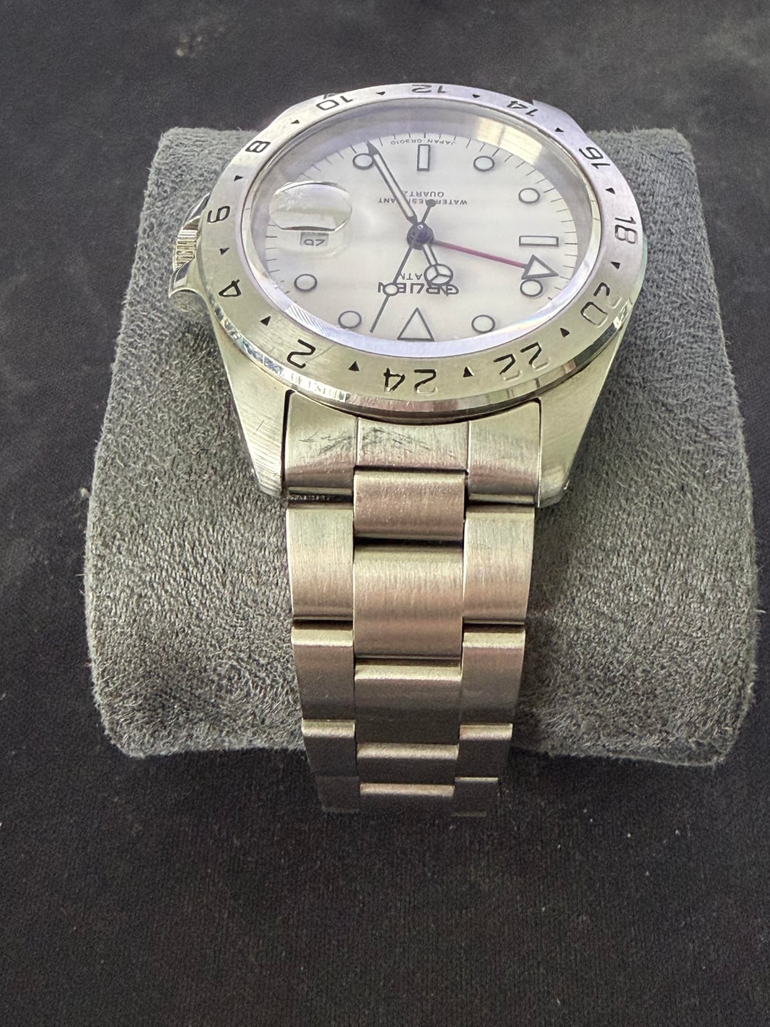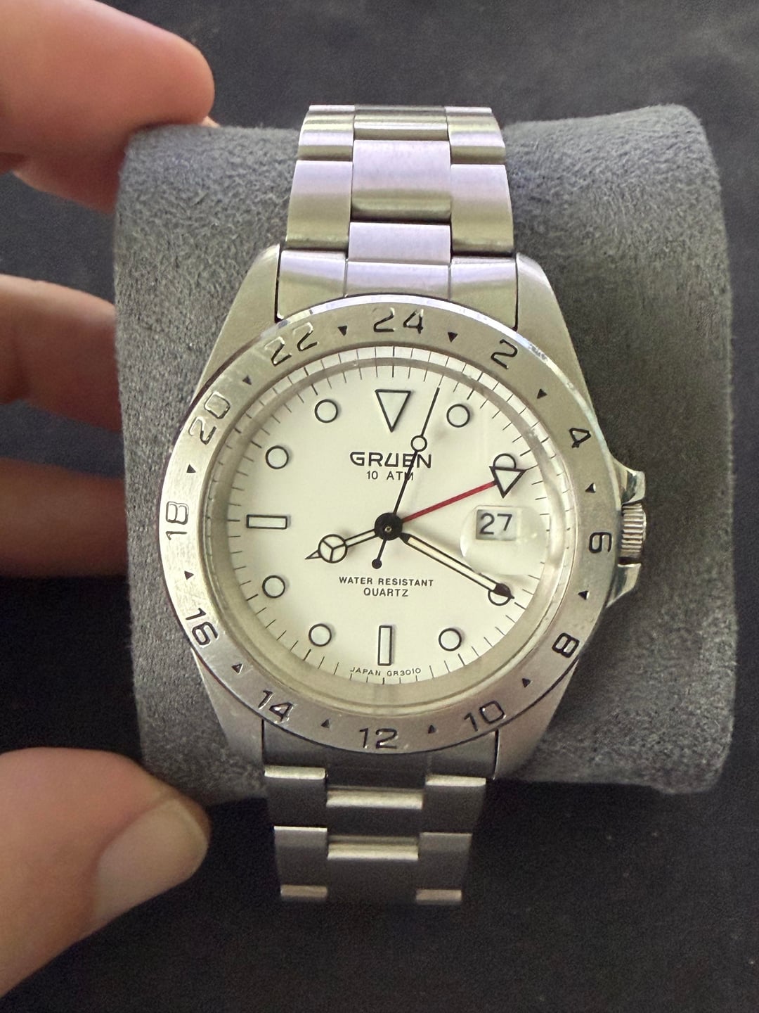 Hi all, Another cool vintage watch that just does not get the love it deserves. The Gruen 39mm is a Quartz Explorer II Style GMT Watch with a Polar Dial. I think this came out in the 1990s. Has an aftermarket bracelet on but I also have the original bracelet however, the bracelet was damaged upon me receiving it, maybe you can fix it where I could not. Watch does have some wear as shown in the photos, but still works perfectly. Looking for around 350. PayPal goods and services.