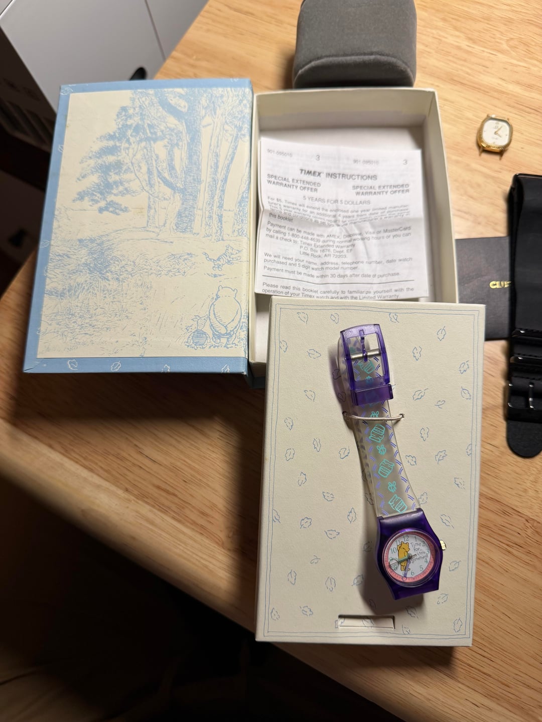 Cleaning out some old watch items and wanted to see if anyone would be interested in these. The watches are not working. - Omega Deville Quartz 1387 (no crown or strap) - Timex "Classic Winnie the Pooh" Storybook Edition (the hands are loose and the crown does nothing) - Cluse 20mm black leather nato strap with two quick-release spring bars - G-Shock warranty card - Generic watch box with black pillow - Generic grey watch pillow Asking $50 shipped and insured (CONUS). Will accept PayPal F&F, Venmo F&F, or Zelle. Thanks!