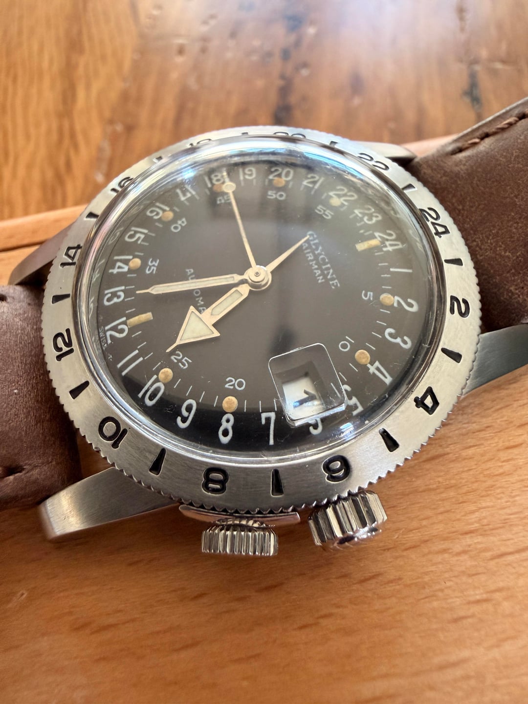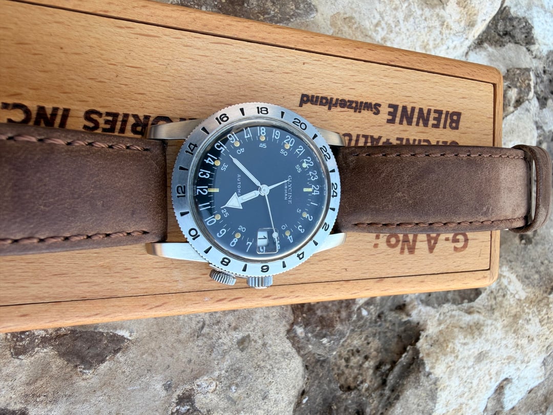 $3150 + Shipping CONUS ONLY. An actual vintage unicorn. Original 1960s (mid 60s) Glycine Airman. Incredibly clean original Tritium dial. Hacking seconds is intact and functional which is exceptionally rare. Original box included. Serviced 6/25. Fully original crystal has been refinished very slightly. There is a tiny amount of crazing on the crystal, but it is almost never noticeable even for a perfectionist. Only trade considered would be for Rolex or IWC (must have steel bracelet).