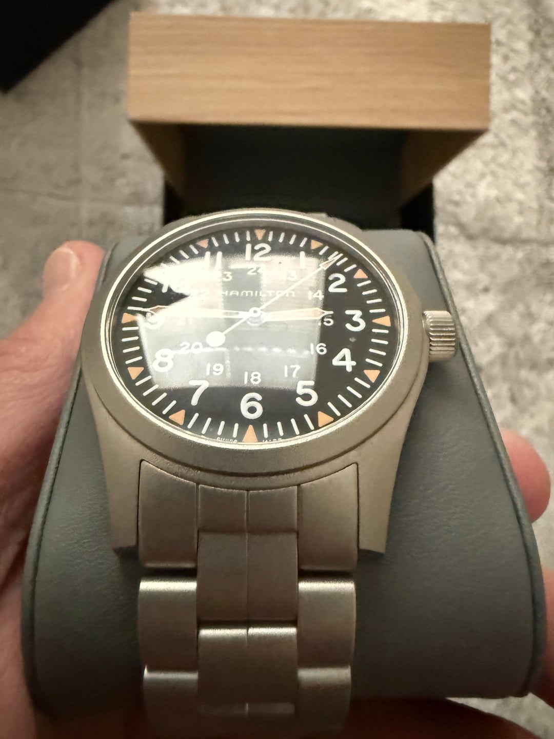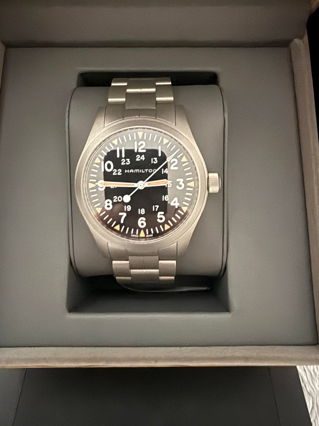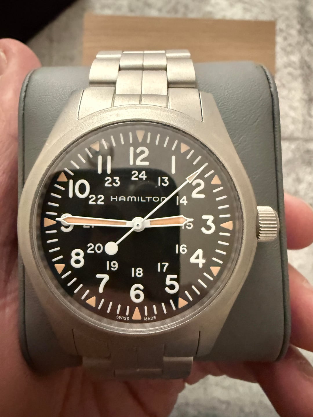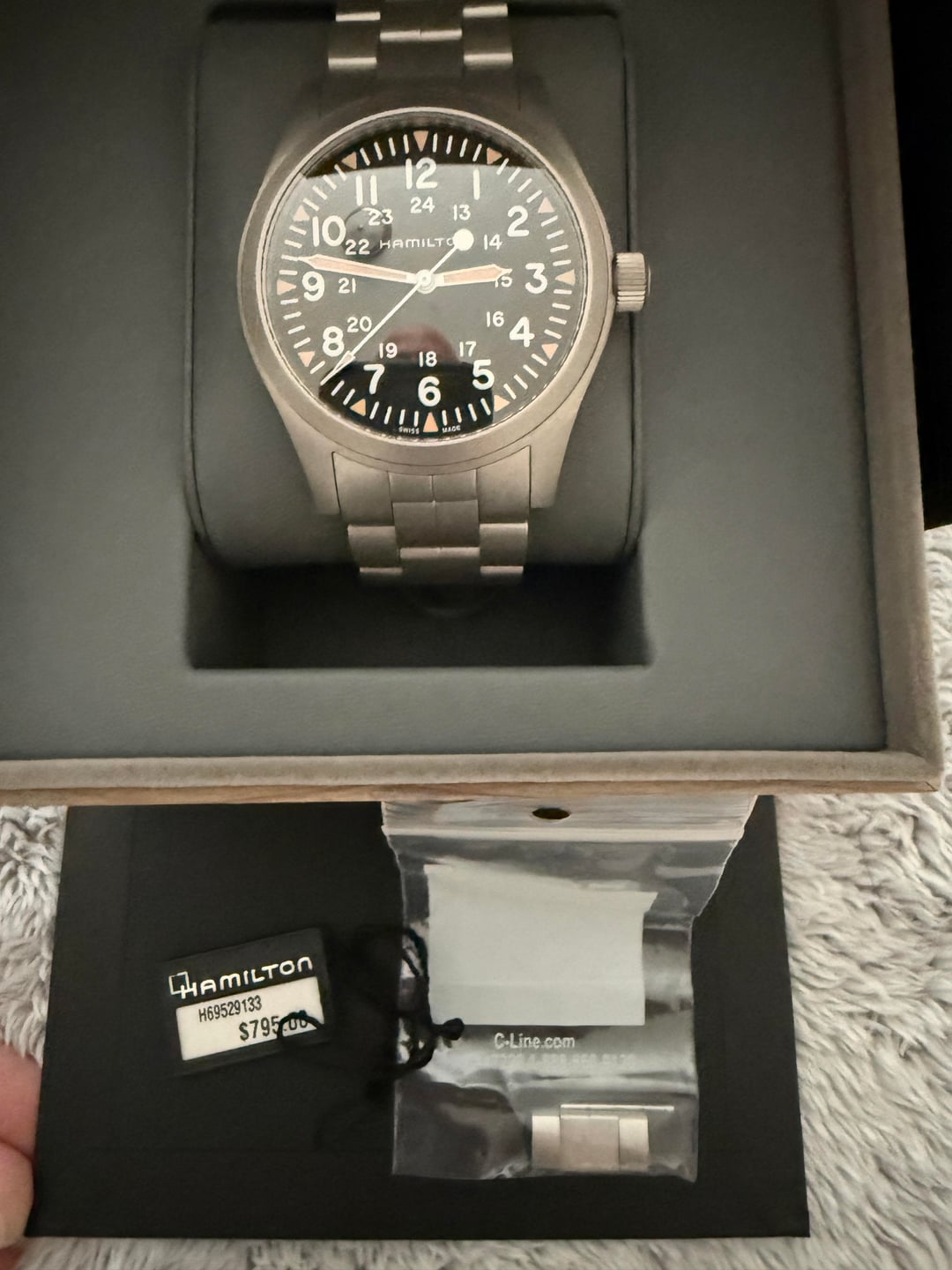 Hey WatchEx! Up for grabs is a Hamilton Khaki Field Mechanical 42mm on bracelet. It’s in great shape and comes with full kit including box, manual, warranty card, all links, and hang tag. Asking $400 obo shipped in conus. I’d prefer to sell but I’ll consider trades at a trade value of $450. Thanks!