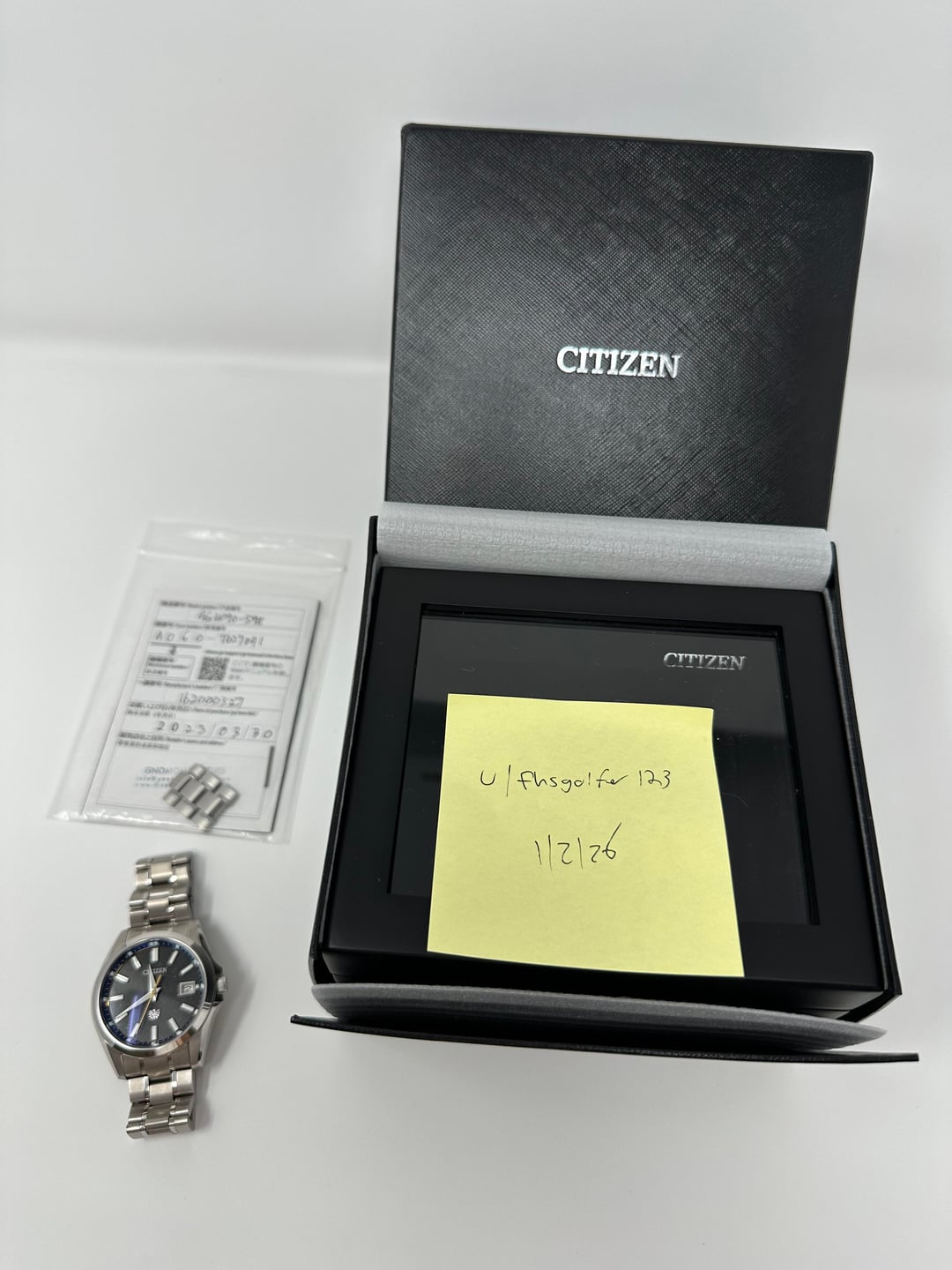 I am reluctantly letting go of my baby to fund my chase for my ultimate grail, a Speedy. For sale is my Citizen “The Citizen” Chronomaster, model AQ4090-59E. This is a JDM only limited edition numbed to 400. I’ve called this the “sky of stars” model based on the marketing materials I can find from Citizen Japan due to the jet black washi dial, gold glitter on the dial, and gold ring below the chapter ring. I’ve attached a screenshot of the translated materials from Citizen as well. On the dial, this model has a jet black dial, hand made washi paper dial, and gold glitter on the dial. The chapter ring is incredibly unique. It has a dark blue chapter ring with minute track and an additional gold ring sitting between the chapter ring and the dial. The indices, Citizen logo, and the Chronomaster eagle are all applied and float on the dial. This model is all titanium – bracelet and case – with duratect coating. The case has Zaratshu-level polishing, I seriously cannot believe they got titanium to polish and sparkle like this. I have a GS as well and the polishing is even better on the Citizen. Beautiful signed crown with the Chronomaster eagle. Case size is 40mm. Oh and obviously this model has the incredible Citizen A060 calibre accurate to 5 SECONDS PER YEAR. It is hard to capture the details in photos so here is a wrist roll video so you can see: https://imgur.com/gallery/chronomaster-vlInGq0 The watch is in beautiful shape, I have babied it. The only marks I can find are some light scratching on the back of the lugs from strap changes and a minor mark on the side of the case between 9 and 10. It comes as a full set with inner and outer boxes, warranty card, and extra links for the bracelet (fully linked). I’m asking $2,900 shipped and insured in CONUS. These almost never come up for sale being limited to 400 and a JDM only model. I accept Zelle only for most buyers (have been scammed on PayPal) but may consider other payment methods for well established buyers. The only trade I will consider is for a Speedy Pro (adding cash on my end). Other than that, no trades. I have a number of transactions on here, hundreds on eBay, and my own Etsy shop! Feel free to ping me for any references needed.