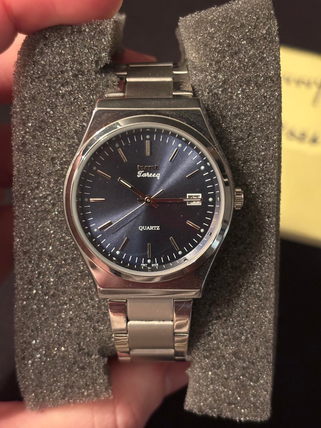 For sale is a pair of HMT quartz watches: the HMT Sangam Quartz and the HMT Tareeq Quartz, both from Hindustan Machine Tools (HMT)—one of India’s most historically significant watchmakers. These watches showcase HMT’s classic, understated design language and make excellent everyday wearers. The HMT Tareeq Quartz features a sunburst blue dial with applied indices, slim hands, and a framed date window at 3 o’clock. Clean, minimalist, and versatile, it works equally well dressed up or down. The HMT Sangam Quartz features a “graph paper” white dial with applied indices and a day-date display at 3 o’clock (with contrasting red Sunday). It has a vintage-inspired square case profile and classic proportions. Currently fitted on a brown leather strap, which complements the dial nicely. Also includes stock bracelet. Both watches are powered by reliable quartz movements, offering accurate, low-maintenance timekeeping. Condition on both watches is near new. No significant scratches or marks on the cases or crystals. Both are fully functional and keeping perfect time. Asking: Sangam $100 OBO Tareeq $150 OBO $215 both