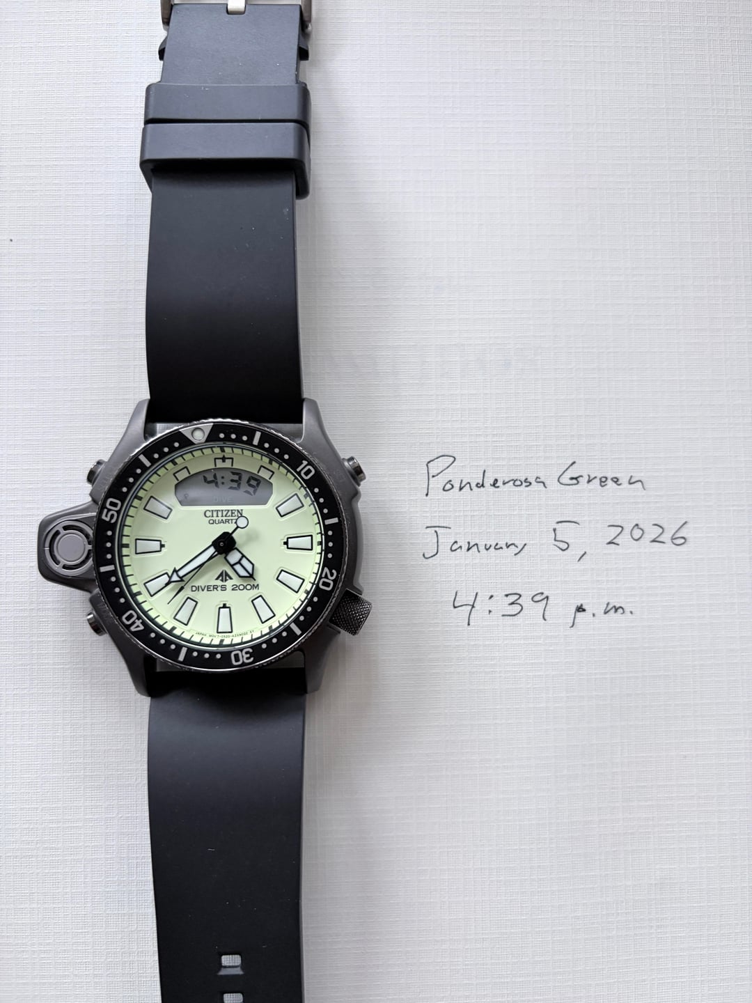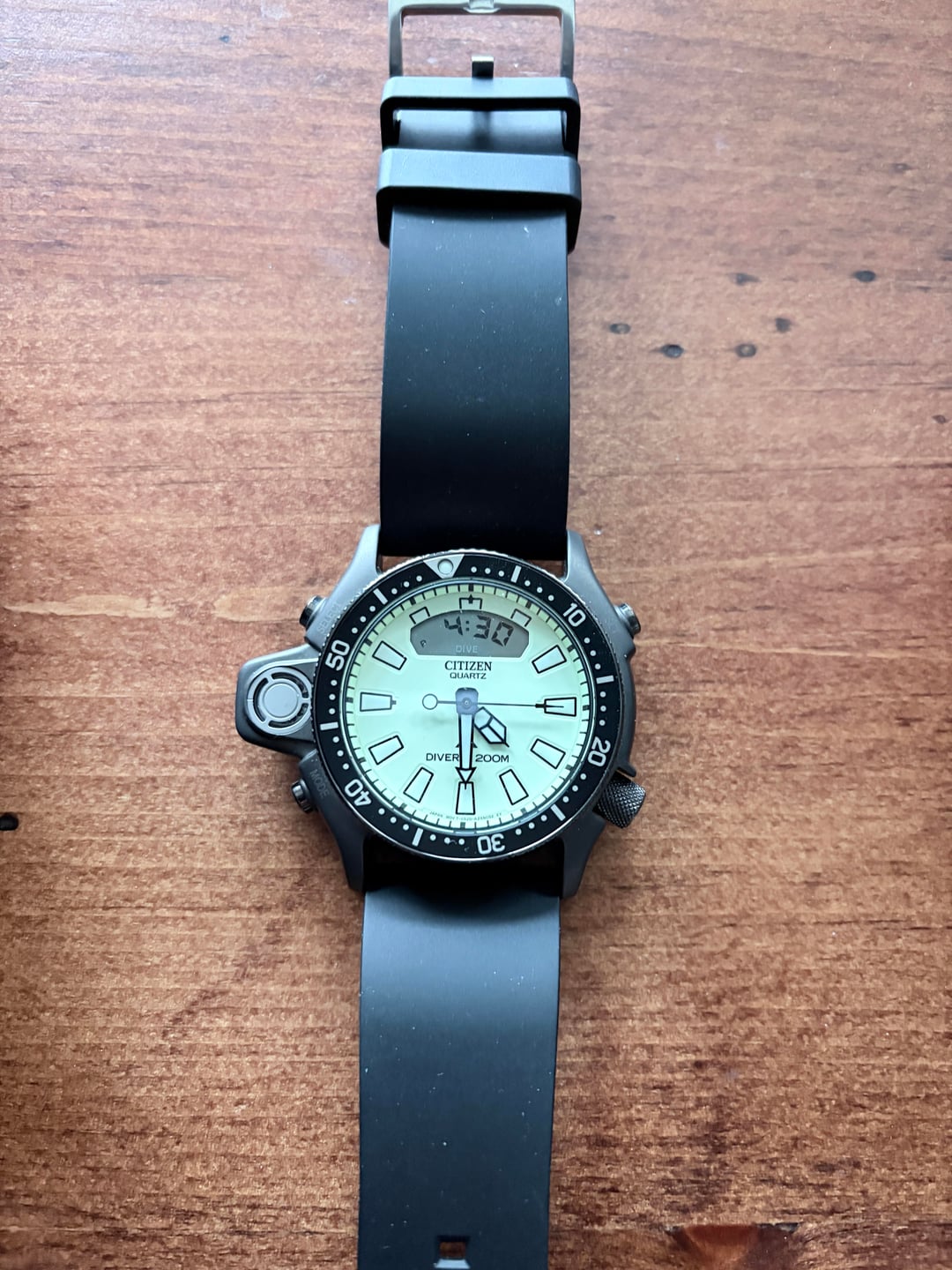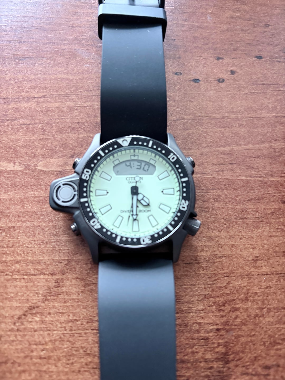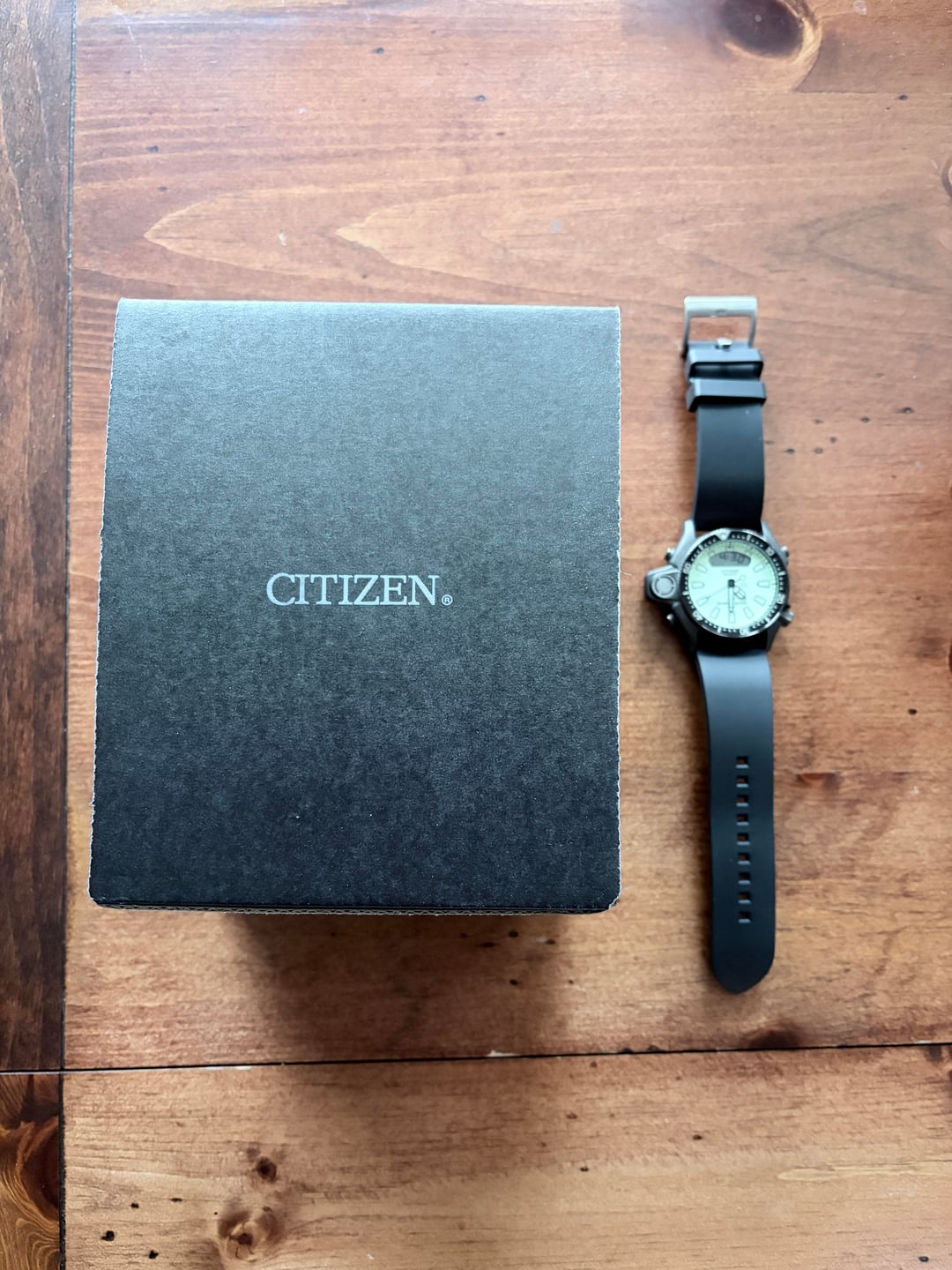 I am selling my Citizen Aqualand watch. It is in very good condition and functions perfectly. I am including an extra strap that is currently on the watch (and that I find to be extremely comfortable). As well as including the original strap and dive extension. The lume on this is insane - glows like a torch at night when charged. Comes with the original box and papers. Ground shipping to CONUS from Salt Lake City. Selling for $240.