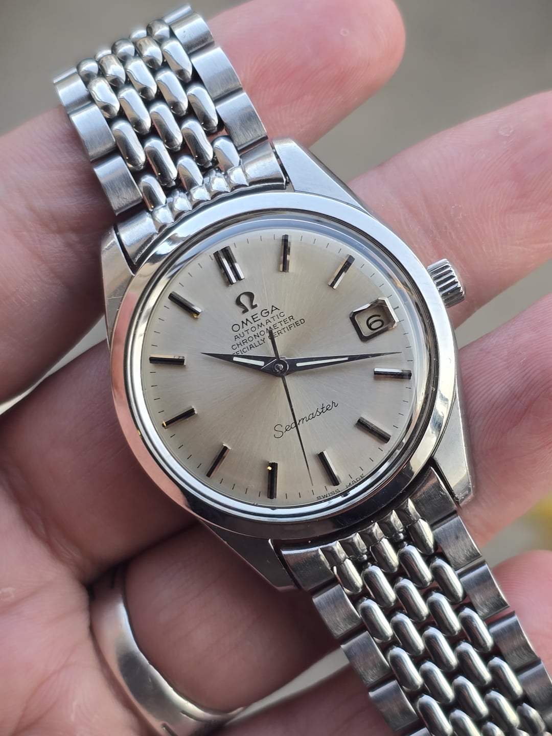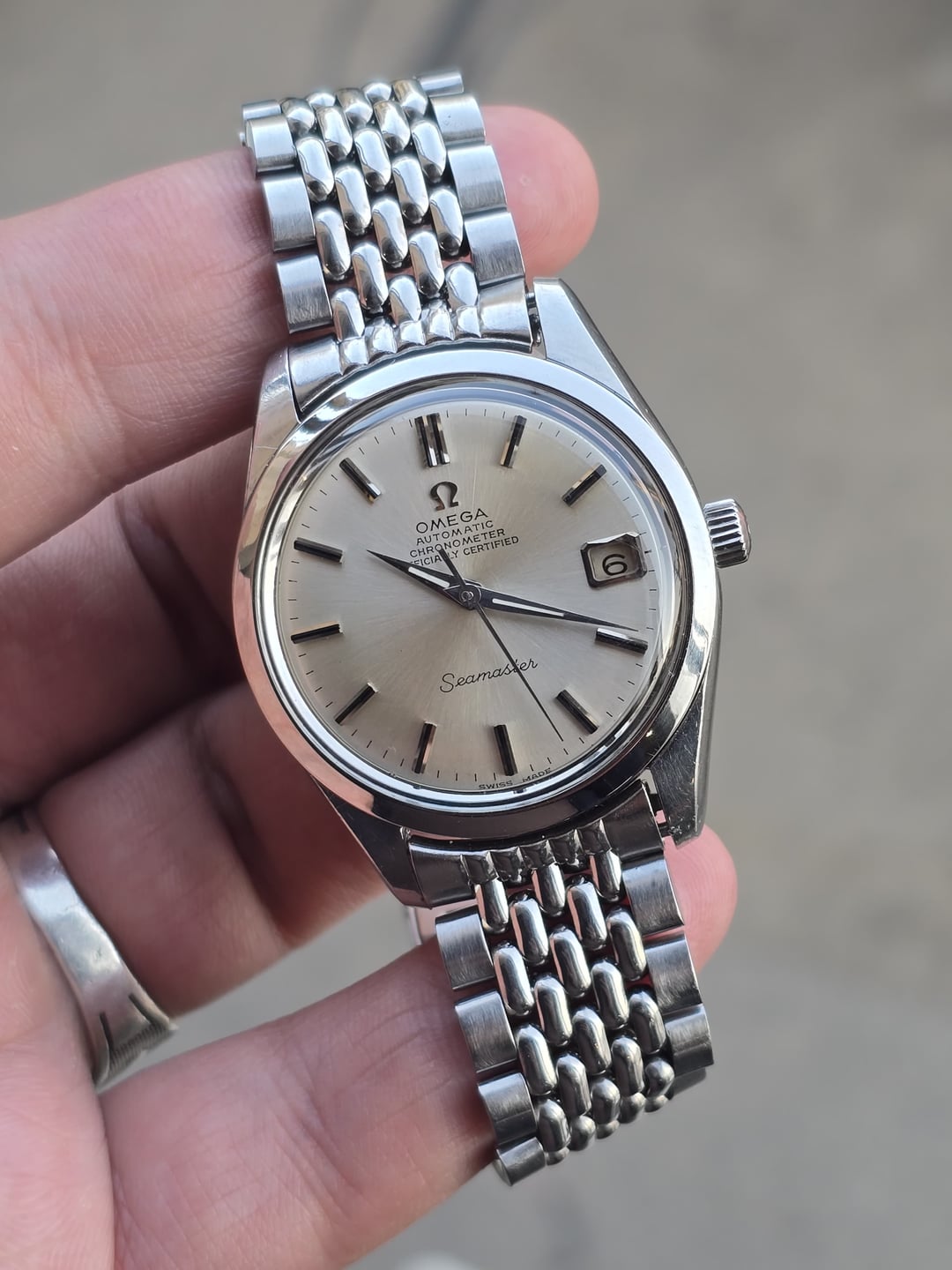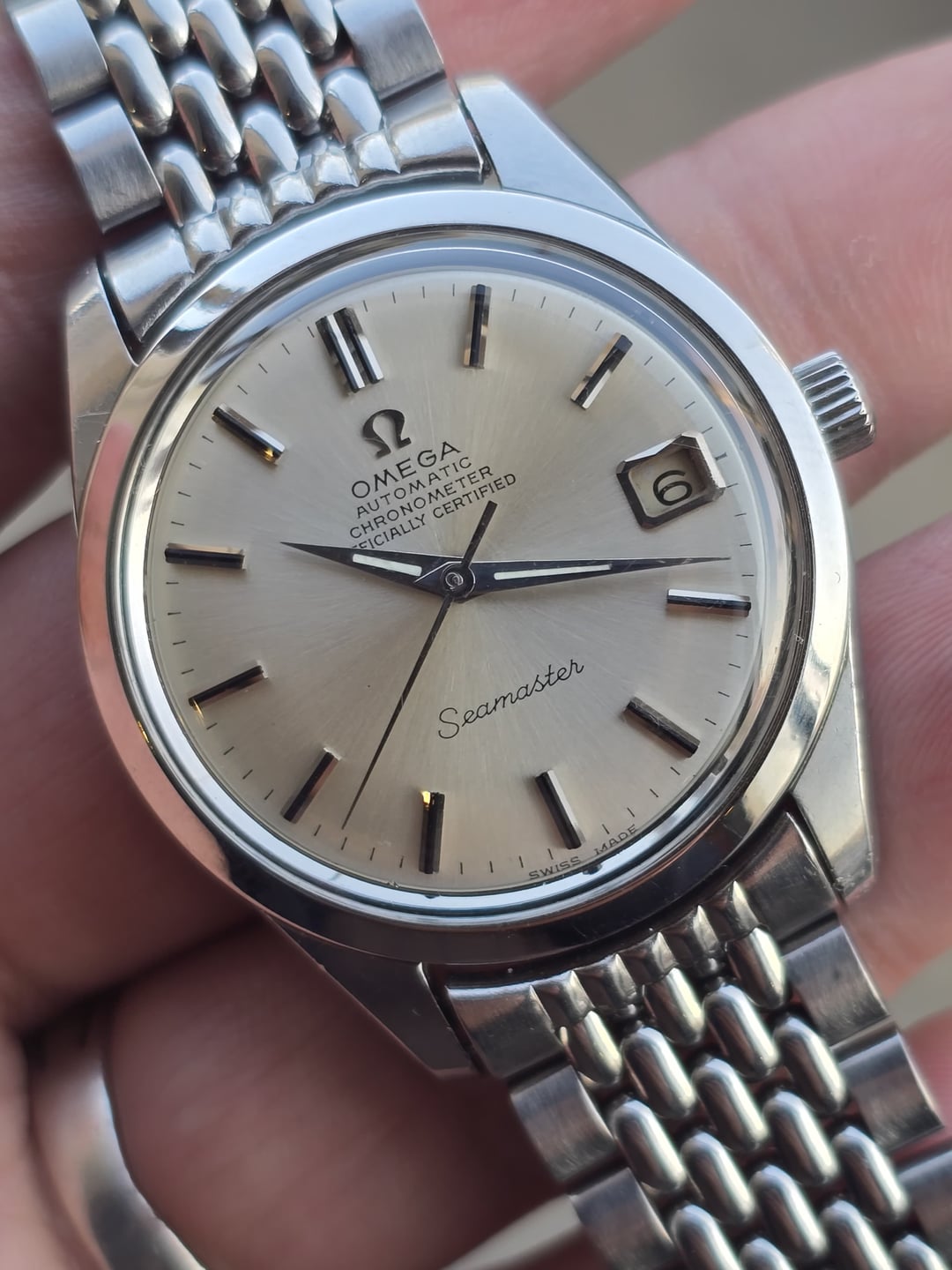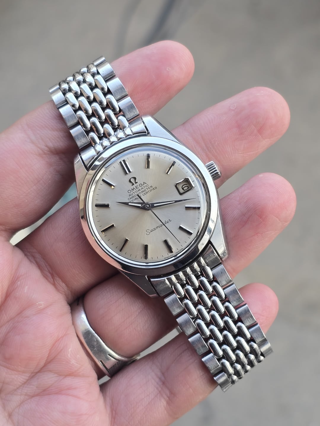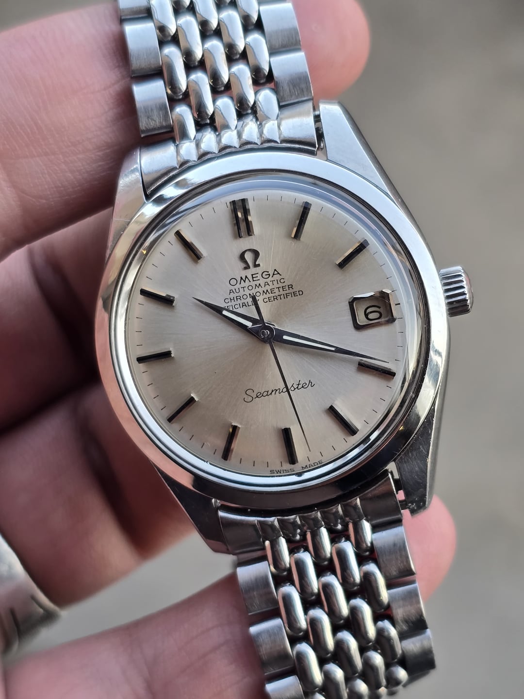 Up for sale is the Omega Seamaster Automatic Chronometer Officially Certified Ref 168.024 in great condition. Produced in 1968, The Omega Seamaster Ref. 168.024 is powered by in-house Caliber 564 COSC automatic movement.This example features a clean non-lume silver dial with beautiful sunburst. The 35mm stainless steel case (37mm including crown) retains its original bevels on the lugs and brushed finishing on the case sides. The Seamaster medallion on the screw-down caseback is crisp and well-defined. The dial, hands a applied markers are all superb mint in condition. The quick-set date function operates correctly. The watch is in great original condition, showing minor scratches on the case and caseback. Crystal is flawless with zero scratches, completely original with the omega logo in the middle. It comes fitted on OEM Omega bracelet. It doesn’t come with original box and papers. Price: $1300shipped flat shipping (via FedEx/DHL/USPS. Payment via PayPal F&F or Wise only. Crypto accepted(+1.5%) Not accepting trades. Please consider these Pictures as part of the description.