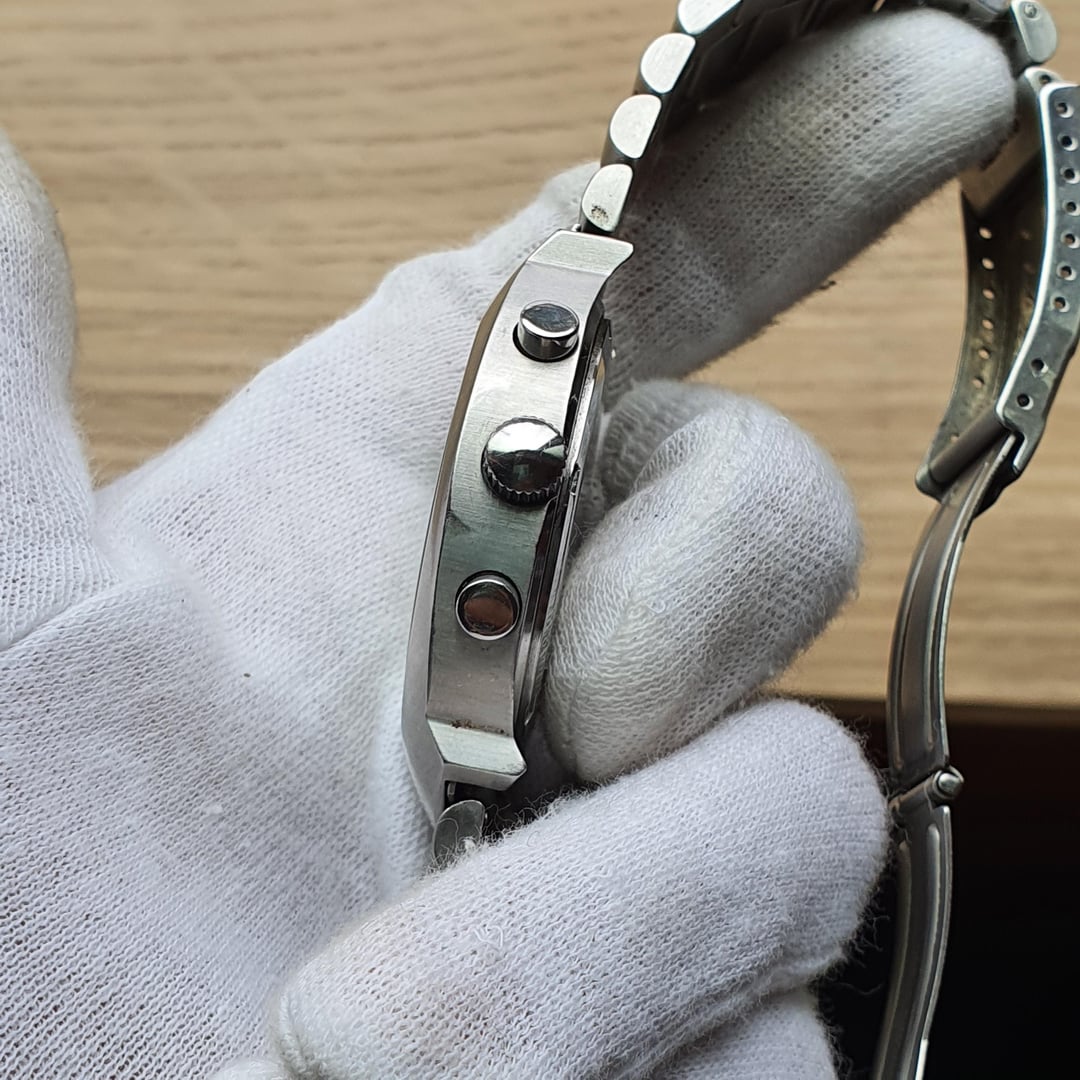 Hey WatchEx! For sale is this vintage Technos '70s-Style Chronograph. Technos was founded in Switzerland by Joseph Gunzinger and was trademarked in 1924 by his son when he took over the company. During the quartz crisis, like many Swiss brands, Technos found themselves in financial trouble and in 1970 the company was sold to General Watch Co. who transferred Technos to a new premises where they also integrated Certina in 1980. Japan was one of Technos' largest markets so in 1982 it was sold to its long-time Japanese importer, Heiwado & Co. This watch, reference number TGM690, was produced during Heiwado & Co ownership and made exclusively for the Japanese domestic market. Judging by the case back design, it points to a '90s release before the company and all its rights were sold again in 2002 to Technos Relógios S.A. who represented Technos watches since 1956 in Brazil, where Technos now thrives. The design looks like it was inspired by their own genuine Swiss-made 1970s chronograph ref.10767 and other '70s space-age chronographs. The dial has a retro, checkered minute track, evocative of racing. The monochrome hands are very much in the Seiko style from the mid '70s like the 6138-0020 or the 6139-7080. The orange chronograph hands pop nicely as the accent. The internal bezel is raised from the dial while the subdials have concentric circle texturing. The subdial on the right is a 24h dial. Due to the 40mm diameter, the stainless steel case has a lot of presence without being overbearing. I have a relatively small wrist at 6 inches as reference. The case features radial brushing and high-polish pushers and crown. The single domed crystal gives some nice vintage distortions at extreme angles. It houses the SII (Seiko) calibre VD54B movement that feels good when setting the time. All the time keeping and chronograph functions are working with no issues. The original stainless steel presidential-style bracelet has solid links and a secure double locking clasp that can accommodate up to roughly a 17.5cm wrist. The condition is great with minor general wear. Brand new battery installed. Looking for $220 net (buyer pays Paypal or Wise fee) + shipping Dimensions are: 40.2mm x 49mm x 11mm Lug Width 22mm (according to my callipers) Bought in Japan. \*Returns accepted but all return postage costs are the buyer's responsibility in all circumstances and any re-import fees that I have to pay when receiving the watch will be deducted from the refund amount.