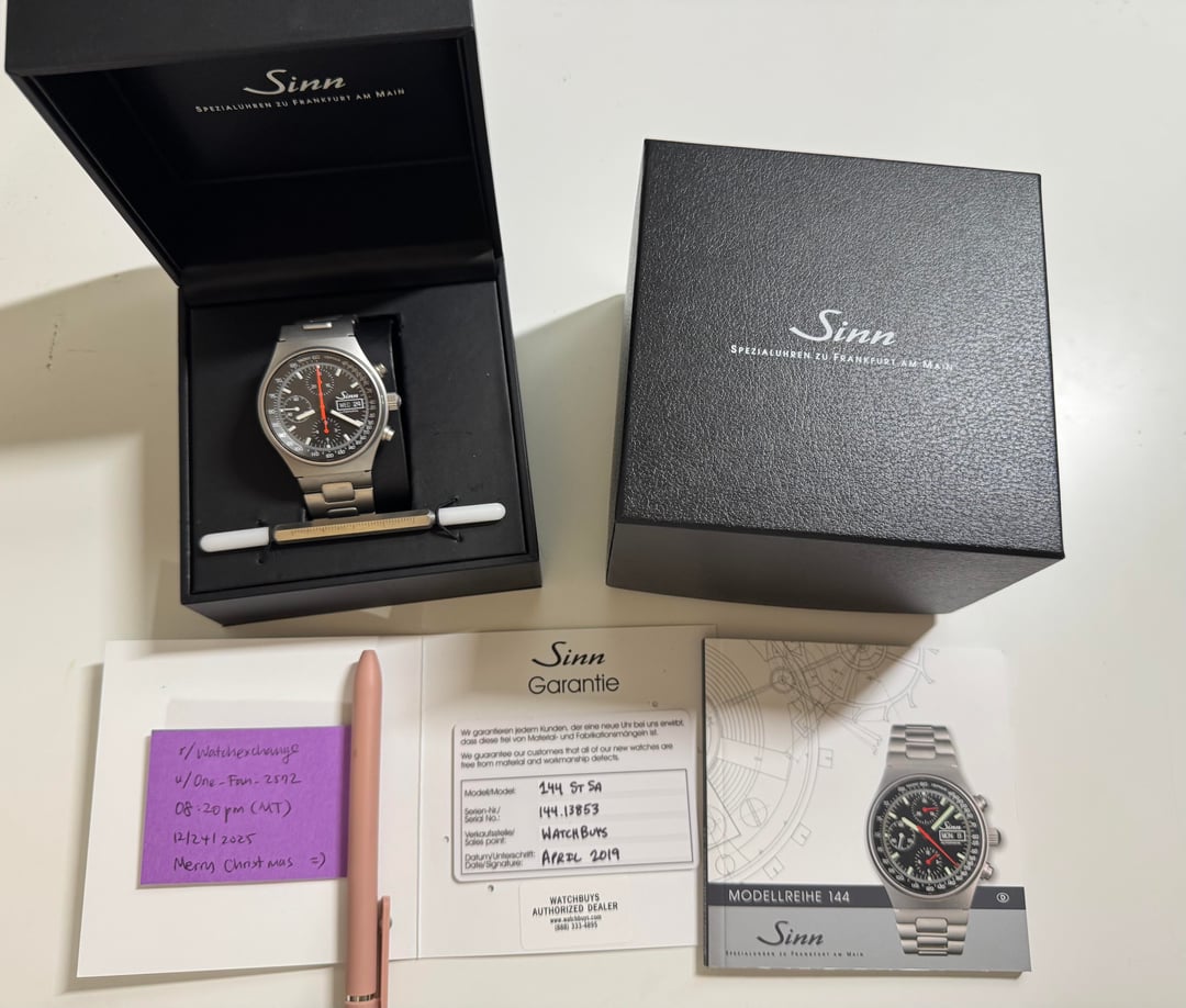 Hi Watchex, New Year Sale pricing on a **near-mint condition Sinn 144 St Sa**, a classic German pilot chronograph. This example is a **2019 full set** and has been very lightly worn. **Details** * Brand / Model: **Sinn 144 St Sa** * Year: **2019** * Condition: **Near mint / excellent** * Rate: +-3 s/d; AMP: 260-290 (depending on positions); B.E: 0.1ms; Beat: 28800 * Case size: **41mm** * Movement: Automatic chronograph (Valjoux 7750 base) * Crystal: Sapphire * Bezel: Bidirectional pilot bezel * Water resistance: 200m **Includes** * Watch * Inner & outer box * Warranty card / papers → **True full set** **Price** 💲 **$1,999 shipped** **Logistics / Payment** * 📍 Location: **TX** * 💳 Payment: **Zelle, Venmo, PayPal F&F** * 🚚 Shipping: CONUS, fully insured & tracked Photos, videos, and **timestamps available anytime upon request**. Feel free to reach out with any questions.