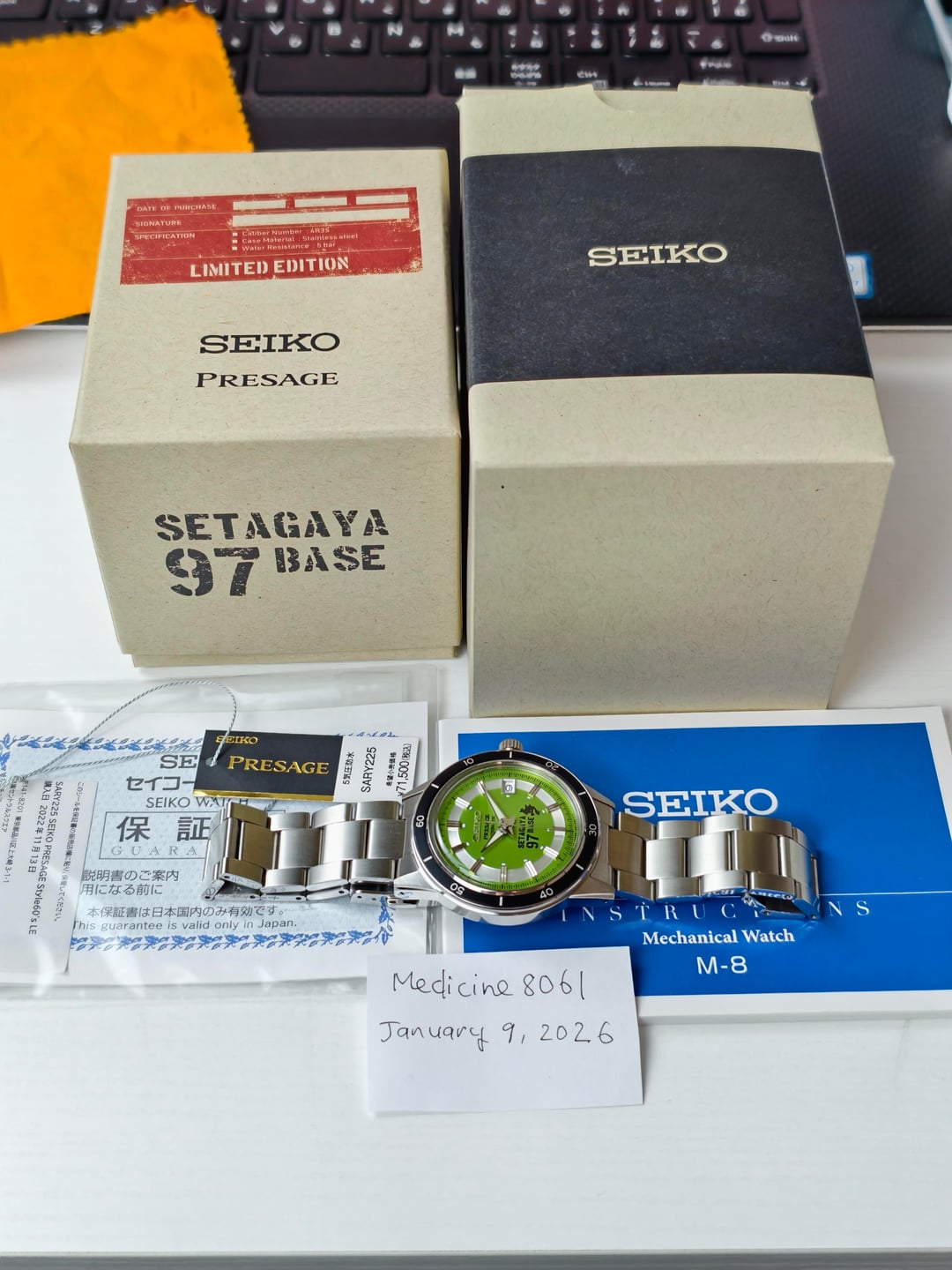 Up for sale is the Seiko Presage Style60’s SARY225 – Setagaya Base 97 Limited Edition, a rare Japan-only release with only 970 pieces worldwide. Condition: • Lightly used, excellent / near-mint condition • No noticeable scratches, very well cared for Included: • Full box set (outer box, inner box) • Warranty card & manual • Original hang tags • Bracelet sized, fits up to ~20cm wrist, all links included Specs: • Automatic movement: Seiko 4R35 • Power reserve: ~41 hours • Case size: 40.8mm • 316L stainless steel case & bracelet • Box-shaped crystal • Water resistance: 5 ATM A very unique Presage with a bold green dial inspired by the Setagaya Base 97 theme. Rarely seen for sale, especially in this condition and full set. 💰 Price • $800 USD • Shipping: $80 USD (international shipping from Japan) • Payment: PayPal F&F or PayPal G&S (+4–6% fee) 📦 Ships from Japan 📸 Timestamp & photos available – happy to provide more on request Feel free to DM if you have any questions. Thanks for looking!
