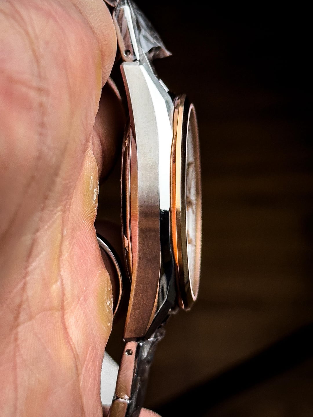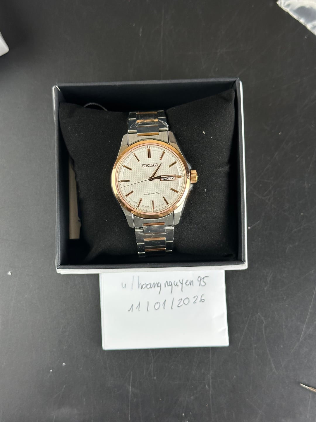 Up for sale is the Rose Gold Seiko Presage Waffle Dial on H-Link Bracelet Ref. SRP468J in mint condition Images: https://drive.google.com/drive/folders/1t77cee4fcBtOkOdxBAnXi0E9CDhsAo1u Video: https://drive.google.com/file/d/1DozcaVZNB5wREkH4G8xOqto7o9w4Uhi8/view?usp=drivesdk Timestamp: https://drive.google.com/file/d/1yxxbszahm1NIU3uXEITbi-5toN1IDWRa/view?usp=drivesdk This Seiko Presage Waffle Dial is part of the early Presage-era designs, before the line became heavily branded and standardized. It reflects a period when Seiko focused on texture, proportion, and everyday wearability rather than storytelling. The 40.5mm stainless steel case has a straightforward, slightly angular profile that wears comfortably on the wrist. The rose-gold waffle dial is the defining feature—warm in tone, deeply textured, and constantly changing with light. It’s paired with polished hands and applied markers that keep the dial legible without overpowering the surface. A day-date display sits at 3 o’clock, practical and well integrated into the layout. Inside is Seiko’s in-house caliber 4R36, an automatic movement with hacking and manual winding. It’s known for reliability, ease of service, and daily robustness rather than technical showmanship. The movement is visible through a see-through case back, reinforcing its role as a watch meant to be worn, not preserved. The watch is in mint condition with zero scratches and dents. Crystal is nice and clean, and dial is flawless. Watch is featured on OEM H-Link Bracelet with stickers and tag still intact. Watch comes with box, papers and tag. Price: $545 + $60 flat shipping (via DHL/UPS express - tariffs/duty fee covered). Payment via PayPal F&F or G&S (+4.6% fee covered by the buyer). Not accepting trades. Feel free to message me with any questions or if you're interested. Have a great day! Check out my other watches on Instagram: @jasonswatchcorner