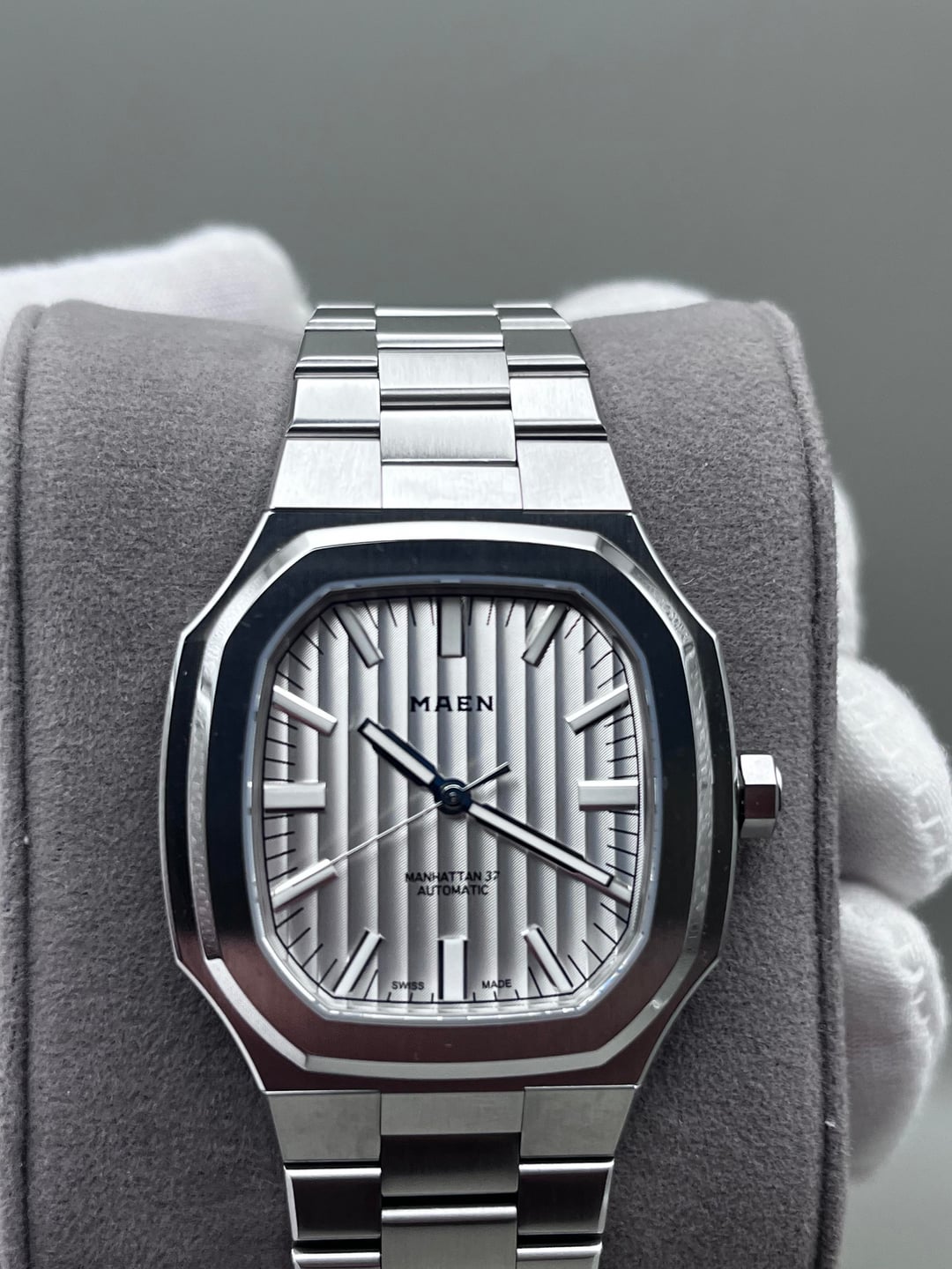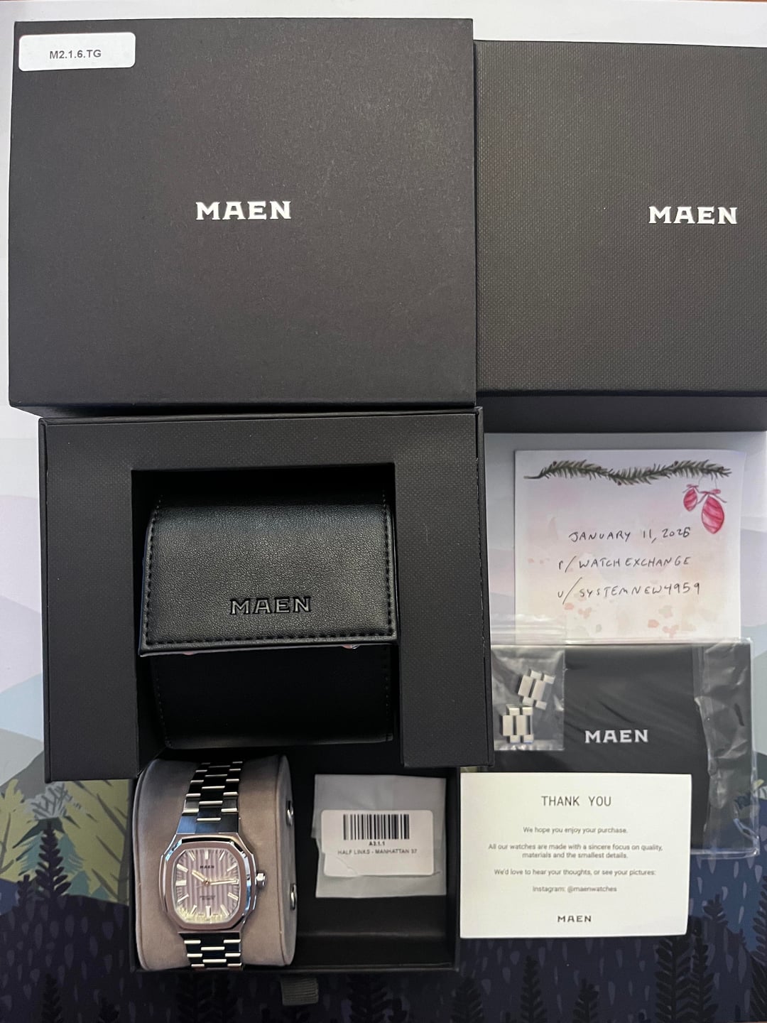 Hello r/Watchexchange, For sale is this outrageously gorgeous, top of the line, Swedish MAEN Manhattan 37mm M2.1.6.TG Top grade decorated Sellita SW200 movement watch. It is a challenge to describe this watch using typed words only. First of all, the brand MAEN is synonymous with quality, if you have never handled a MAEN you should definitely put it on your short list of watches to try. This brand punches way above their weight class and this Manhattan is their top of the line product. The design is the best part, somehow they managed to fit a fully decorated SW200 movement with exhibition caseback in a case with the total thickness of 9.3mm. The movement is regulated in 5 different positions to plus or minus 4 seconds per day. My next favorite part is the dial, the way this silver dial catches the light is crazy, it glistens and captures attention without being over the top flashy. The Manhattan 37 has an unique vertically elongated Côtes de Genève dial that creates a spectrum of beautiful shimmers depending on the lighting. And finally my last favorite feature worth mentioning is the fully integrated bracelet which would be a pleasure to wear. The Manhattan has an integrated stainless steel bracelet with hidden deployant clasp. The bracelet is connected to the case by means of four screws into the caseback. This small detail adds to the vintage character of the watch. This watch retails on the MAEN site for for $1,407 + tax + import fees = total would be close to $1700 all in This particular watch is beautiful, it is truly like new functioning perfectly. The pictures speak for themselves. Very few if any blemishes, truthfully I could not find any but this is a used watch after all, only worn a handful of times. The lucky buyer will have the full kit to open. Maen watches have some of the best presentations when opening a new watch and you will have the same experience because this has everything as if it were brand new. Comes with various half links to get the perfect fit . Price: $1150 firm including priority shipping anywhere in the US Shipping: Included USPS priority shipping anywhere in the US, insurance and other options are responsibility of buyer. Shipping from Central FL and watches are always packed with love and care. Payments accepted: Zelle is highly preferred. (PayPal FF, PayPal GS + 3.5%, Venmo, Apple Pay are reserved for forum members with enough registered transactions at my discretion) Please comment before sending a private message (PM). Happy to provide additional photos or a video call for serious buyers. Check my for profile for transaction history and other watches for sale. Thank you for your consideration, look forward to assisting you u/systemnew4959