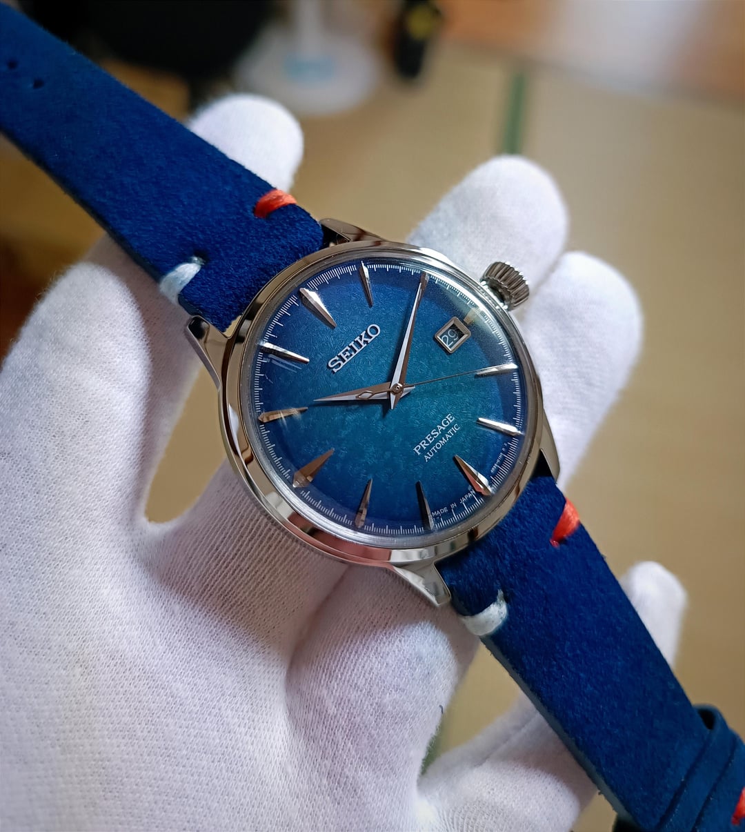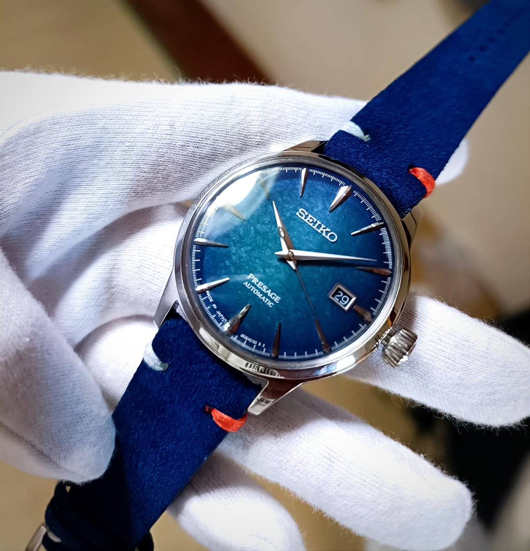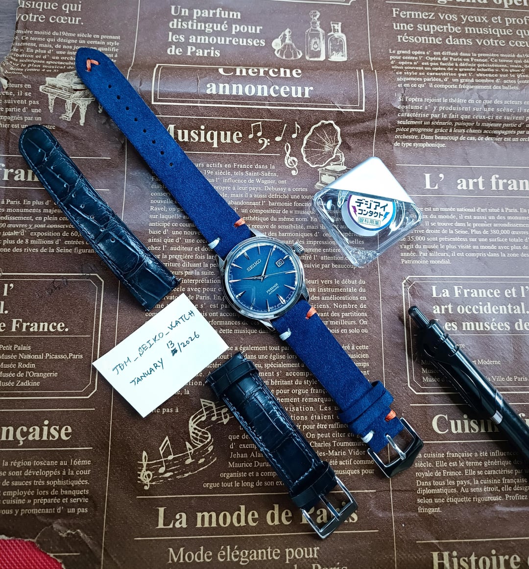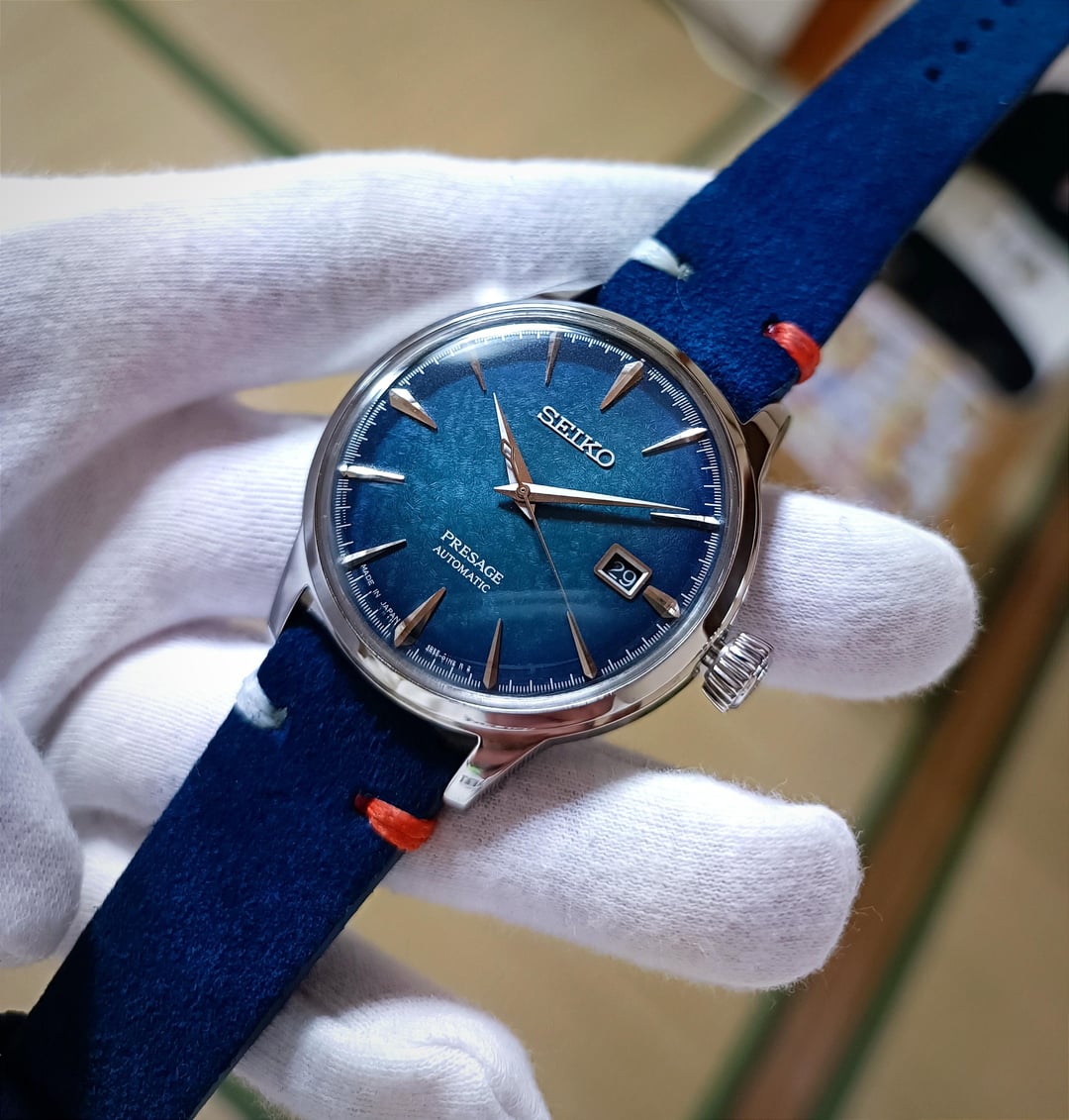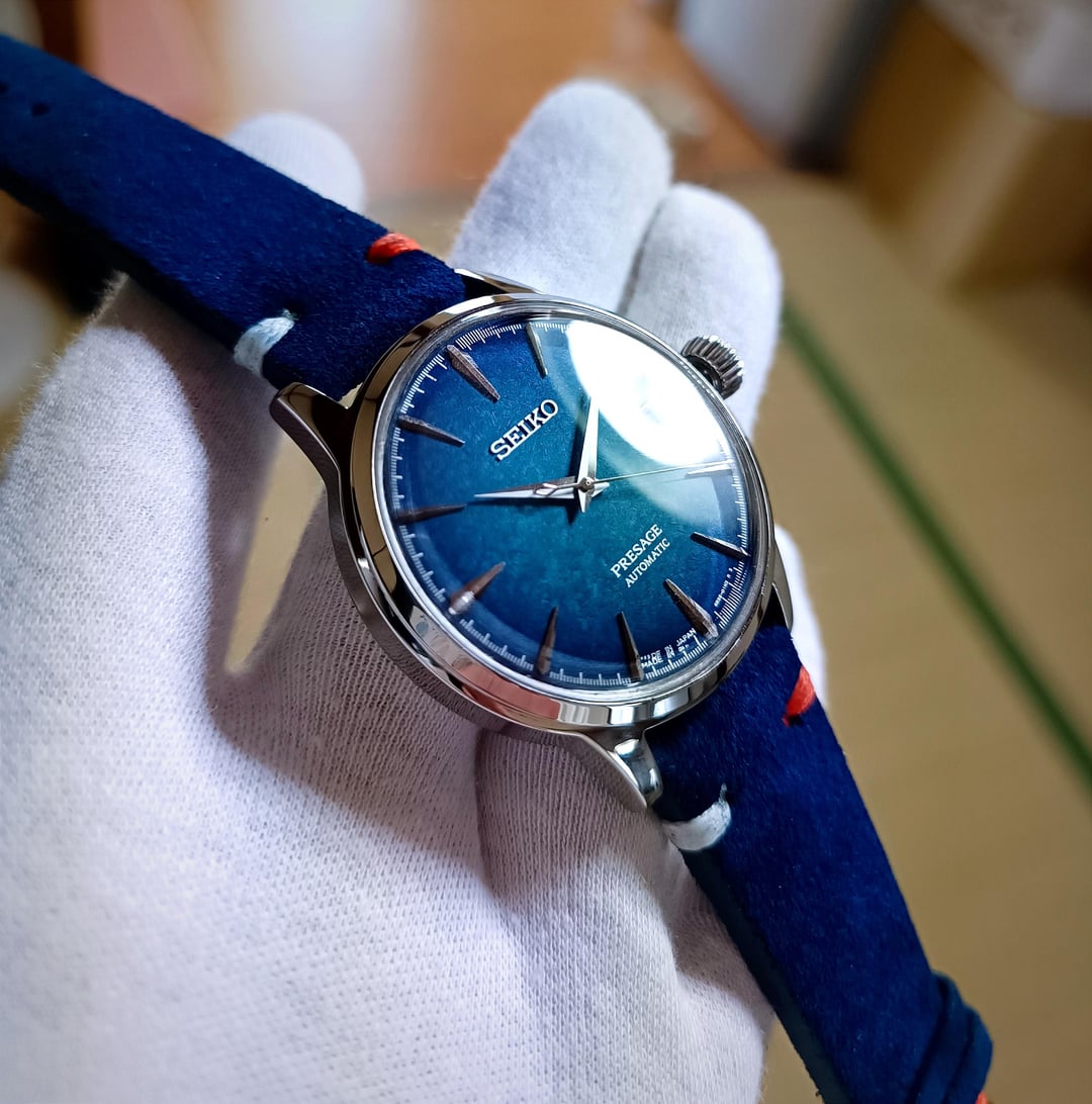 Hello r/WatchExchange, I'm letting go of a Seiko Presage SARY085 Starlight Cocktail Time Star Bar JDM – Limited to only 1,300 pieces, in excellent condition. The watch comes on a blue suede-style leather strap, and I will include an extra dark blue calf leather strap as a gift. This piece is highly collectible, inspired by the original "Starlight" cocktail created at Star Bar Ginza, a place closely tied to Seiko and Japanese cocktail culture. Condition Recently fully serviced, running great. Overall condition is excellent. Specs Case diameter: 40mm Lug width: 20mm Movement: Seiko 4R35 with 41-hour power reserve Dial: Starlight Cocktail inspired, signature Cocktail Time texture and shine. Crystal: Curved Hardlex – clean and clear. Strap: Blue leather strap matching the dial tone + extra dark blue calf strap included. A rare and hard-to-find piece — perfect for collectors or daily elegant wear. What’s included Watch + extra leather strap. 📸 Photos / Timestamp: included in the post! Price, Payment & Shipping Price: $925 USD (shipping not included) – no trades. Payment: PayPal F&F or G&S (+4.6% fee). Shipping: FedEx Express worldwide, approx. 2–4 days ($50–$80 depending on destination). Feel free to ask me any questions! Thanks for looking!