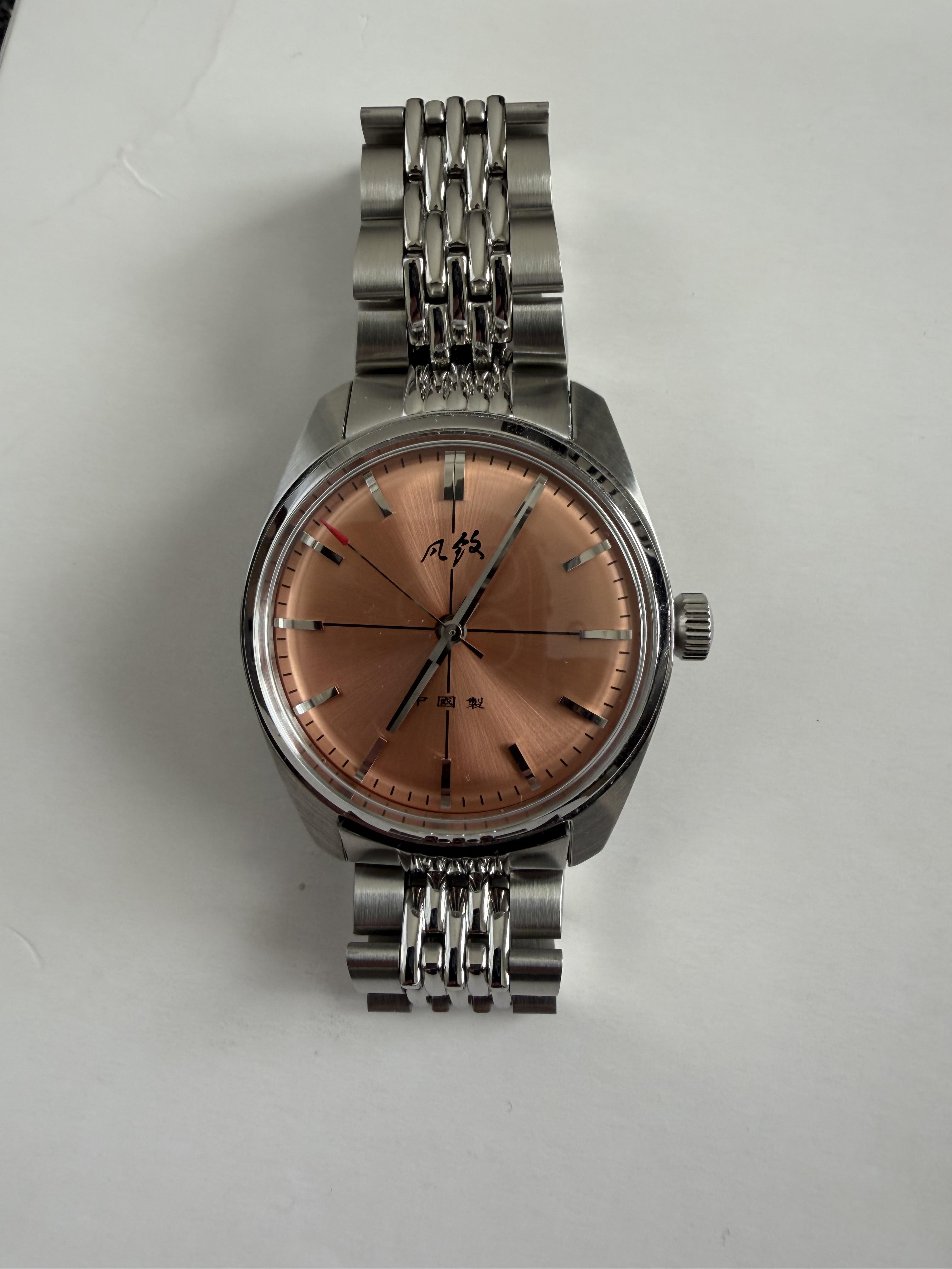 For sale is a Merkur salmon dial watch. This one is pretty neat and I’ve found it to go constantly in and out of stock, especially with the bracelet. The watch is in excellent condition and includes the original beads of rice bracelet with extra links. Here are the details: Case: Stainless Steel, 40mm Crystal: Sapphire Lug width: 20mm Strap: Merkur beads of rice Dial: Salmon with crosshairs pattern and red-tipped second hand. Movement: Automatic Caseback: Stainless steel with engraving Pics: https://imgur.com/a/merkur-salmon-QuytxA2 Timestamp: https://imgur.com/a/merkur-salmon-timestamp-qpF80RI I've sold on here a bunch. I’ve had a few transactions recently since the policy changes, but here are some reviews from when r/watchexchangefeedback was still a thing. My Reddit r/Watchexchange Seller Feedback: https://www.reddit.com/r/WatchExchangeFeedback/comments/eq5hek/uform_and_malcontent_is_the_bees_knees/ https://www.reddit.com/r/WatchExchangeFeedback/comments/9kkquy/uform_and_malcontent_great_seller/ https://www.reddit.com/r/WatchExchangeFeedback/comments/bu8yp2/extra_thanks_to_form_and_malcontent_for_being_a/ https://www.reddit.com/r/WatchExchangeFeedback/comments/b2oqg7/uform_and_malcontent_is_a_great_seller/ **Asking $90 or best offer** Shipping to CONUS only, please. I'll cover the cost. Add 3% for PayPal G&S fees unless you're comfortable with PayPal F&F or Venmo. Feel free to reach out with any other questions!
