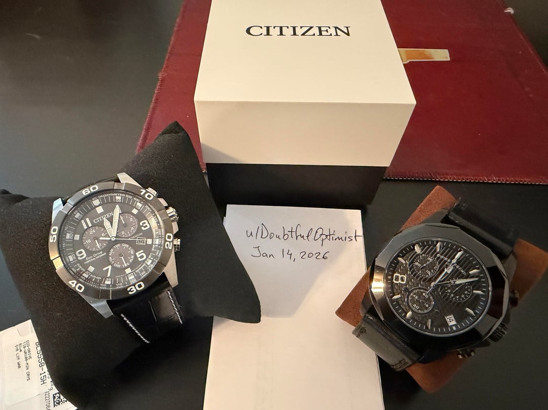 Hi WatchEx, I have for sale two watches. Citizen Brycen - this watch features a light titanium case, eco-drive solar movement, chronograph, perpetual calendar (date automatically adjusts accounting for month lengths and leap years until 2100!), tachymeter and alarm. New condition. Swiss Legend - this watch includes a chronograph function, date complication, sapphire crystal and screw-down crown. The watch is not new, but is in excellent condition! Asking $320 shipped to CONUS for both. Please feel free reach out with any questions or to request additional photos. Thank you!