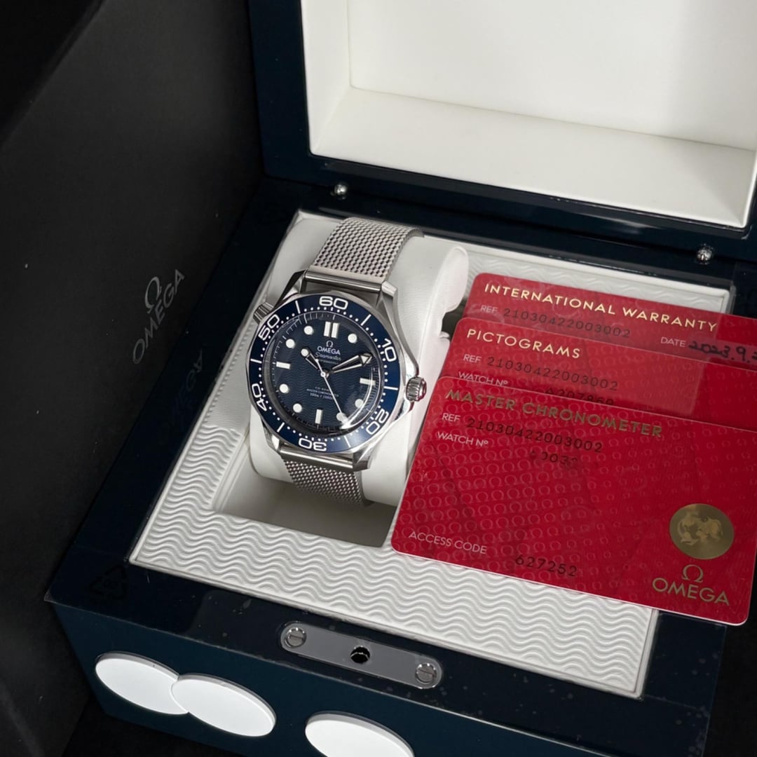 2023 OMEGA SEAMASTER JAMES BOND 60TH ANNIVERSARY 210.30.42.20.03.002 42mm stainless steel diver with blue ceramic wave dial, Co-Axial Master Chronometer movement, and 300m water resistance—an iconic modern tool watch with timeless style. PRICE $6799 +FREE SHIPPING MSRP $9400 $1000 BELOW LOWEST EBAY COMP $700 BELOW LOWEST C24 COMP IF YOU HAVE EVER BEEN INTERESTED IN THIS WATCH NO BETTER DEAL! CONDITION - Pre Owned - Cosmetic Condition: 9/10 excellent pre owned condition. Light wear on clasp. Reference pictures - Functionality: Fully functional. Timegrapher on request - Bracelet: Stainless mesh FEATURES - Warranty card: 9/2023 - Case Size: 42mm - Movement: Calibre 8806 - Power Reserve: 55 Hours - Case Material: Stainless - Bezel: Blue uni-directional - Dial Color: Blue - Crystal: Sapphire - Water Resistance: 300M - Current MSRP: $9400 INCLUDES: - [x] Outer Presentation Box - [x] Inner Presentation Box - [x] International Warranty Card - [x] Pictograms Card - [x] Master Chronometer Card - [x] Instruction Manual TRADES WELCOME! FULL SETS GOOD CONDITION ONLY CREDIT CARDS ACCEPTED PERFECT REVIEWS ON GOOGLE/EBAY CHECK US OUT @ CHARISWATCHES.COM