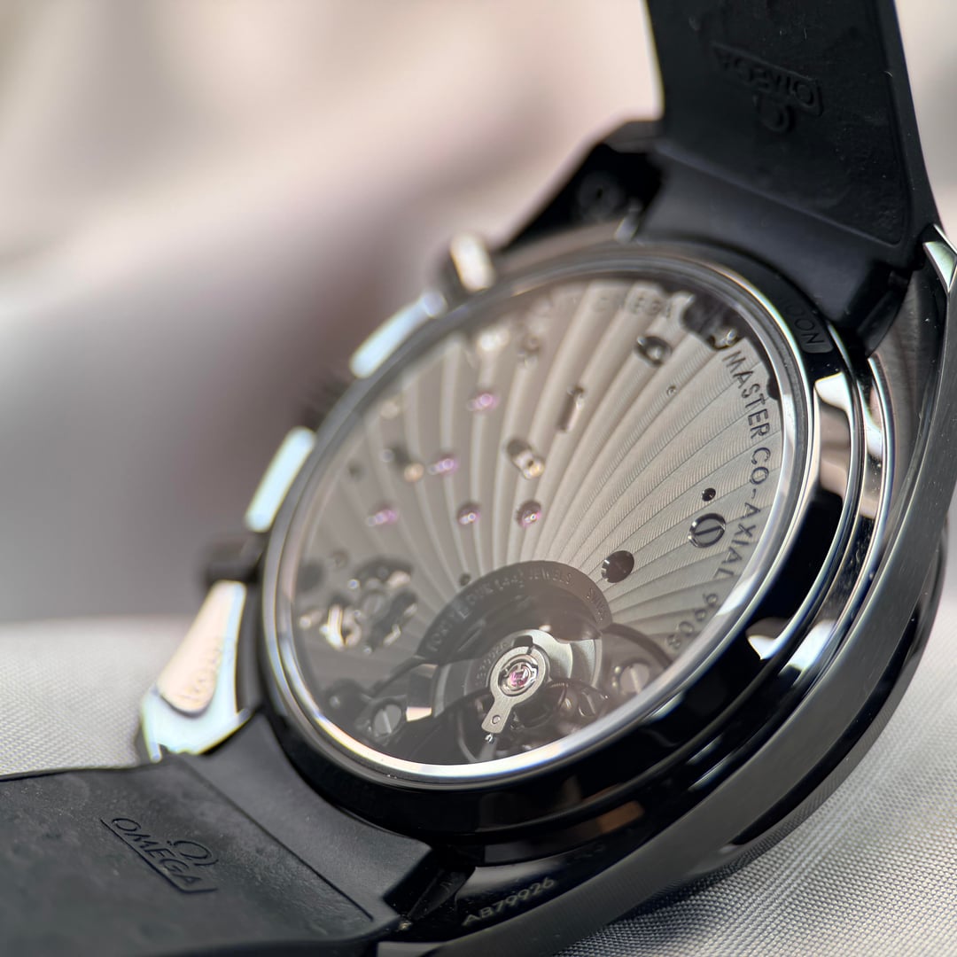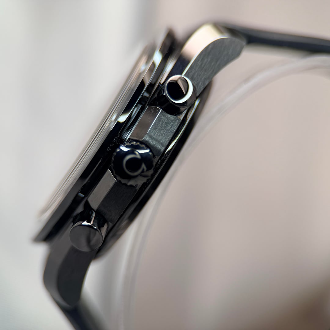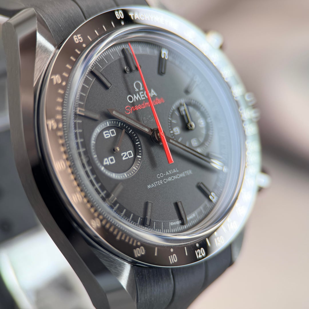 OMEGA Speedmaster “Dark Side of the Moon” Co-Axial Master Chronometer Chronograph Ref. 310.92.44.51.01.001 Condition: Excellent Year: 2025 Case Size: 44.25 mm Set: Full set (box, papers, 5 year warranty) Price : $11750 A modern icon that blends OMEGA’s space-faring heritage with advanced materials, the Speedmaster Dark Side of the Moon is crafted entirely in black ceramic, offering exceptional scratch resistance, lightweight wearability, and a bold, technical presence on the wrist. The polished and brushed 44.25 mm black ceramic case is paired with a matching ceramic bezel featuring a Liquidmetal™ tachymeter scale, ensuring permanent contrast and long-term durability. Beneath the sapphire crystal sits a laser sand-blasted black ceramic dial, highlighted by a red-lacquered central chronograph hand for striking visual contrast. The dial layout features: - Small seconds at 9 o’clock - 60-minute and 12-hour chronograph counters at 3 o’clock - Blackened hands and applied indexes filled with black Super-LumiNova (green emission) Powering the watch is OMEGA’s manual-winding Co-Axial Master Chronometer Calibre 9908, visible through the sapphire caseback and finished in a distinctive black edition. This movement is METAS-certified, resistant to magnetic fields up to 15,000 gauss, and represents the highest modern standard of precision, performance, and reliability. The watch is fitted to its original black rubber strap with a lunar-surface pattern on the underside, secured by a ceramic foldover clasp with ceramised titanium folding mechanism. --- ### Highlights - Full black ceramic case & bezel - Liquidmetal™ tachymeter scale - Manual-wind Master Chronometer Cal. 9908 - 15,000-gauss anti-magnetic resistance - Iconic Dark Side of the Moon Speedmaster - 2025 full set in excellent condition A striking and technically advanced Speedmaster that stands apart from traditional steel references—modern, stealthy, and unmistakably OMEGA.