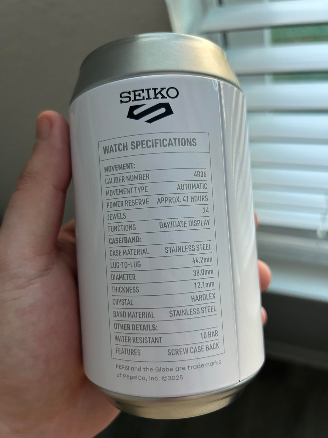 Hello everyone! Here I have a cool collab between Seiko and Pepsi to actually put the brand to the style for once! They also did a good job on the packaging as it comes in a cool Pepsi can with the specs as the nutrition label! As stated these are limited pieces numbered to only 7000. This one is in mint condition as all I did was size it. And comes with the full kit. Price and payment: This watch is priced at $415 shipped within the continental US. Payment via PayPal FF or Zelle. As I always state, I completely understand that there has been a noticeable rise in scammers within this community lately. I will do my best to make sure you feel as comfortable as possible doing business with me! Please refer to my feedback as well. Thanks for taking a look!